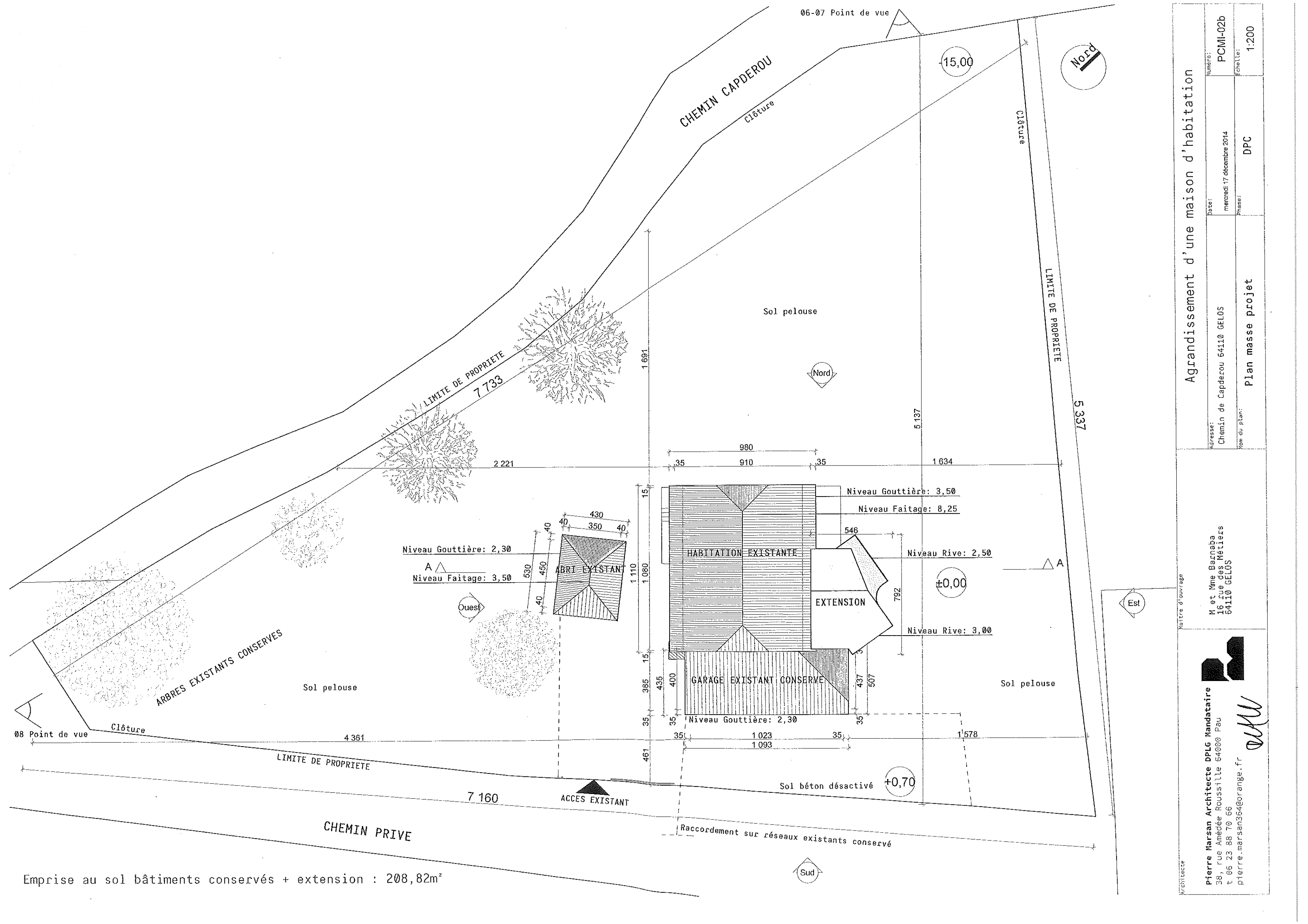 Le terrain de forme triangulaire descend en pente vers sa pointe nord. La maison existante occupe une position centrale. Le volume de l’extension vient agrandir l’espace séjour. Ouvert à l’est sur la vue panoramique des Pyrénées, il capte la luminosité. Ce volume est prolongé au Nord par une fenêtre en épaisseur, ouverte sur le paysage environnant : coteaux boisés, vallée Heureuse et façade urbaine de la ville de Pau. Une paroie courbe accorde les diférentes orientations en protégeant le séjour du vis à vis des vues directes sur les maisons mitoyennes.