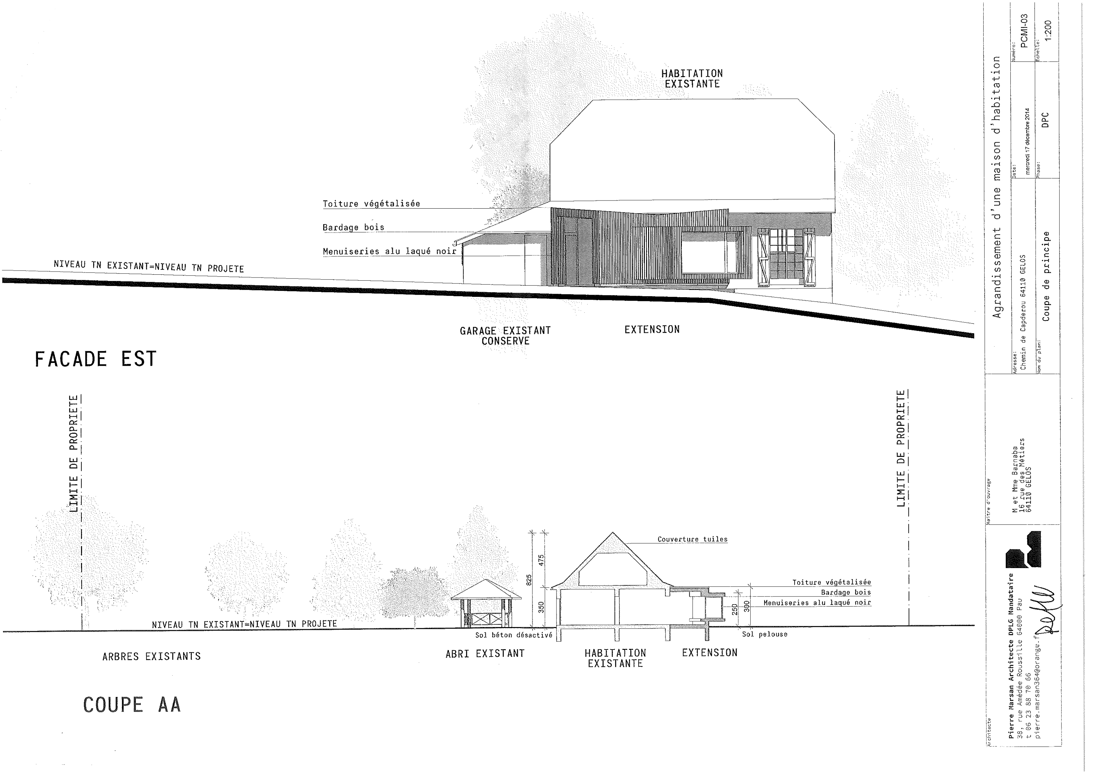 Approche environnementale : Pour limiter son empreinte sur le terrain, l’extension prend appui sur les éléments maçonnés existants de la terrasse et se prolonge en porte-à-faux sur les espaces végétalisés. La structure des volumes est en ossature bois formant des voiles, désaxés des lignes de construction de la maison, pour s’ouvrir au delà des volumes construits. La couverture est une terrasse végétalisée. Les parois sont habillées de bardage bois.