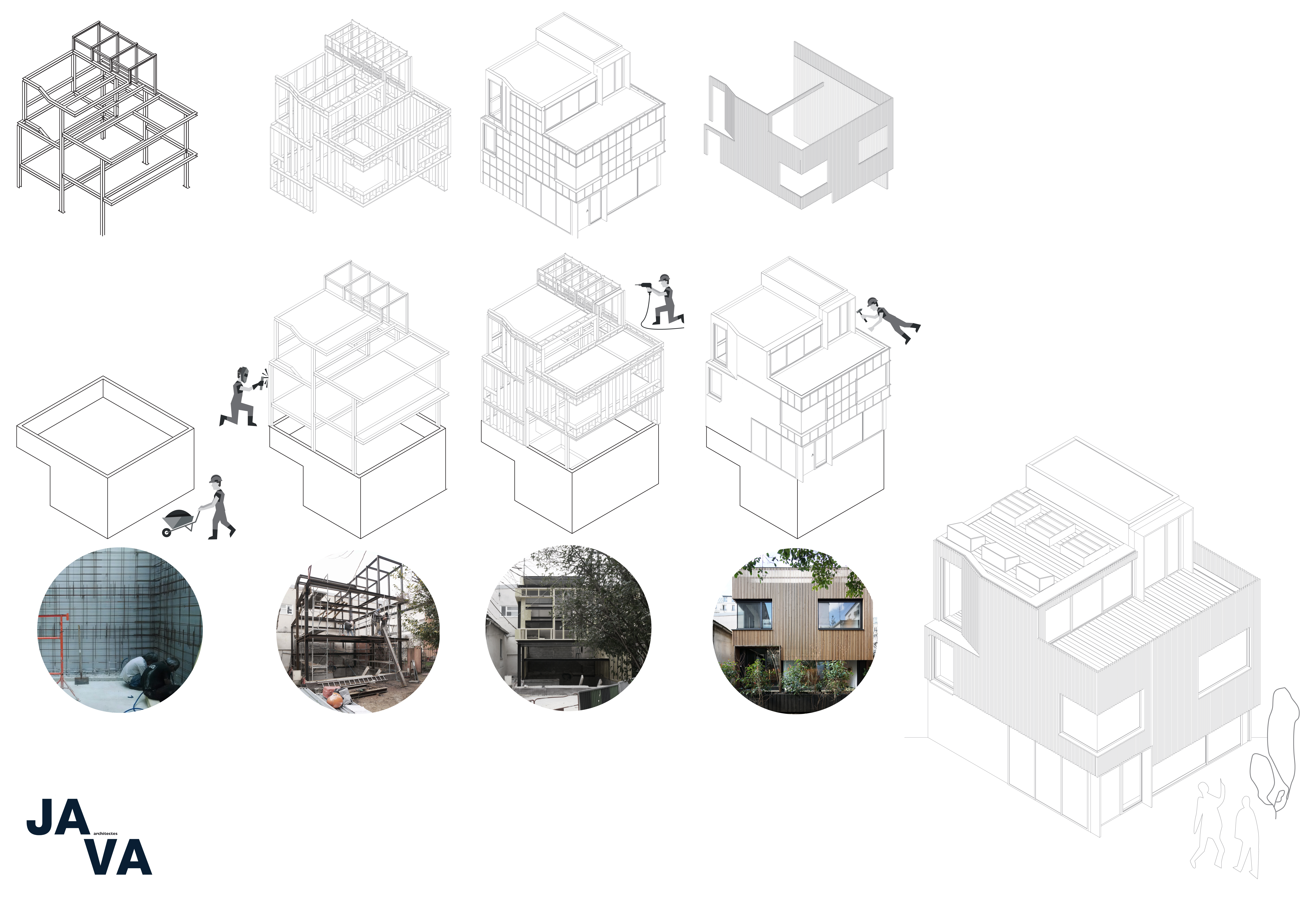 En cœur d’îlot, une maison contemporaine en bois d’aspect compact cache un jeu complexe d’espaces intérieurs. L’utilisation d’une structure métal bois permet de créer 6 plateaux accueillant les différents usages d’une maison. Ces espaces de vie sont flexibles, généreusement éclairés et tous pensés en fonction d’un caractère spécifique. Ainsi chaque pallier est une invitation à découvrir un univers singulier, du plus intime au plus ouvert. Contraint par une surface au sol de 37m2 le projet se développe sur plusieurs demi-niveaux, l’espace du salon est semi-enterré.