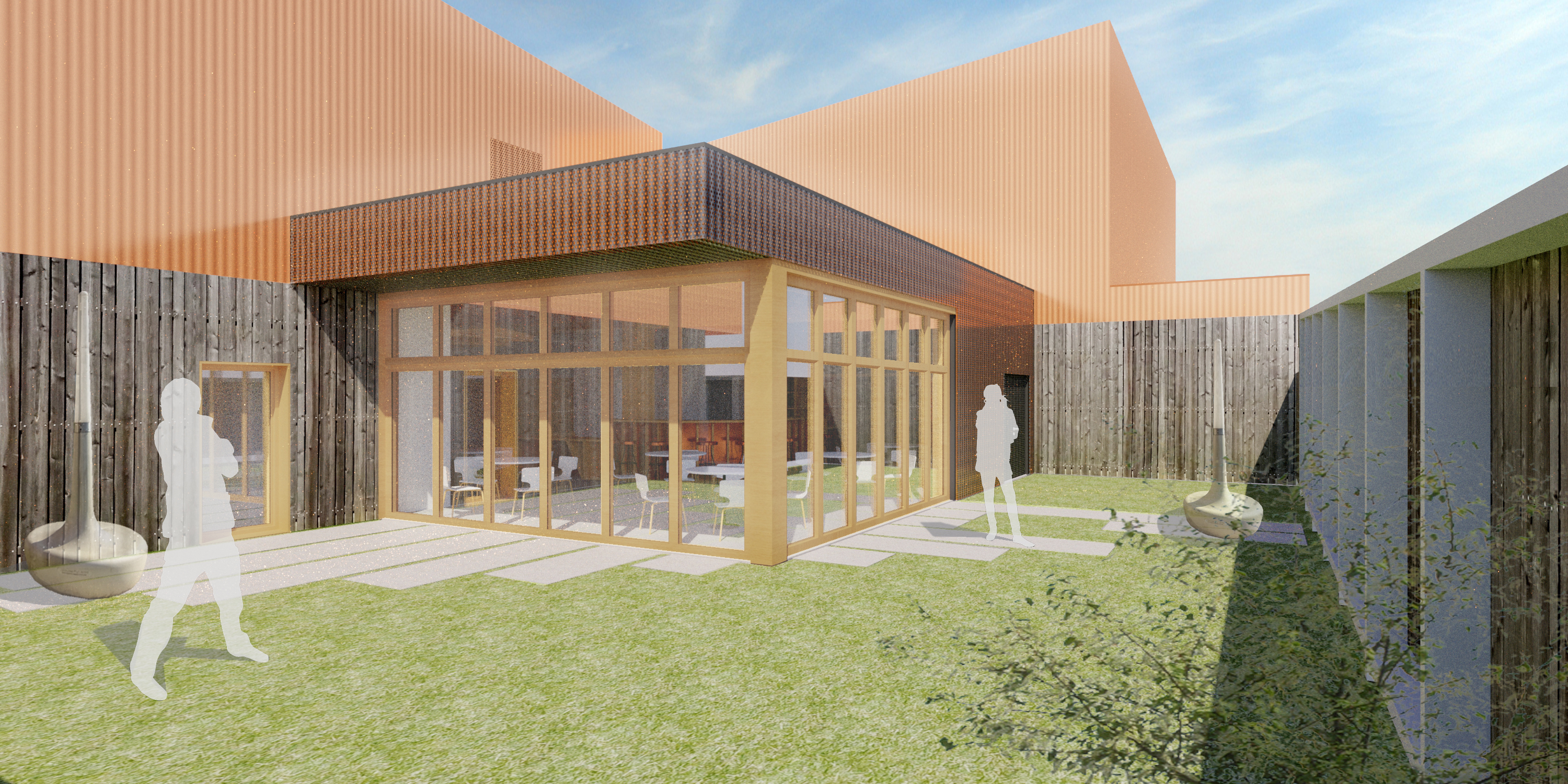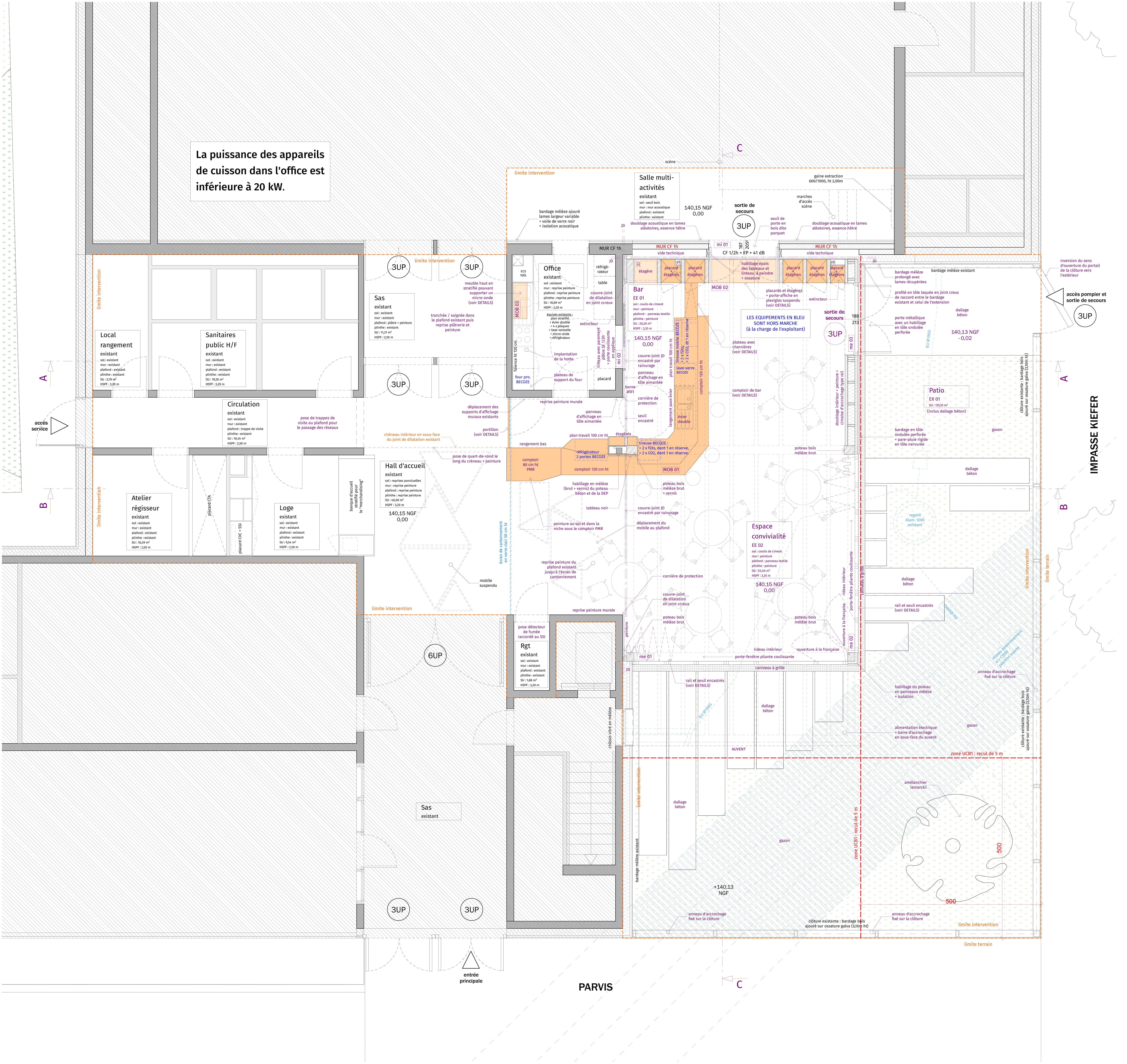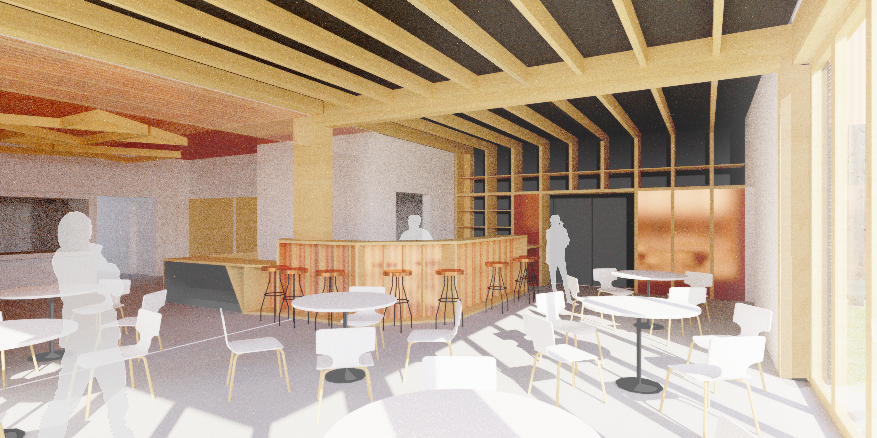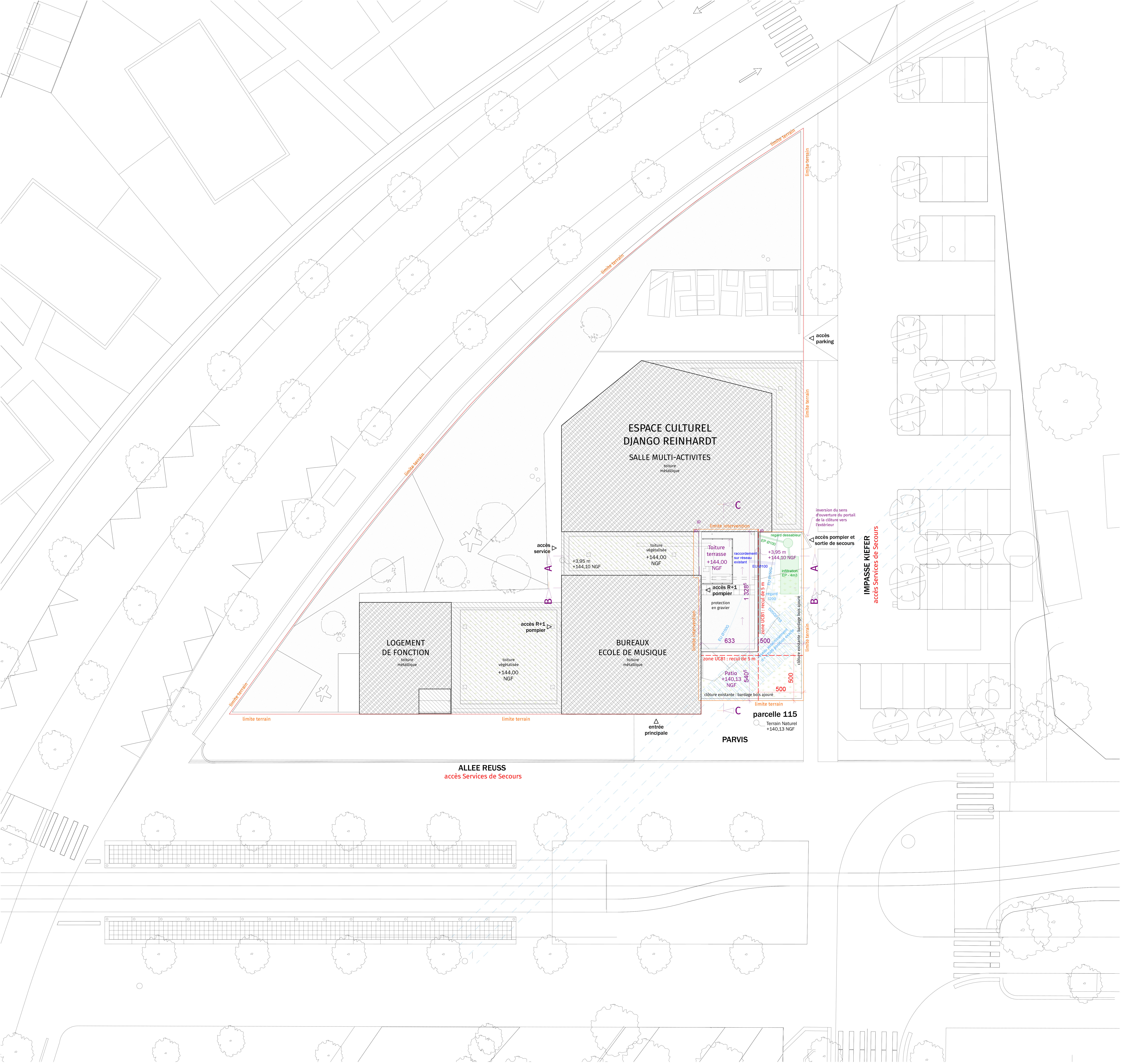 Le projet consiste à la construction d’un espace de convivialité, en extension du hall de l’Espace Culturel Django Reinhardt. Il s’inscrit dans une belle continuité architecturale en réinterprétant la volumétrie et la matérialité du bâtiment existant. La façade métallique perforée change de couleur et d’aspect suivant l’angle. Les châssis vitrés pliants et coulissants ouvrent l’espace sur le patio. La charpente bois reste apparente et participe à l’aménagement intérieur. Un comptoir de bar en bois se positionne en pivot esthétique et fonctionnel entre le hall et l’extension.