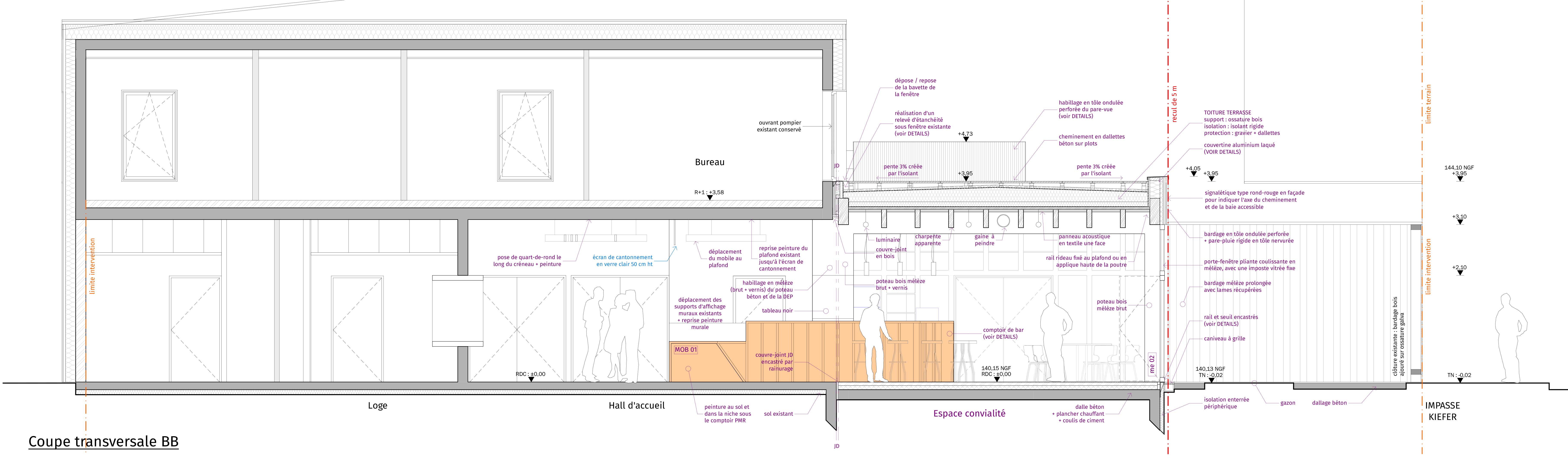 Approche environnementale : Le projet a été pensé et réalisé en bois afin de favoriser la filière sèche ainsi qu'un chantier propre et de courte durée. La charpente bois,très présente à l'intérieur, se retourne pour venir créer des espaces de rangements intérieurs et pour créer une trame régulière en façade.