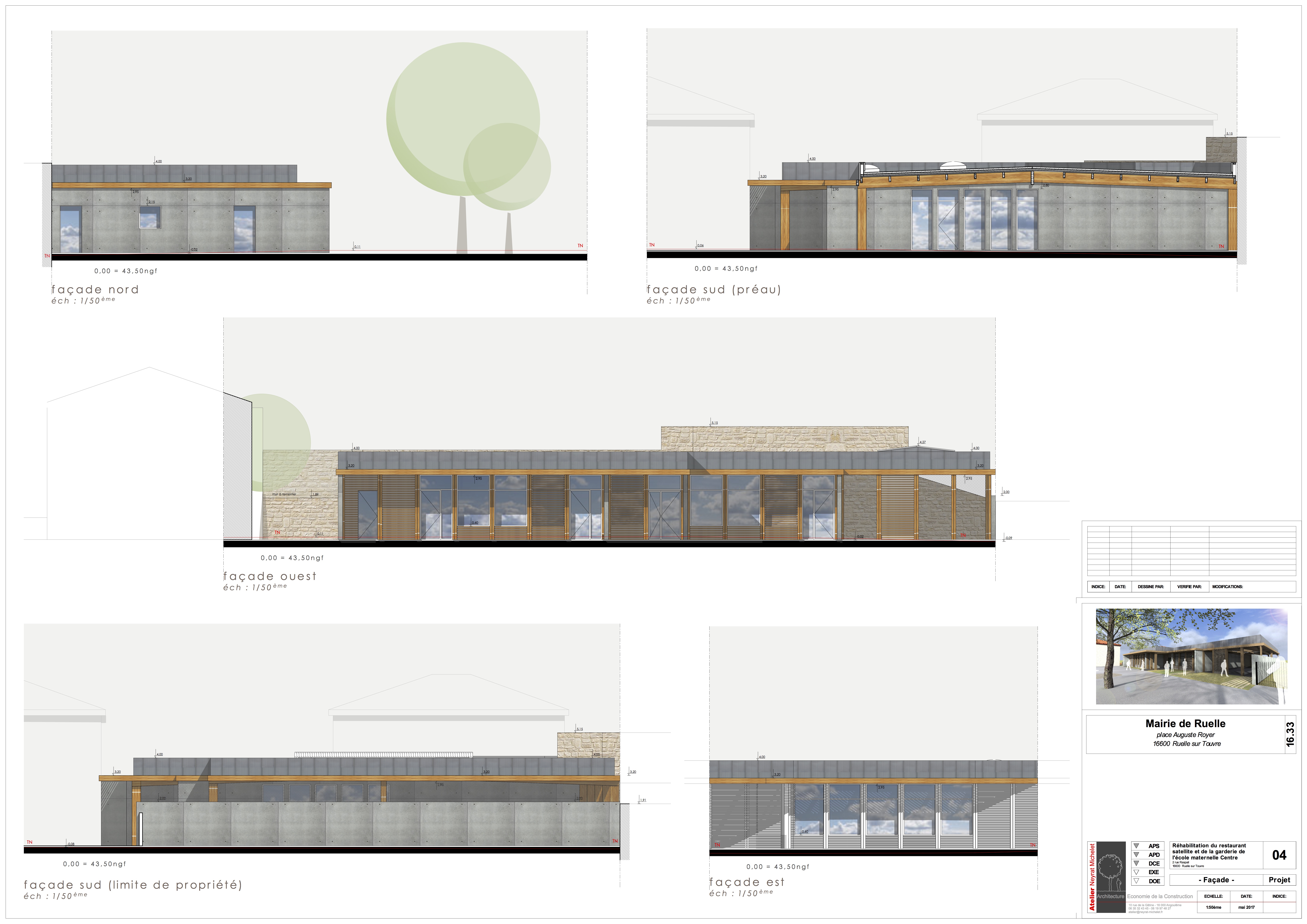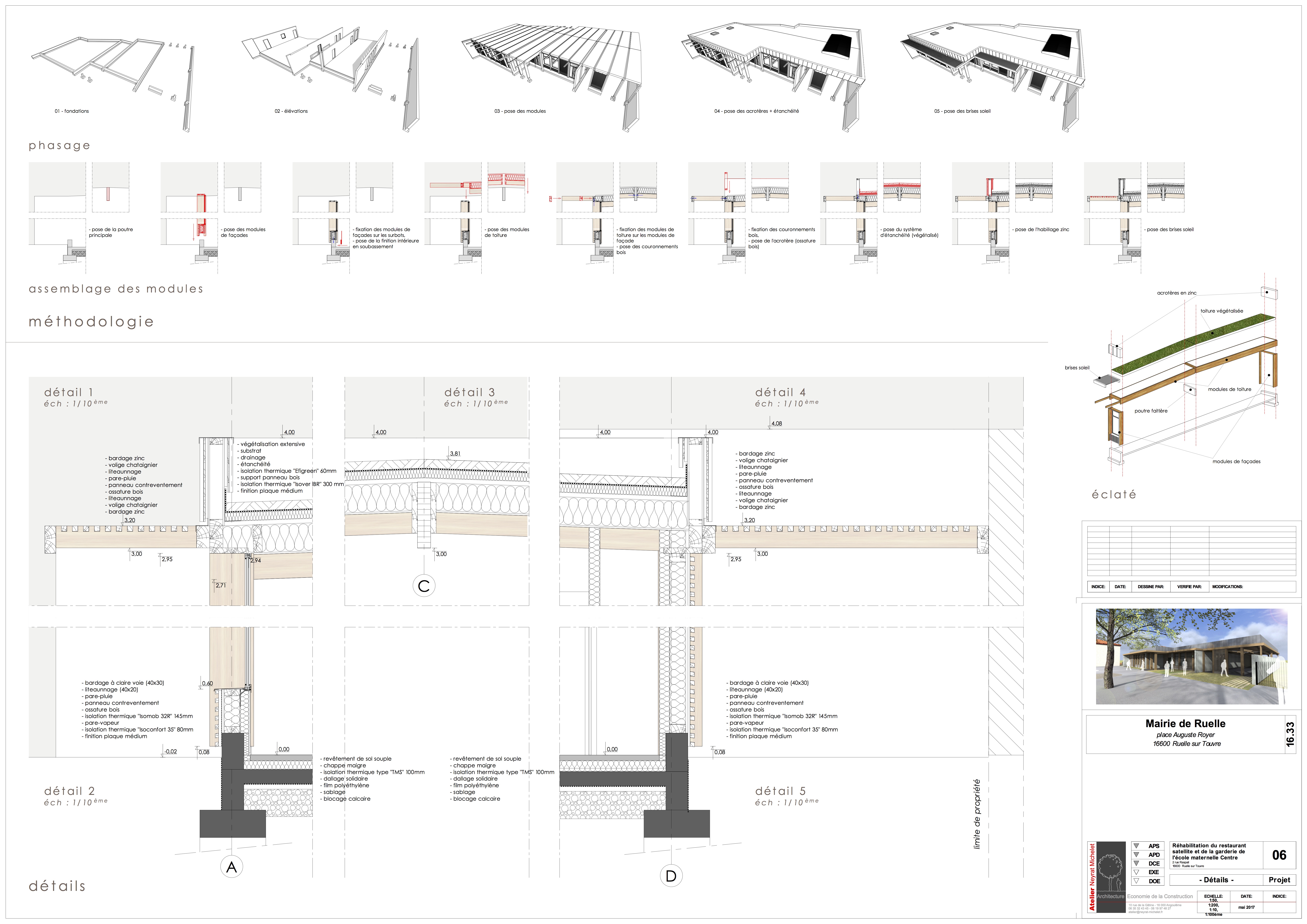 Descriptif technique : Un ensemble de murs en béton banché, avec une finition lasurée vient structurer le bâtiment et séparer les différents espaces. Entre ces murs principaux, viennent prendre place des modules préfabriqués en ossature bois, le tout couvert par un couronnement bois surmonté d'un acrotère bardé en zinc . La structuration des modules en bois répond au calepinage des façades de l'école. La couverture est végétalisée. Les éléments en bois sont le douglas pour ces capacités à être classe III naturellement. Celui-ci ne subira aucun traitement, il sera laissé brut et pourra ainsi vieillir naturellement. PEFC (Gestion forestière durable) FSC (Gestion forestière responsable) NF Portes résistant au feu en bois Marquage CE