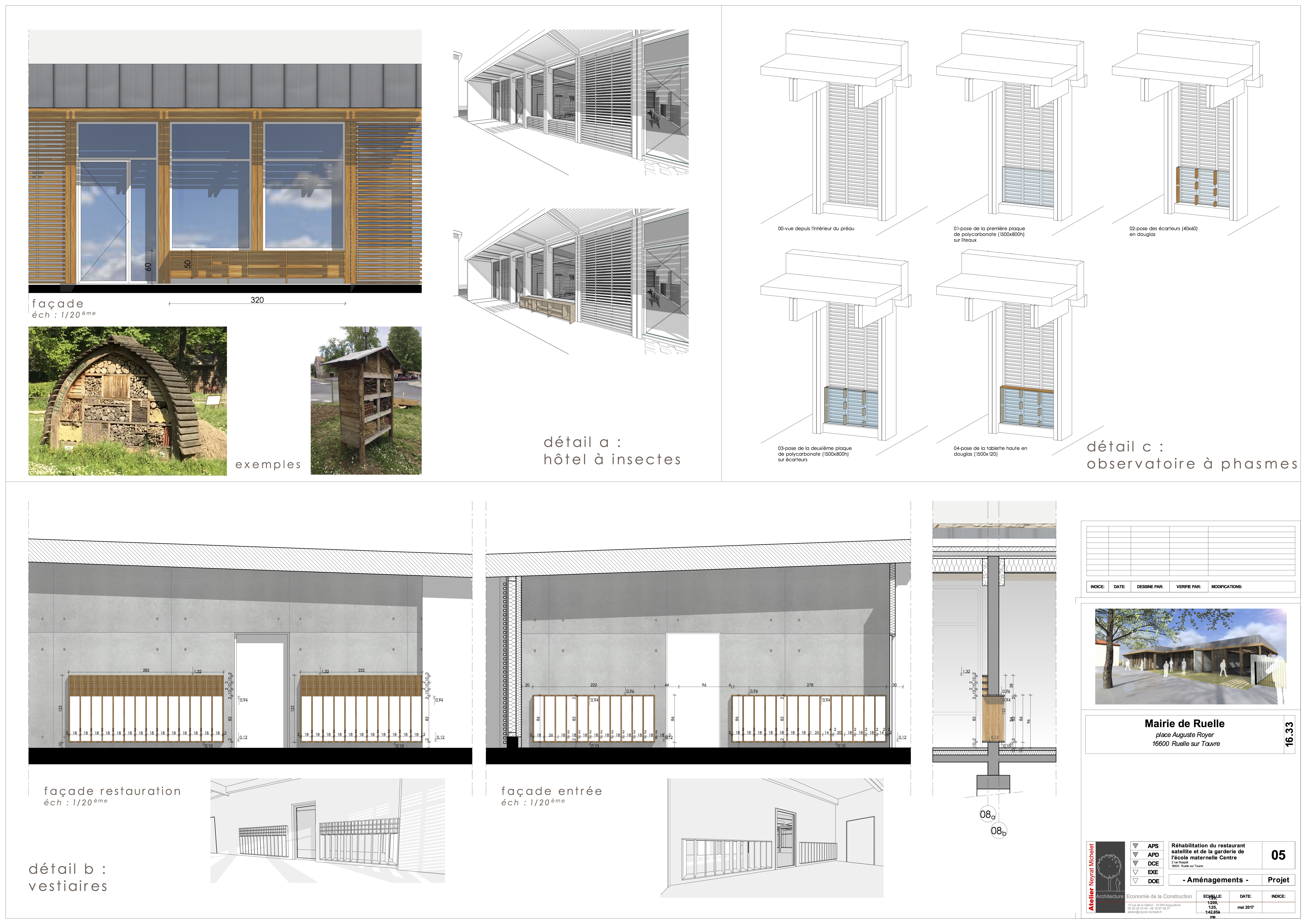 Approche environnementale : L'utilisation du bois dans l'ossature, le bardage et les menuiseries permet d'anticiper la déconstruction du bâtiment tout en valorisant les circuits courts. Avec l'équipe enseignante de l'école et les connaissances de Charente Nature, nous avons fait évoluer le bâtiment en outil pédagogique et environnemental. Nous avons construit une structure à remplir par les enfants pour accueillir des hôtels à insectes, un observatoire à phase sous le préau, une noue plantée humide pour échanger sur les enjeux de perméabilité des sols, et enfin un jardin des senteurs a été planté dans la cour.