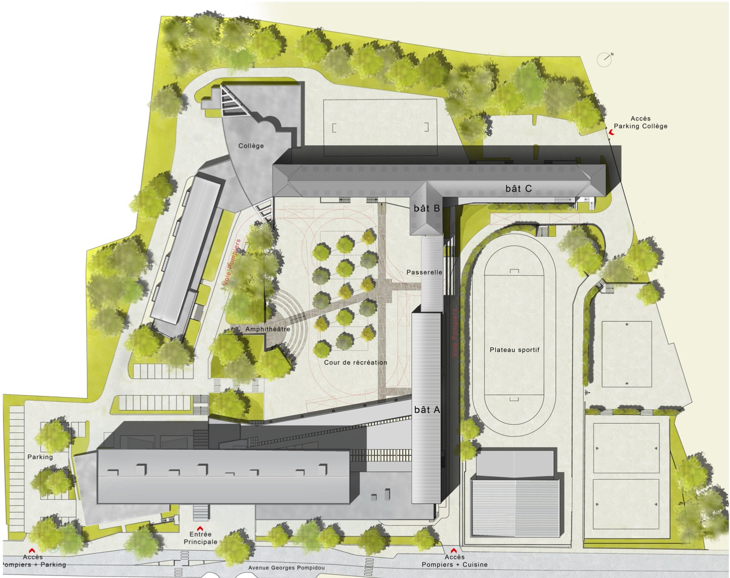 Le pont de liaison est une construction légère et transparente. Son volume s’intègre aux volumes existants en reprenant le principe d’ordonnancement des façades. La structure métallique, semblable à un pont suspendu, ne repose que sur un portique et la cage d’ascenseur, libérant l’espace du rez-de-chaussée. Les passerelles de circulation intérieures, en bois massif, reposent sur les traverses des portiques et relient tous les niveaux des bâtiments. Le pont de liaison reçoit sur ses deux façades un bardage métallique en alu laqué qui protège les passerelles intérieures en bois des intempéries (vent et pluie). La qualité esthétique de cette peau et sa vibration évoque, en clin d’œil, le rideau de scène. Par un jeu de transparence, la passerelle est animée par les silhouettes des élèves qui se découpent à l’arrière de ce voile. A l’intérieur de la structure métallique, l’ascenseur est aménagé dans une tour maçonnée.
