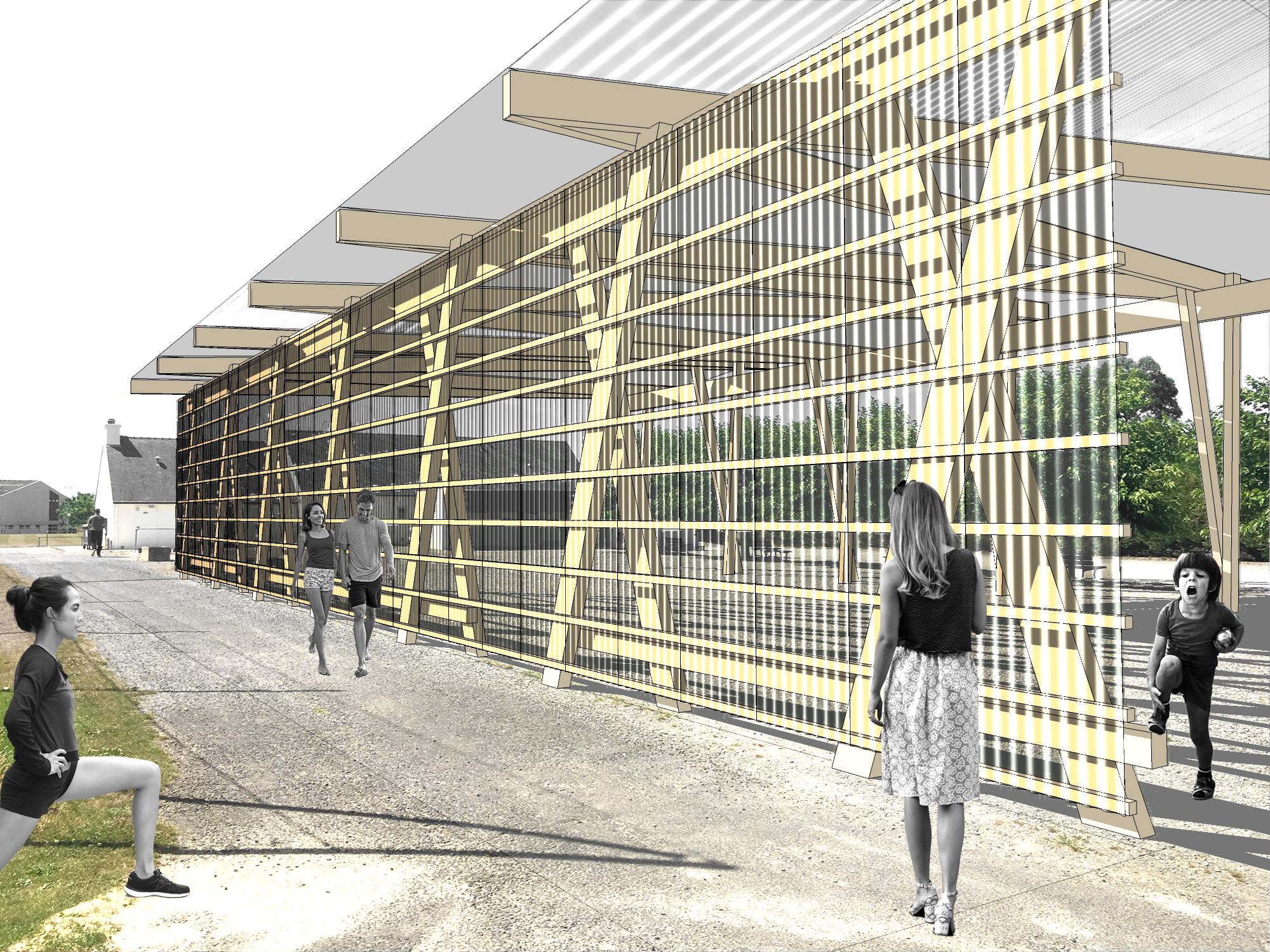 Le boulodrome de Missillac reconfigure l’entrée d’une plaine de sports. L’enjeu est d’abriter une partie des terrains de pétanque pour permettre une pratique à toute heure, de tout temps. Une structure dynamique et élancée tourne le dos et se protège du terrain de foot et des vents dominants, pour dégager en limite un chemin d’accès identifié aux vestaires. Ce auvent embrasse l’espace dédié à la pétanque. Il l’intimise sans le clore par des amenées de lumières en façade et toiture. Le projet favorise les situations affectionnées du bouliste: concentration, contemplation, et rencontres humaines