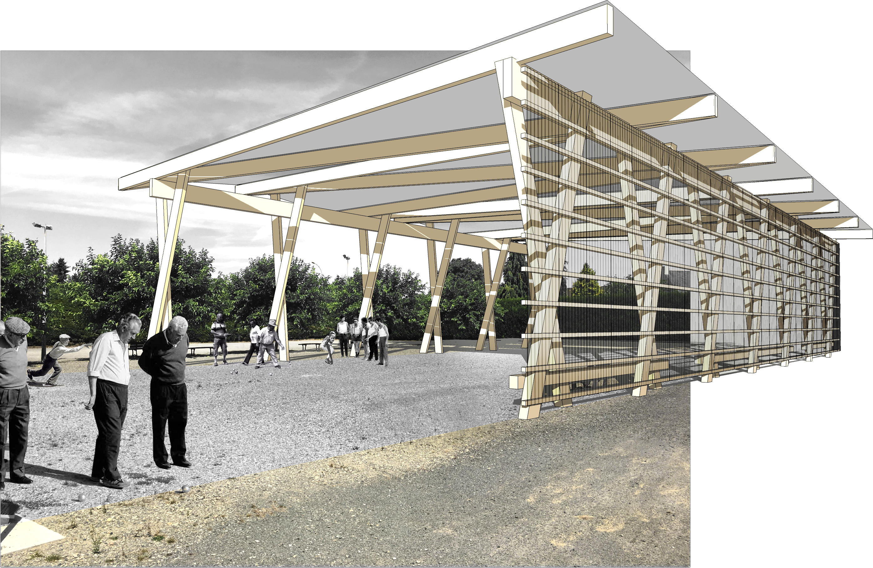 Approche environnementale : Respectant un budget très limité, l’implantation du auvent préserve et valorise le contexte existant, jusqu’à en faire des parties constituantes du projet. La haie de thuyas au Nord et à l’Est est utilisée comme protection naturelle contre les vents dominants. La rangée de banc à l’ombre des arbres est conservée, constitue le seuil de l’abri, et discute avec terrains et structure. La grande économie de moyens du projet met en raisonnance les bois douglas bruts non traités de la charpente, la fonction d’abri nécessaire au jeu, et la lumière qui connecte le bouliste aux éléments.