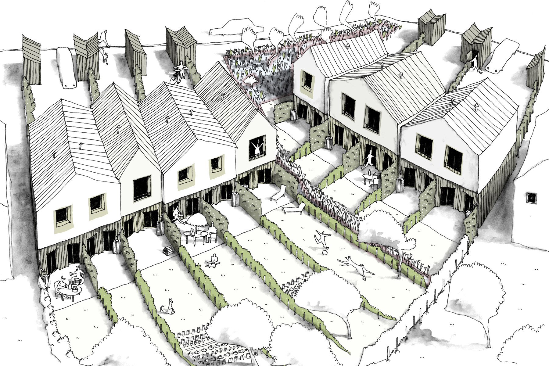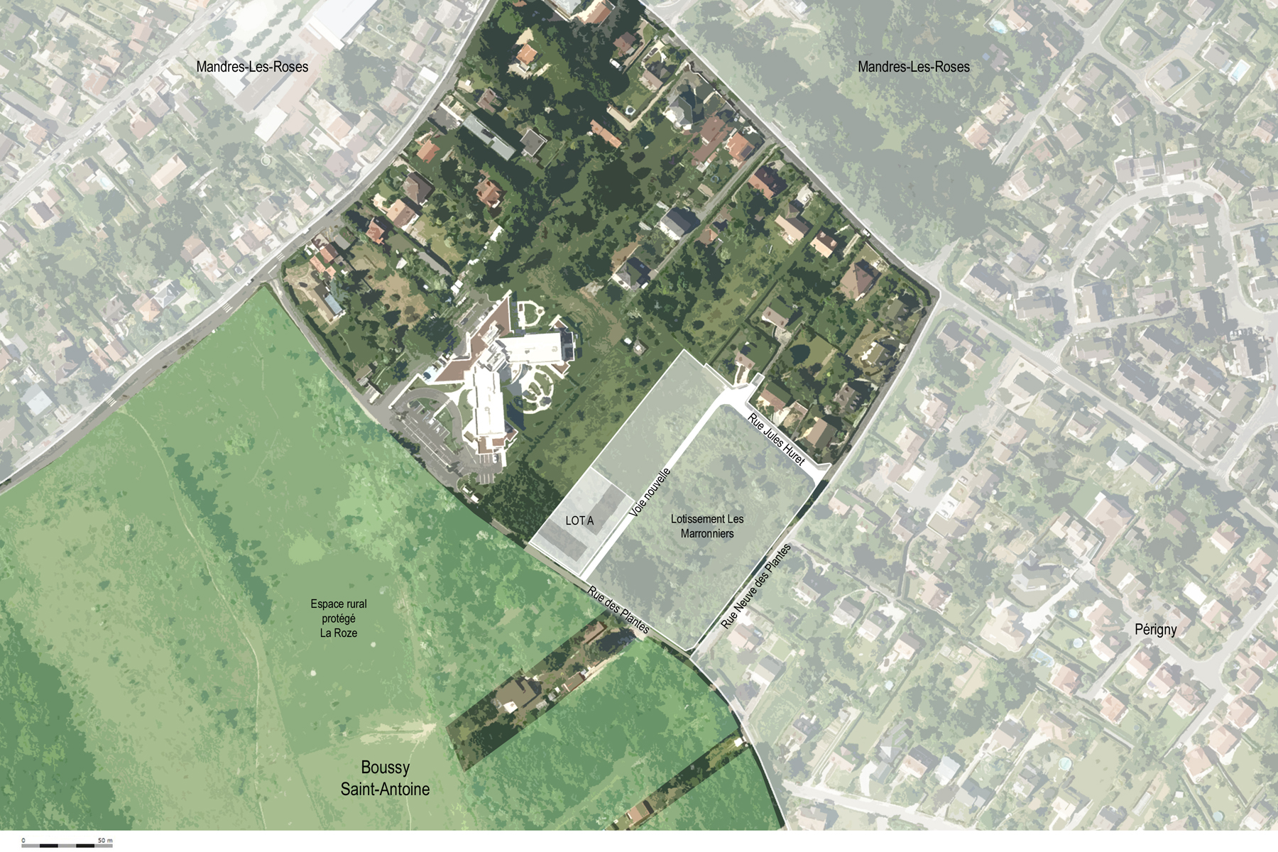 L’éco-lotissement «les Marronniers» investit une friche horticole, en bordure de la Forêt de Sénart, face à l’espace rural protégé de la Vallée de l’Yerres. Dans ce cadre paysager privilégié, le lot A rassemble 11 maisons ossature bois qui participent de la reconstitution et de l’enrichissement «hors site» du PRU d’Epinay-sous-Sénart. Les deux ensembles de maisons mitoyennes forment un front bâti rythmé le long du chemin rural et de la rue, et ménagent à l’angle de la parcelle une porosité vers les jardins et plus loin le verger voisin. Les volumes s’égrainent en léger quinconce, groupés deux à deux, selon la pente douce du plateau parcellaire afin de dissocier leurs silhouettes sans rupture d’échelle avec le paysage pavillonnaire environnant. Cultivant l’imaginaire et les qualités domestiques de la maison individuelle, les espaces libres paysagers offrent à chaque logement un jardin privatif agrémenté d’une cabane en même temps qu’ils proposent, à l’angle de la parcelle et entre les maisons, la mise en scène d’une gestion responsable des eaux pluviales sous la forme d’un bassin et d’une noue plantée.