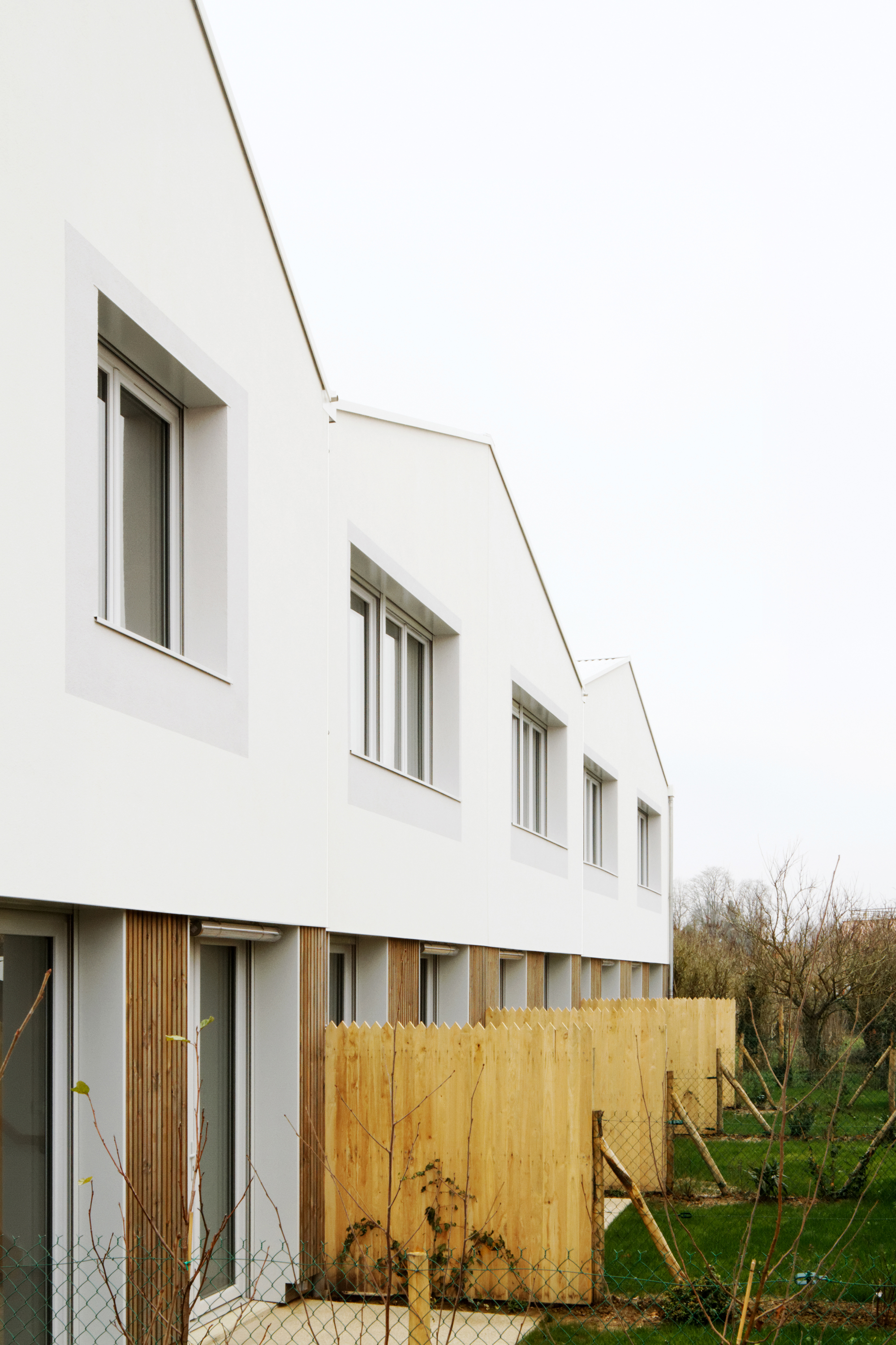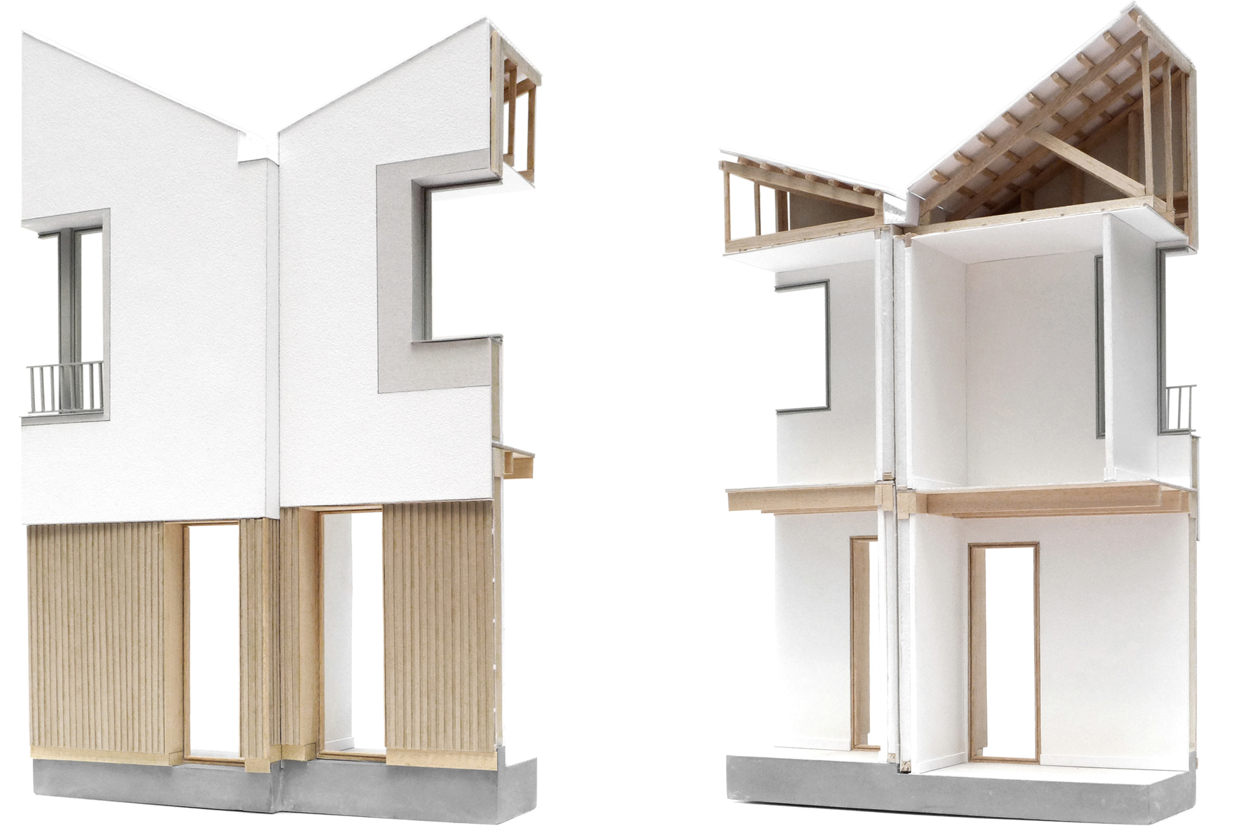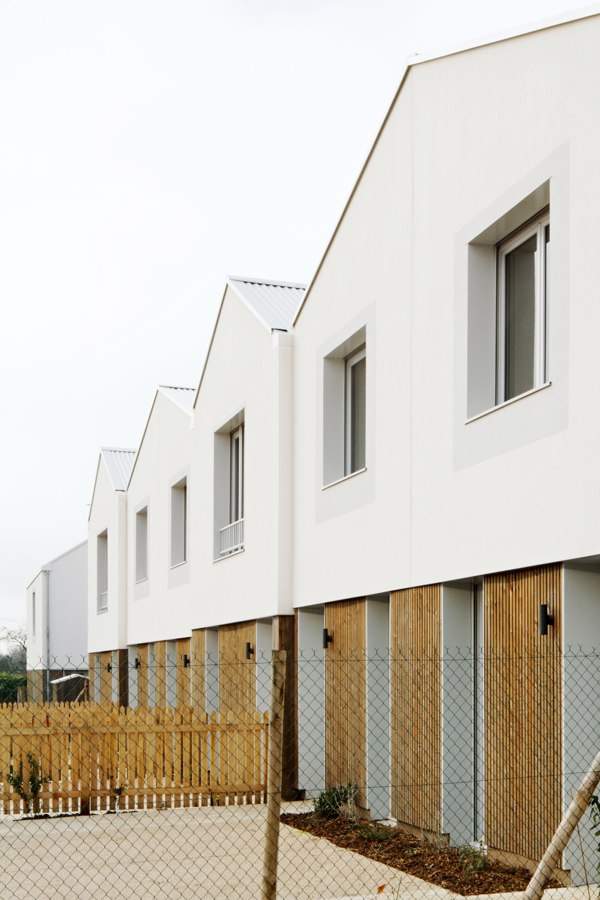Approche environnementale : * Cerqual Habitat & Environnement Profil A - * HPE RT2012 -10% (45 kWhep/an/m2) * E+C- énergie2 carbone 1 Le projet utilise les principes de l’architecture bioclimatique - compacité, masques solaires minimisés, apports solaires passifs, enveloppe bois performante et à faible impact environnemental -. L’écriture architecturale des maisons repose sur le contraste simple entre un socle en bardage bois pré-grisé et un attique à dominante minérale. La combinaison de ces deux matériaux et de leurs camaïeux propose une image à la fois discrète, chaleureuse et lumineuse en cohérence avec le tissu environnant. A l’intérieur, la profondeur domestique des logements en duplex est augmentée par la présence chaleureuse du bois de la structure.