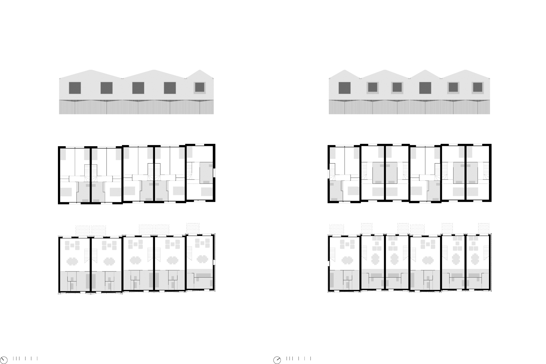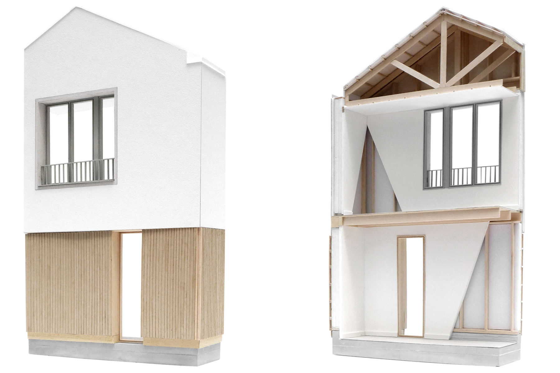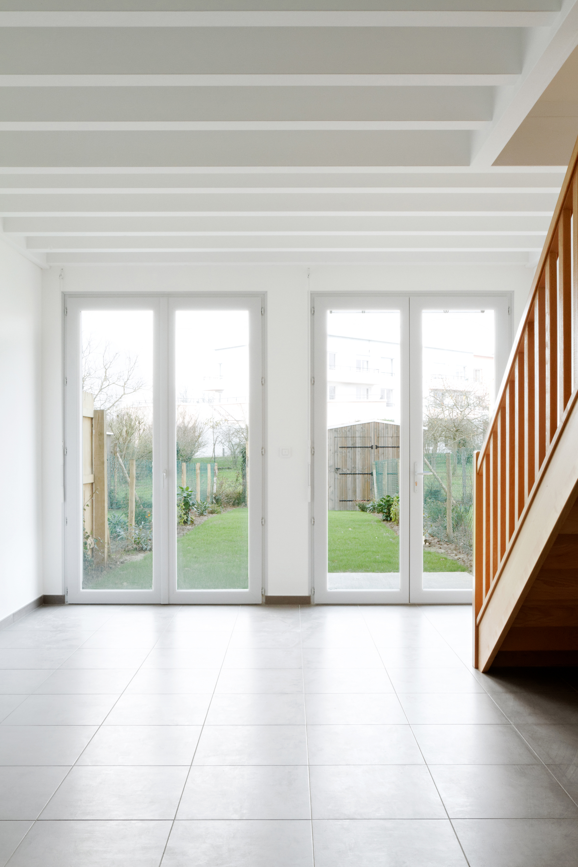 Approche environnementale : * Cerqual Habitat & Environnement Profil A - * HPE RT2012 -10% (45 kWhep/an/m2) * E+C- énergie2 carbone 1 Le projet utilise les principes de l’architecture bioclimatique - compacité, masques solaires minimisés, apports solaires passifs, enveloppe bois performante et à faible impact environnemental -. L’écriture architecturale des maisons repose sur le contraste simple entre un socle en bardage bois pré-grisé et un attique à dominante minérale. La combinaison de ces deux matériaux et de leurs camaïeux propose une image à la fois discrète, chaleureuse et lumineuse en cohérence avec le tissu environnant. A l’intérieur, la profondeur domestique des logements en duplex est augmentée par la présence chaleureuse du bois de la structure.