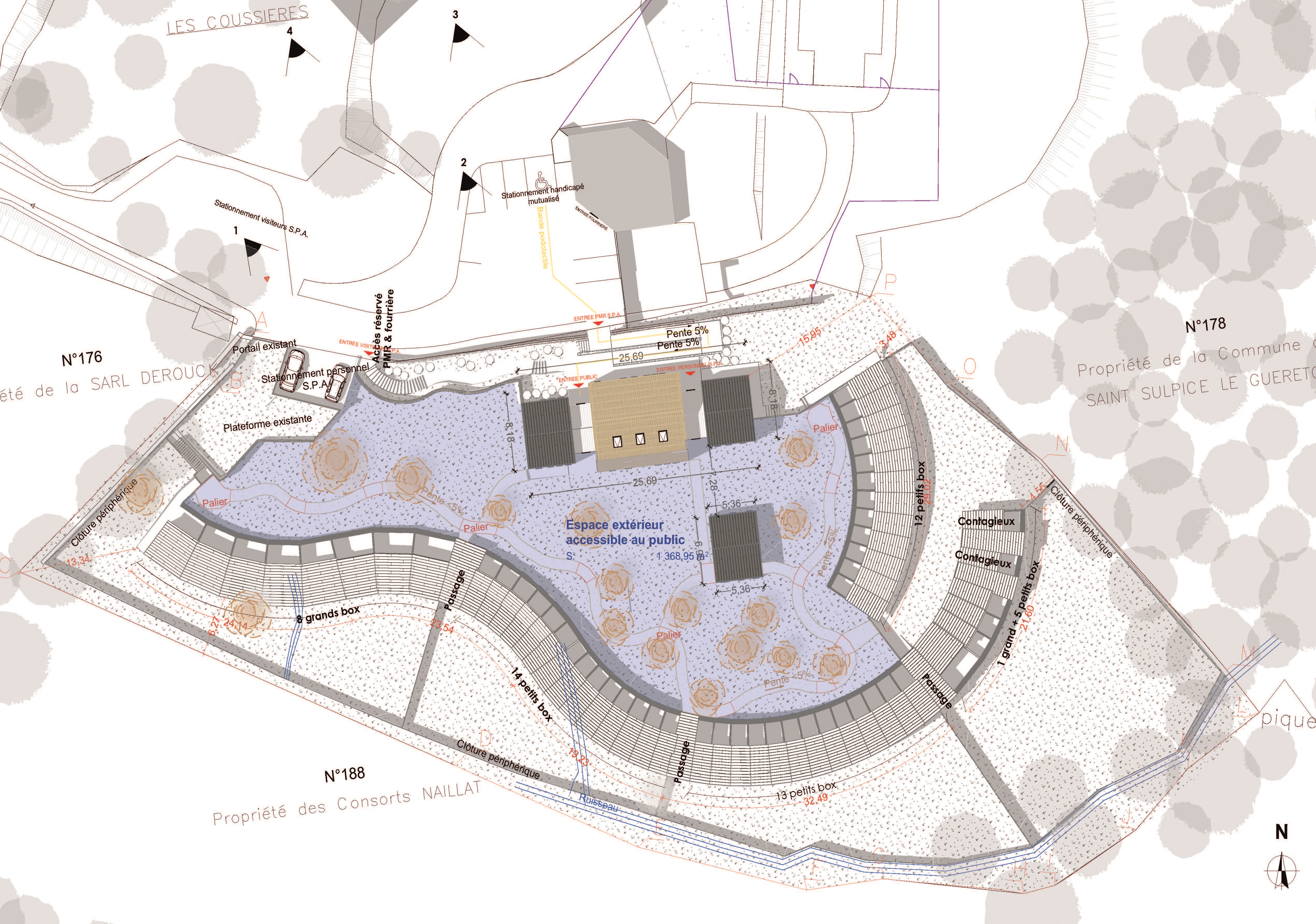 Le projet consiste ne la reconstruction du refuge de la SPA à st sulpice le guérétois (23) sur un site existant arboré avec un ruisseau en bordure; Le programme comprend un bâtiment d'accueil, un bâtiment de stockage et 53 boxs avec courettes pour les chiens. Le bois s'impose comme une réponse évidente à son intégration dans l'environnement. Le parti architectural consiste à insérer les box dans la pente en forme d'anneau afin que les animaux soient bien visibles pour l'adoption et que le circuit de promenade soit fluide. Le bâtiment d'accueil est central, il a vu sur les box et il permet un accueil du public, des soignants et du personnel.