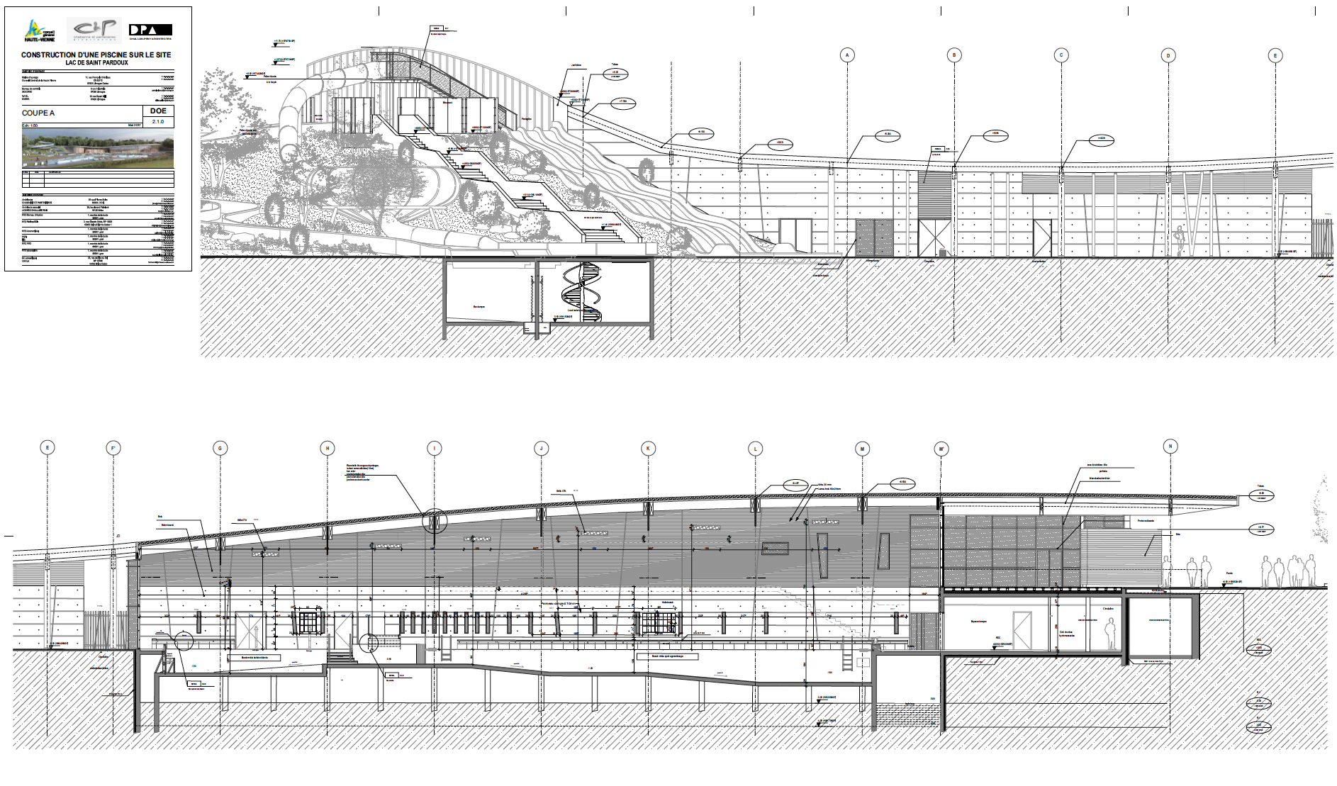 Descriptif technique : Le bâtiment est composé de 2 volumes, au Sud le premier volume abrite les espaces dédiés au public. Le volume Nord comporte les locaux du personnel, les locaux techniques. Réparti sur 2 niveaux pour s'adapter à la pente, on retrouve les locaux administratifs et une zone d'accueil du public au niveau haut tandis que le reste des locaux et des espaces d'activités se trouvent au niveau bas du bâtiment.