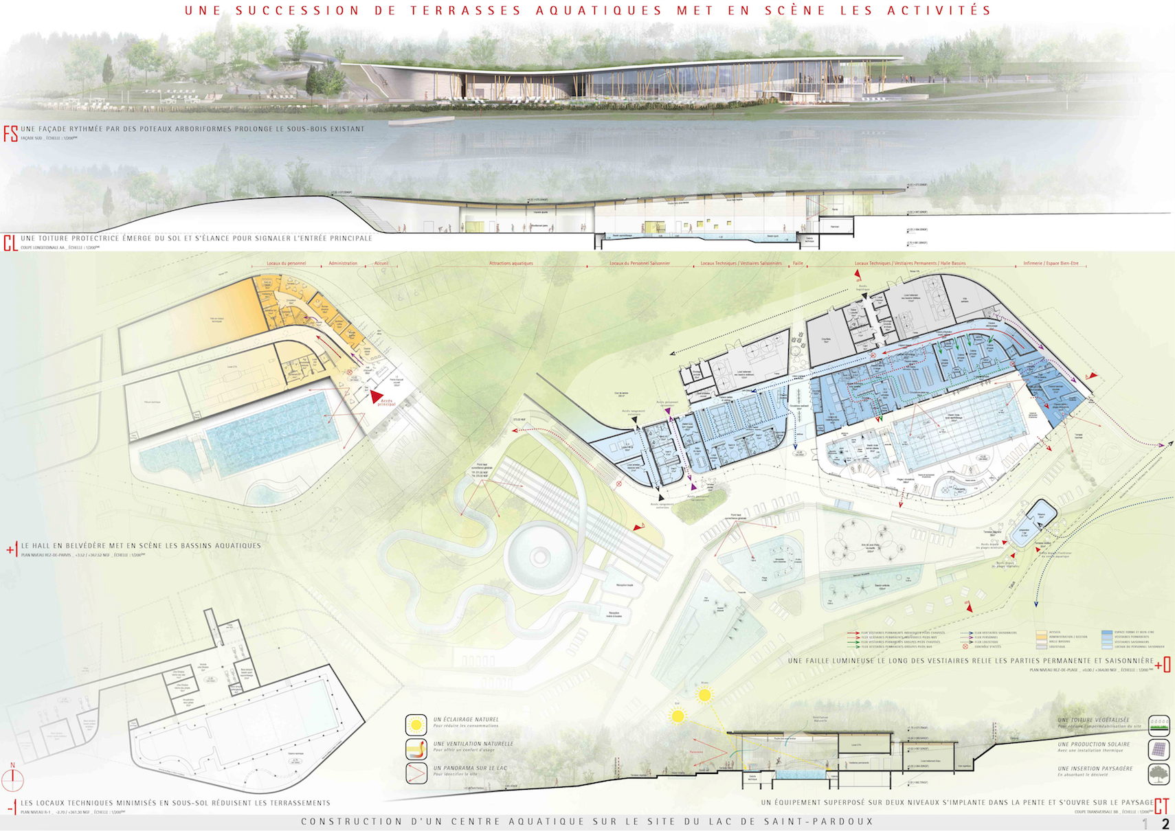 Le projet s'implante face aux accès existants, au lac et le site de l'école de voile. C'est un bâtiment-belvédère qui s'implante de manière semi-enterrée dans la pente afin de préserver les vues depuis les espaces "pique-nique" mais également de les limiter sur la cour logistique, positionnée derrière un talus.