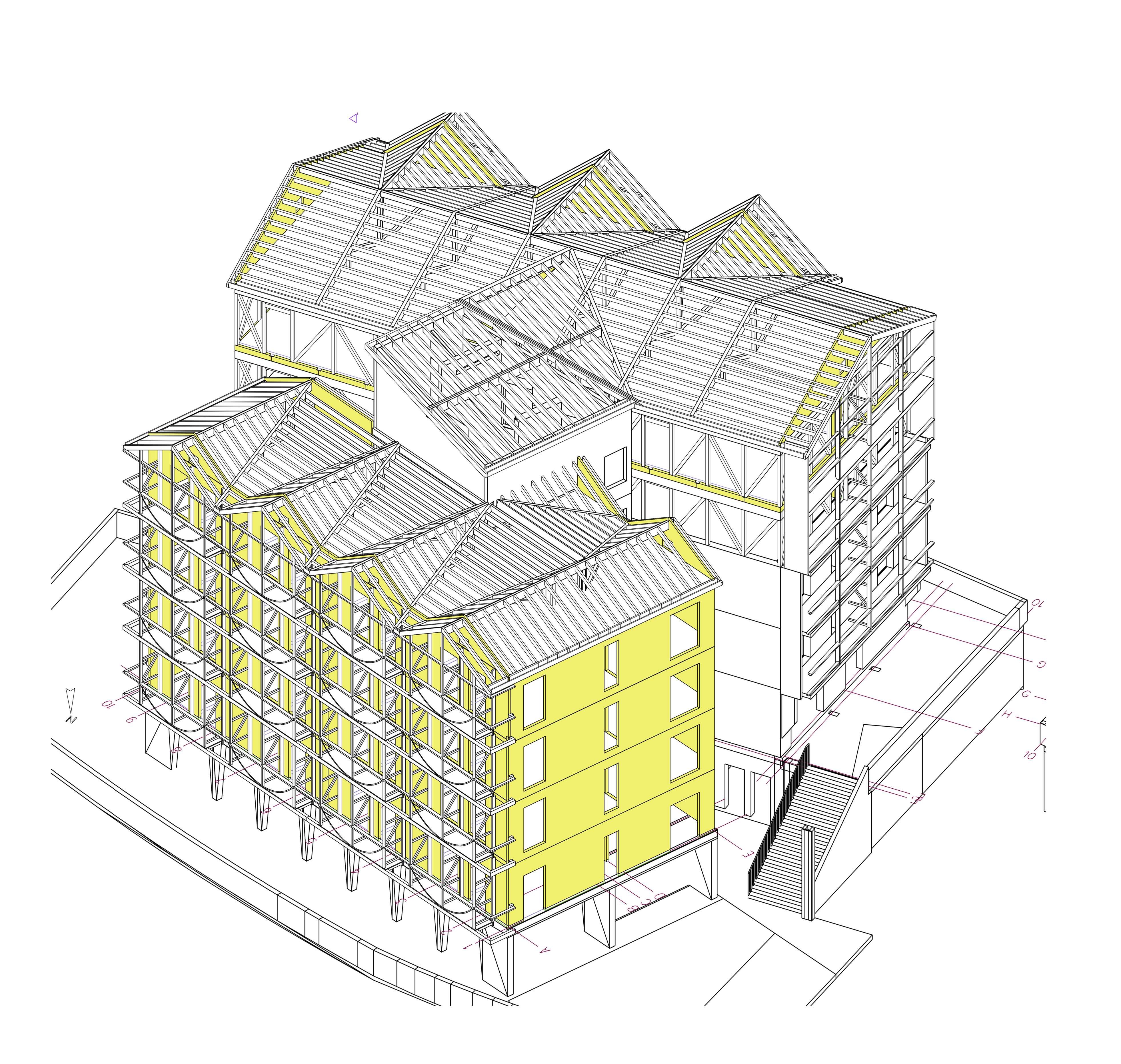 Descriptif technique : Le CLT est utilisé pour tous les planchers et refends de la partie neuve. Les murs extérieurs de la surélévation sont traités, pour des questions de surcharges sur les ouvrages existants, sont traités en MOB . Un complexe spécifique est mis en place sur les planchers CLT pour régler les questions acoustiques. Il est constitué, en partant du dessous d’un CLT 200 mm avec face inférieure vue + nid d’abeille rempli de sable + isolant laine de roche rigide + chape béton. Un complexe parfaitement efficace qui compense largement les faiblesses naturelles du plancher bois en matière d’acoustique. PEFC (Gestion forestière durable) FSC (Gestion forestière responsable) NF Portes résistant au feu en bois Marquage CE