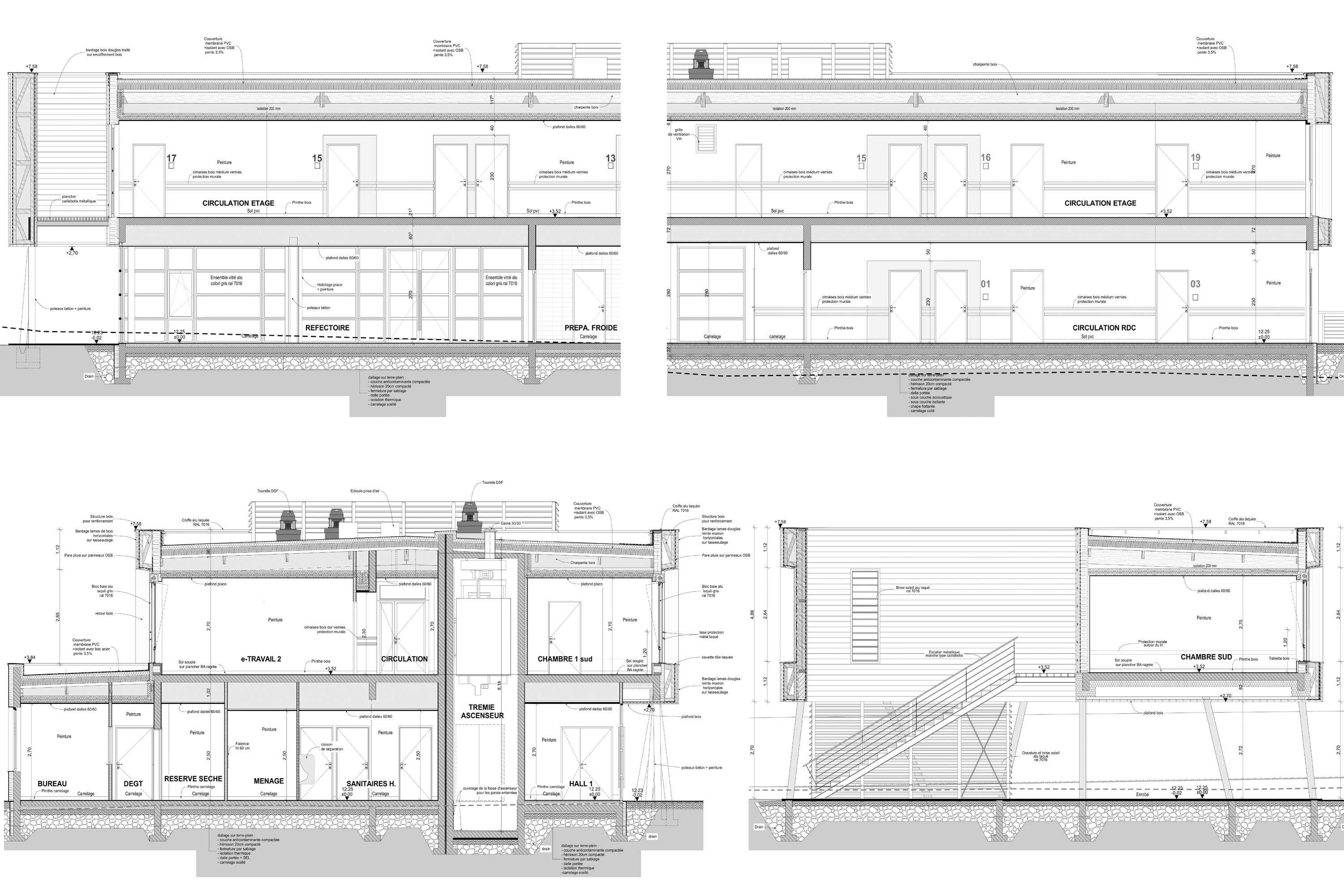 Construction d'un internat pour les étudiants + réfectoire et cuisine. L'étage est construit en bois (structure bois associée à quelques voiles en béton pour la stabilité) et parements extérieurs en bois type TREMOLO et TRESPA.