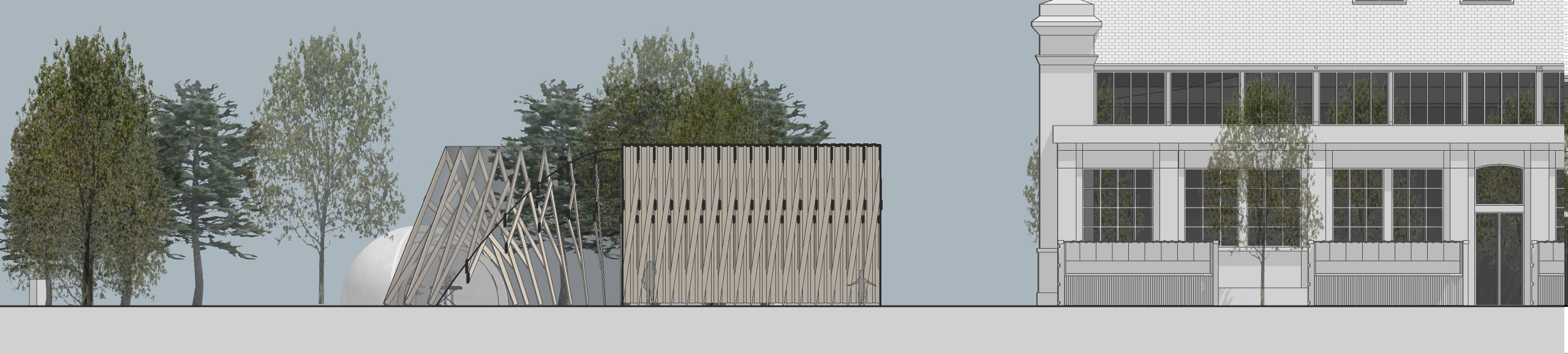 Par un dispositif simple et allégé au maximum, cette structure ciseaux se développe sur 15 m pour créer un tunnel lumineux abritant des activités culturelles. La structure et le couvrement sont issus de techniques traditionnelles réadaptée à une architecture contemporaine et bénéficiant de qualité et des techniques de mise en oeuvre actuelle optimisant la finesse des matériaux.
