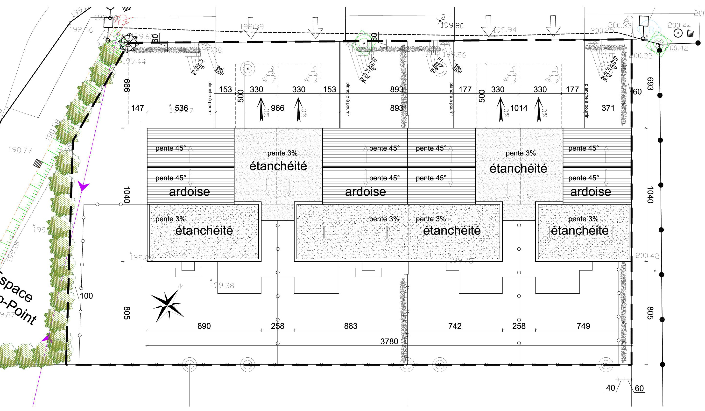 Le projet porte sur 4 pavillons locatifs sociaux (2 TIII et 2 TII) pour CÔTES d'ARMOR HABITAT sur la commune de MAËL-CARHAIX. Le foncier réduit en façade sur rue à généré des logements en profondeur qui sont très bien orientés au Sud. De larges baies donnent accès à des terrasses privatives. Le volume sous toiture ardoise a été minimisé afin de limiter la hauteur des pavillons, une toiture terrasse plus basse permet de couvrir le reste de la maison. L'ensemble épouse la topographie et permet de briser l'effet linéaire et répétitif des logements en bande.