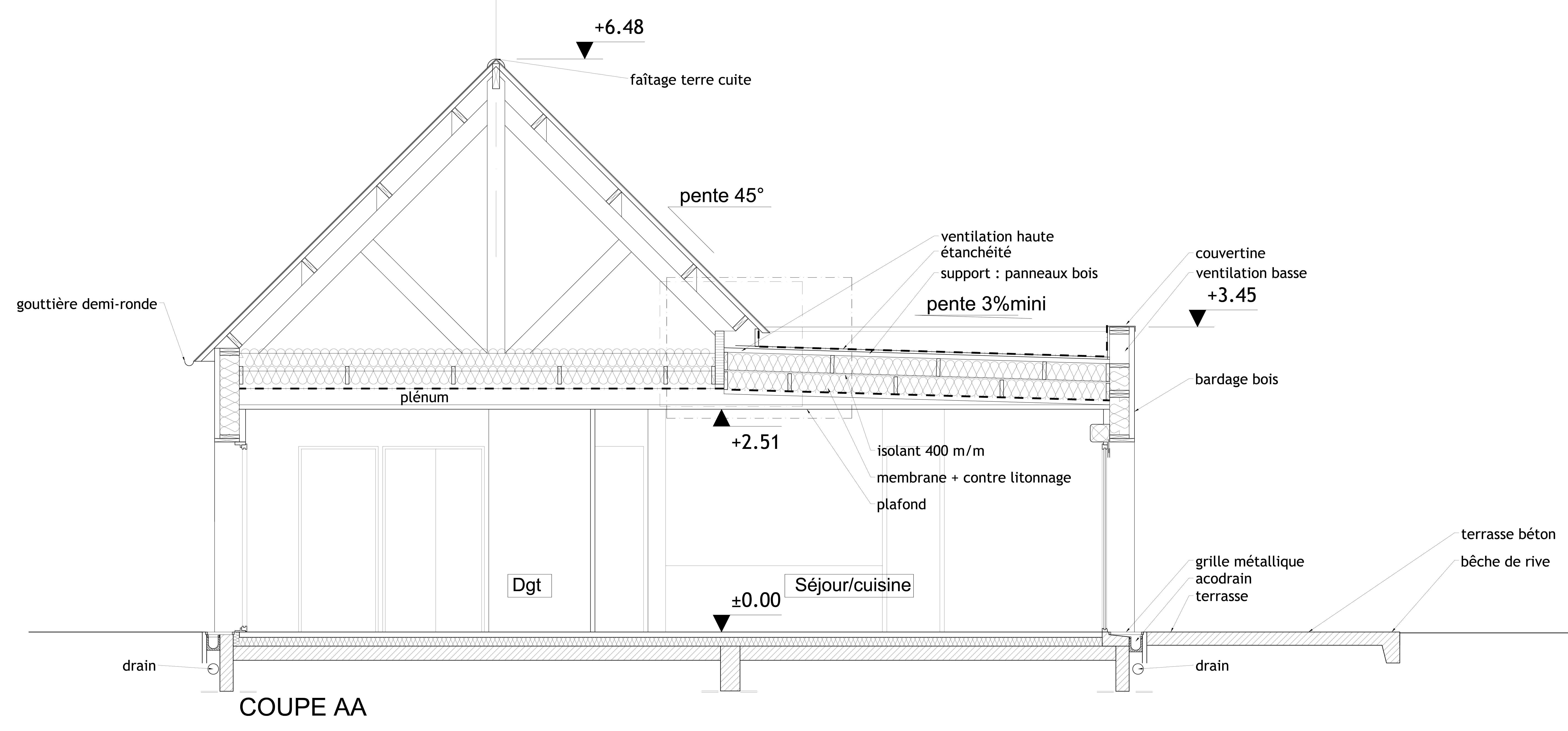 Descriptif technique : L'ossature bois a naturellement été retenue, sauf pour les garages. La mise en oeuvre des membranes a fait l'objet d'un travail de précision. Les matériaux naturel ont été retenus (ardoises naturelles et bois douglas) - le site est soumis à l'avis des Architectes de France. L'ossature de 220 mm permet une très bonne isolation complétée par une isolation de 400 mm en combles.