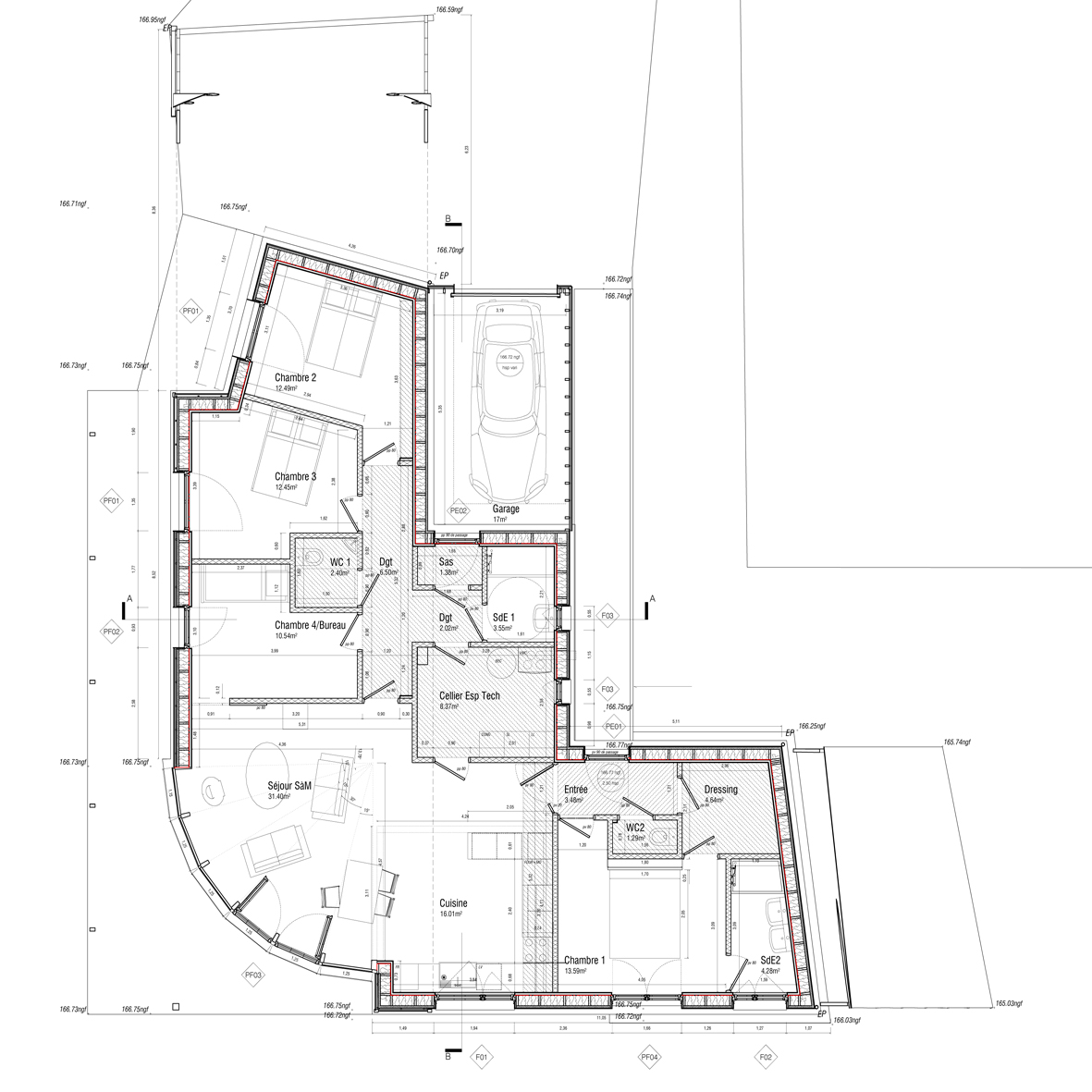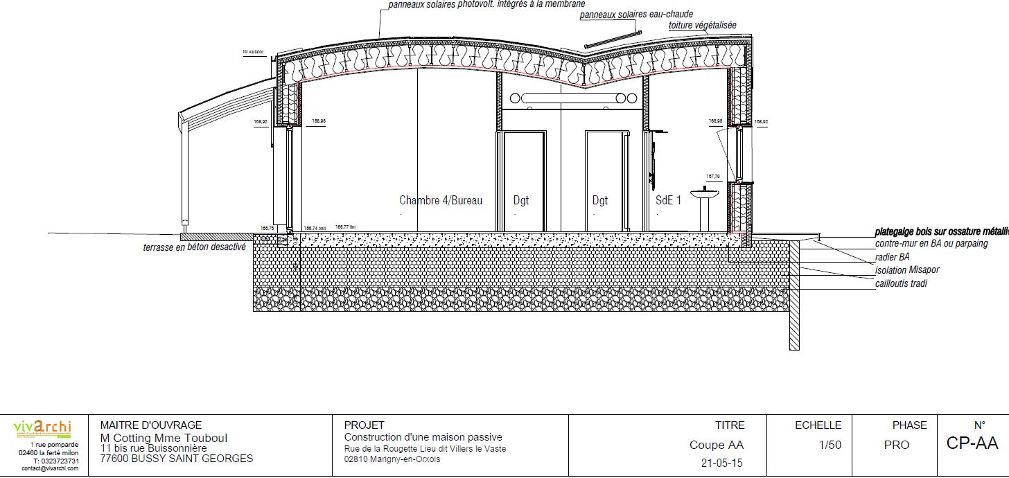 Approche environnementale : La maison a été conçue pour assurer un ensoleillement maximal tout au long de la journée en hiver en même temps qu’une ouverture visuelle sur le paysage environnant. Pour le confort d’été les débords de toiture, la couverture végétalisée, les protections solaires, la pergola ainsi que l’inertie du radier contribuent à tempérer les espaces intérieurs. Les besoins en eau chaude sanitaire sont couvert à 50 % par les capteurs solaires. Le chauffage quand il est nécessaire est assuré par un poêle à granulés associé à une ventilation double flux. L’assainissement individuel est un bassin planté de macrophytes.