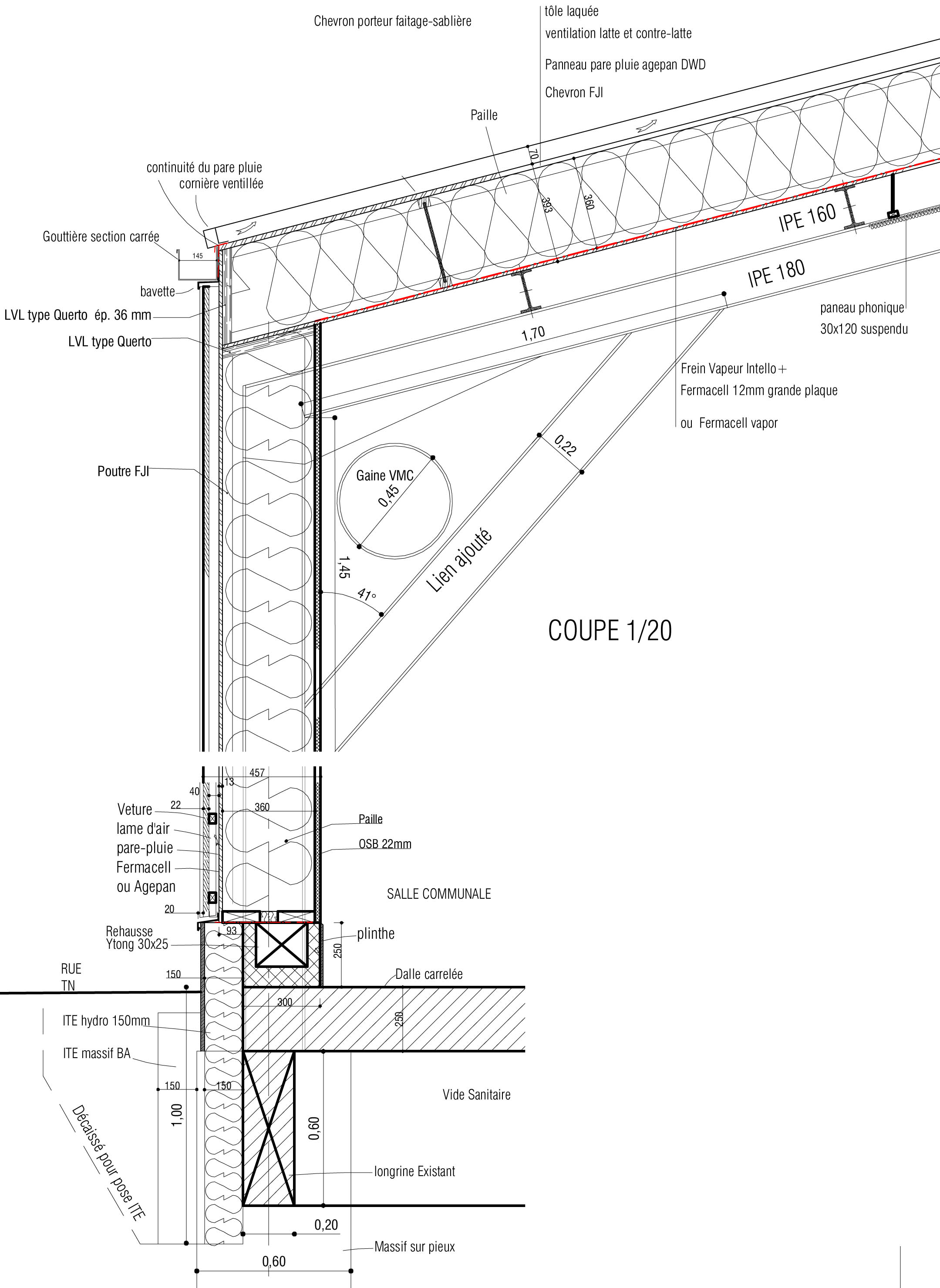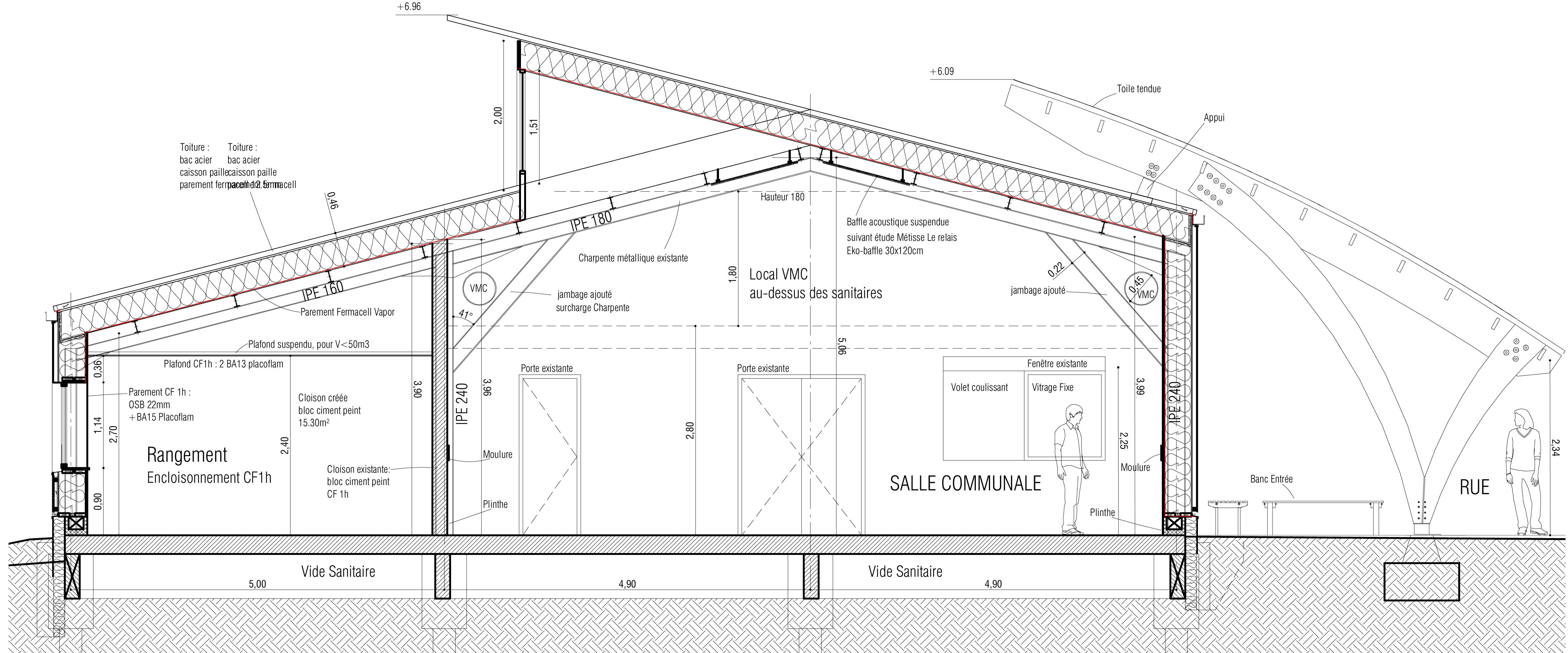 Approche environnementale : La structure métallique existante a été conservée ainsi que le bloc sanitaires et la dalle béton. Le reste a été déposé avec une partie de désamiantage. L’enveloppe du bâtiment a été réalisée avec des caissons en peuplier et bottes de paille. Les caissons ont été pré-fabriqués en atelier, ce qui a permis de s’affranchir en partie des contraintes climatiques, le chantier ayant été réalisé entre octobre et avril. La technique des caissons bois et des bottes de paille a été choisie pour répondre à différents objectifs : - limiter l’empreinte carbone du bâtiment avec des matériaux écologiques - mettre en oeuvre des matériaux locaux ou régionaux - faire appel à des entreprises de proximité en corps d’état séparés - préfabriquer pour limiter les nuisances de chantier et faciliter les interventions en période hivernale
