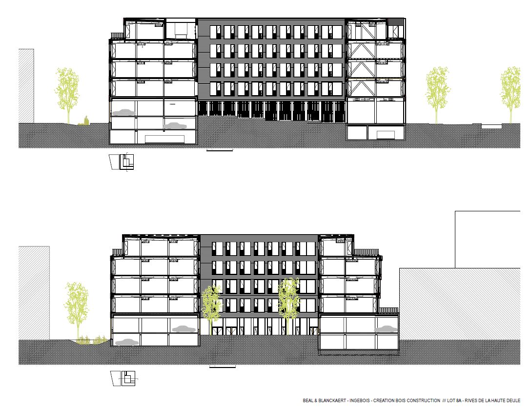 Approche environnementale : L’écriture architecturale unitaire du bâtiment, s’adapte sur chaque façade par de subtiles variations dans leur dessin et leur composition. Cette différenciation répond à la fois à des statuts urbains différents (façade principale sur grande pelouse / arrière sur allée piétonne), ainsi qu’à leur orientation cardinale (N-E et N-O / S-E et S-O). Le bâtiment est certifié BPos : Bâtiment à Energie Positive, un travail précis a d’abord été mené sur les performances thermiques de l’enveloppe où le remplissage par ossatures bois trouve tout son intérêt. Les façades étant fortement isolées, l’écriture architecturale du bâtiment joue avec l’épaisseur du complexe de façade, et le degrés d’ouverture, plus ou moins vitré, en fonction de leur exposition bioclimatiques. La pose des menuiseries au nu intérieur pour les façades à dominantes sud et la pose au nu extérieur pour les façades à dominante nord est travaillée par un sertissage de la baie avec des panneaux bois. Utilisé en tant qu’ébrasement en façades Sud, le bois révèle l’épaisseur et la nature de l’enveloppe tandis que le remplissage dans la continuité des châssis en façades nord permet de maitriser graduellement le degré d’ouverture d’étage en étage. L’emploi du bois en structure et en ossature, est plus qu’une demande de notre client. C’est une opportunité saisie dans le projet pour réduire le temps de chantier, et travailler sur des logiques de préfabrication permettant de satisfaire également les délais et impératifs économiques de l’opération. L’énergie est produite par une centrale photovoltaïque qui recouvre toute la surface de la toiture. Le confort d’hiver et d’été est assuré par l’action combinée du système de ventilation et des panneaux rayonnants suspendus, tous deux réversibles chaud-froid, et dont l’action est régulée et coordonnée sur sondes secteur par secteur.