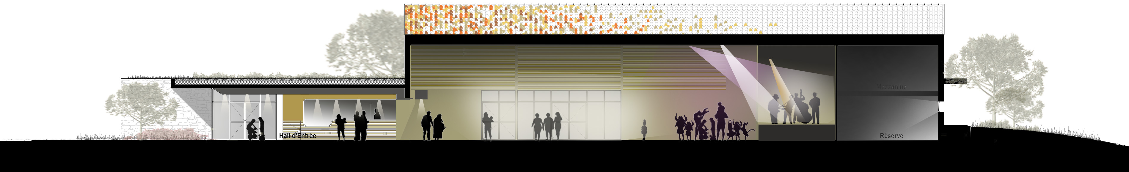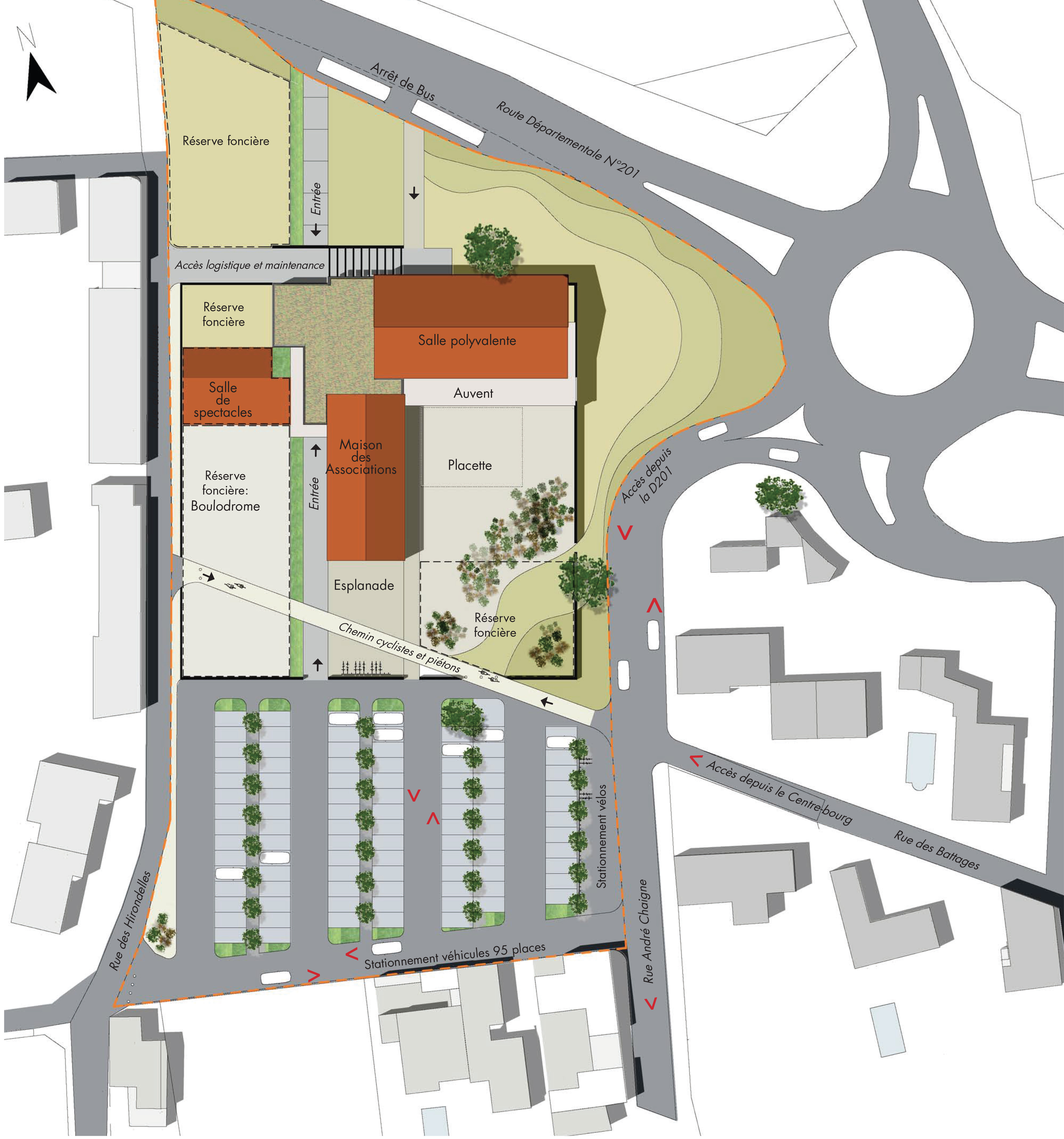Descriptif technique de l'aménagement : Le bâtiment se décompose en trois parties : • Le volume, le plus important est celui de la salle polyvalente qui annonce la nature de l’équipement tant dans ses dimensions que dans son traitement en façade. • Au Sud un second volume plus petit, renferme la salle de musique, les locaux des associations, les vestiaires, etc. • A l’Ouest, un volume plus modeste abrite le local technique et un local de rangement, sur lequel vient se greffer la salle de spectacles. Ces trois volumes sont reliés par une toiture plate végétalisée correspondant au hall d’entrée et aux vestiaires.