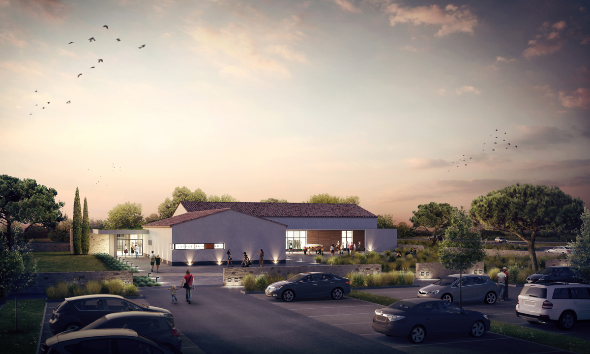 Le nouvel équipement est doté d’une architecture dont le caractère résolument contemporain s’appuie toutefois sur les fondamentaux du bâti rétais. Depuis la Départementale au Nord, le passant est en mesure de percevoir la composition simple de volumes épurés, une sorte d’objet sculptural posé sur un tapis dunaire vallonné dont le traitement sablonneux est parsemé de graminées. Depuis le centre-bourg au Sud, le promeneur perçoit l’équipement à travers son architecture plus domestique, donnant envie d’y pénétrer, de participer aux activités proposées à l’échelle du piéton ou du cycliste.
