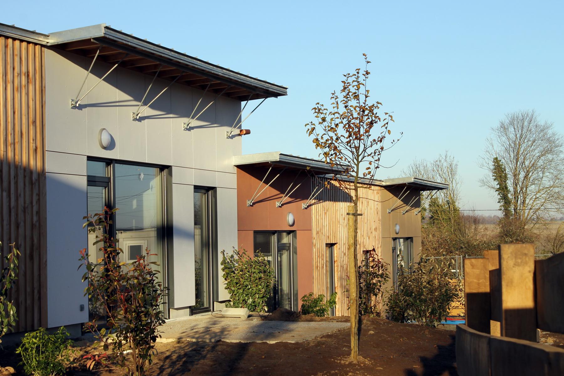 Descriptif technique : Soubassement en béton et plancher bas poutrelles hourdis sur vide sanitaire, solution rendue nécessaire par la présence de remontées d’eau (nappe perchée). Murs ossature bois, bardage bois en Douglas non traité, charpente bois, isolation en ouate de cellulose, linoleum dans les chambres, autant de matériaux stockant le carbone et à faible émission de COV (composé organiques volatils). Couverture zinc. Panneaux photovoltaïques intégrés en toiture des deux logements Ouest. Chauffage par réseau de chaleur alimenté par une petite chaudière à granulés. Revêtement de sol : carrelage et linoleum. PEFC (Gestion forestière durable) FSC (Gestion forestière responsable) CTB B Certification bas taux de formol (CARB) Marquage CE