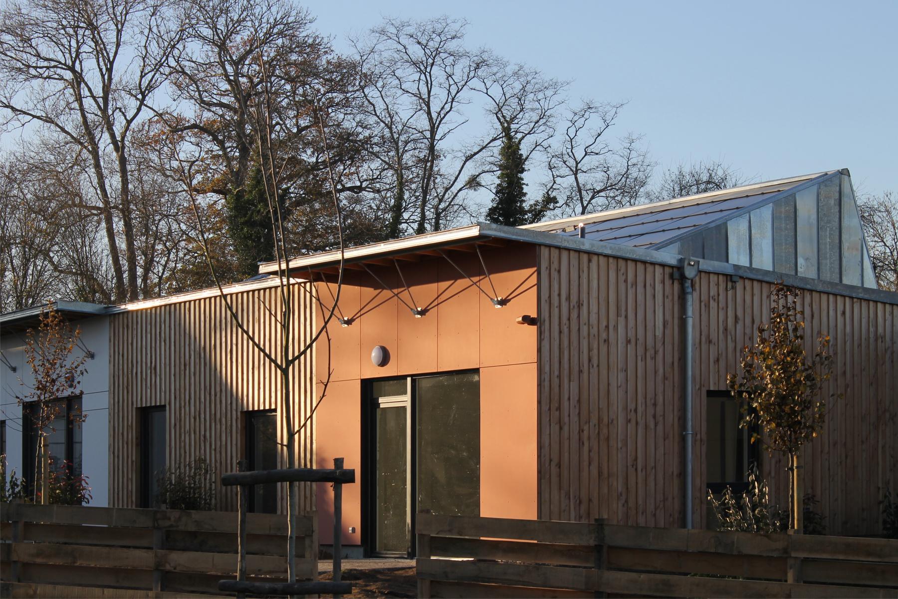 Approche environnementale : Projet certifié BEPOS Effinergie par CERQUAL. Performance thermique élevée des parois et approche bio-climatique affirmée sont mises en œuvre ici. Éclairage naturel et apports solaires passifs sont privilégiés : larges ouvertures en façade Sud et débord de toiture pour laisser entrer le soleil l’hiver et mettre les façades à l’ombre l’été, façades fermées au Nord. Les choix énergétiques ont fait l’objet d’un arbitrage précis. Malgré la taille réduite de l’opération, le maître d’ouvrage a opté pour une petite chaufferie collective à granulés bois complétée par 46m² de panneaux photovoltaïques. L’impact carbone de la construction est minimisé par l’utilisation de matériaux bio-sourcés.