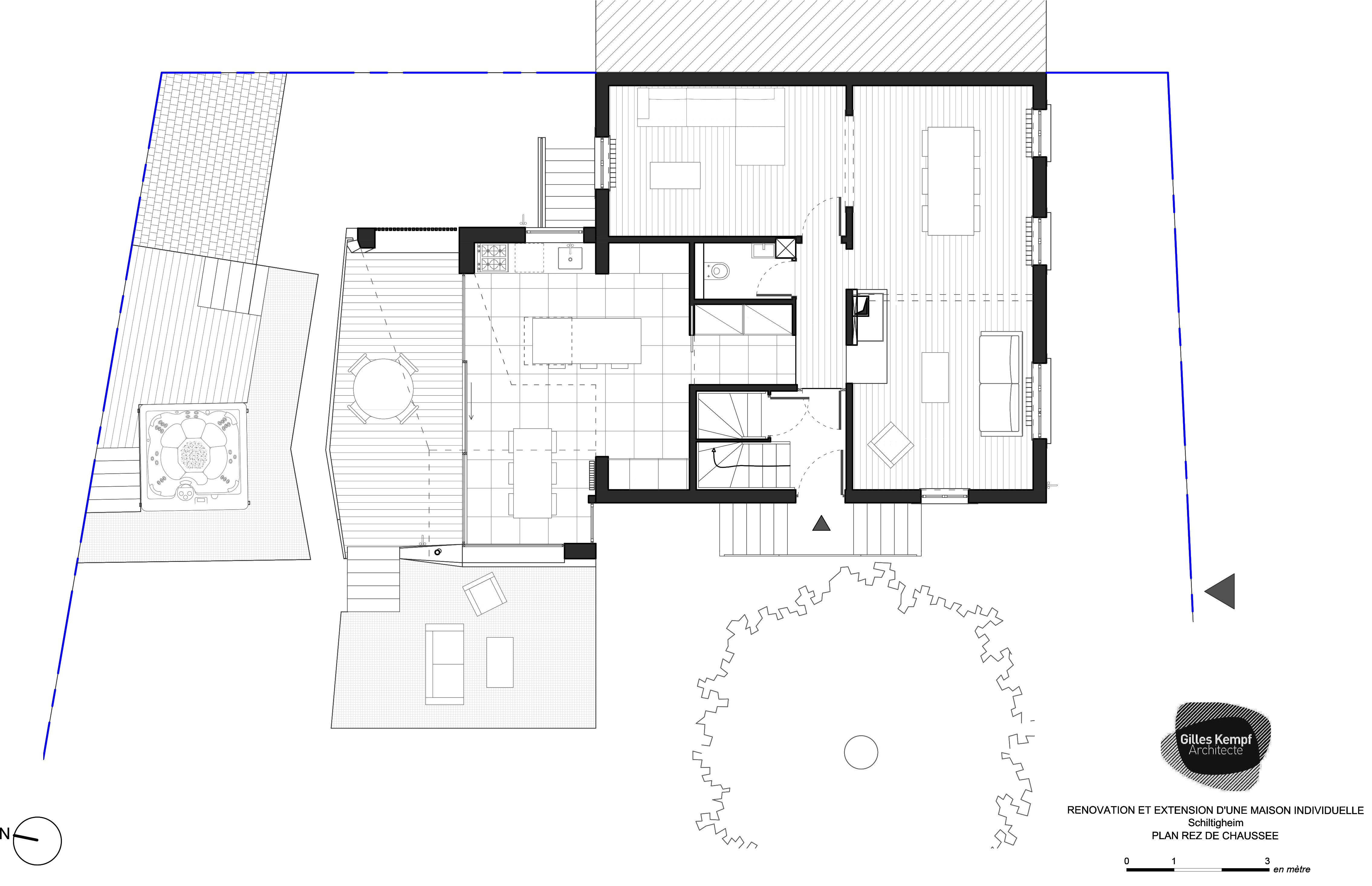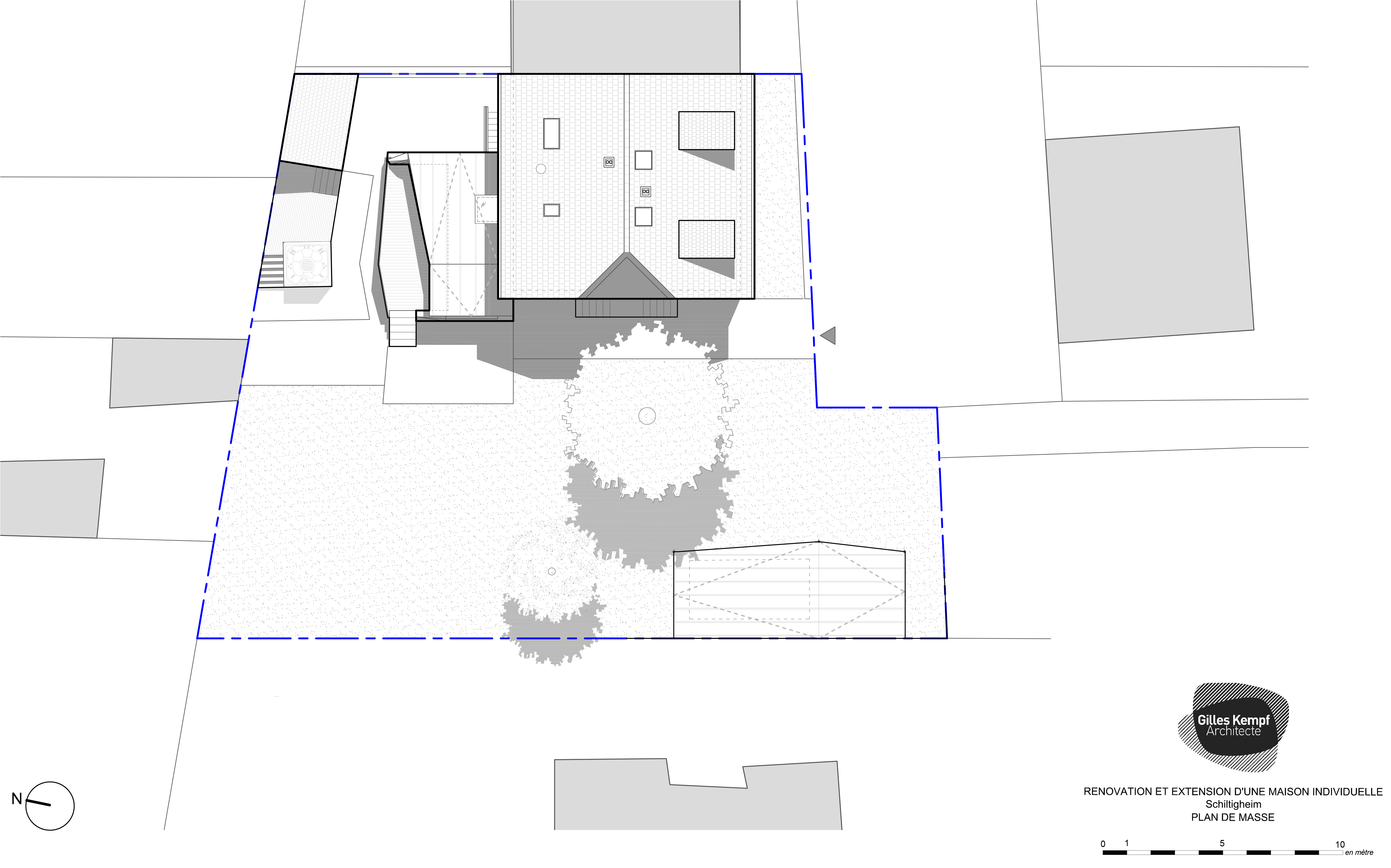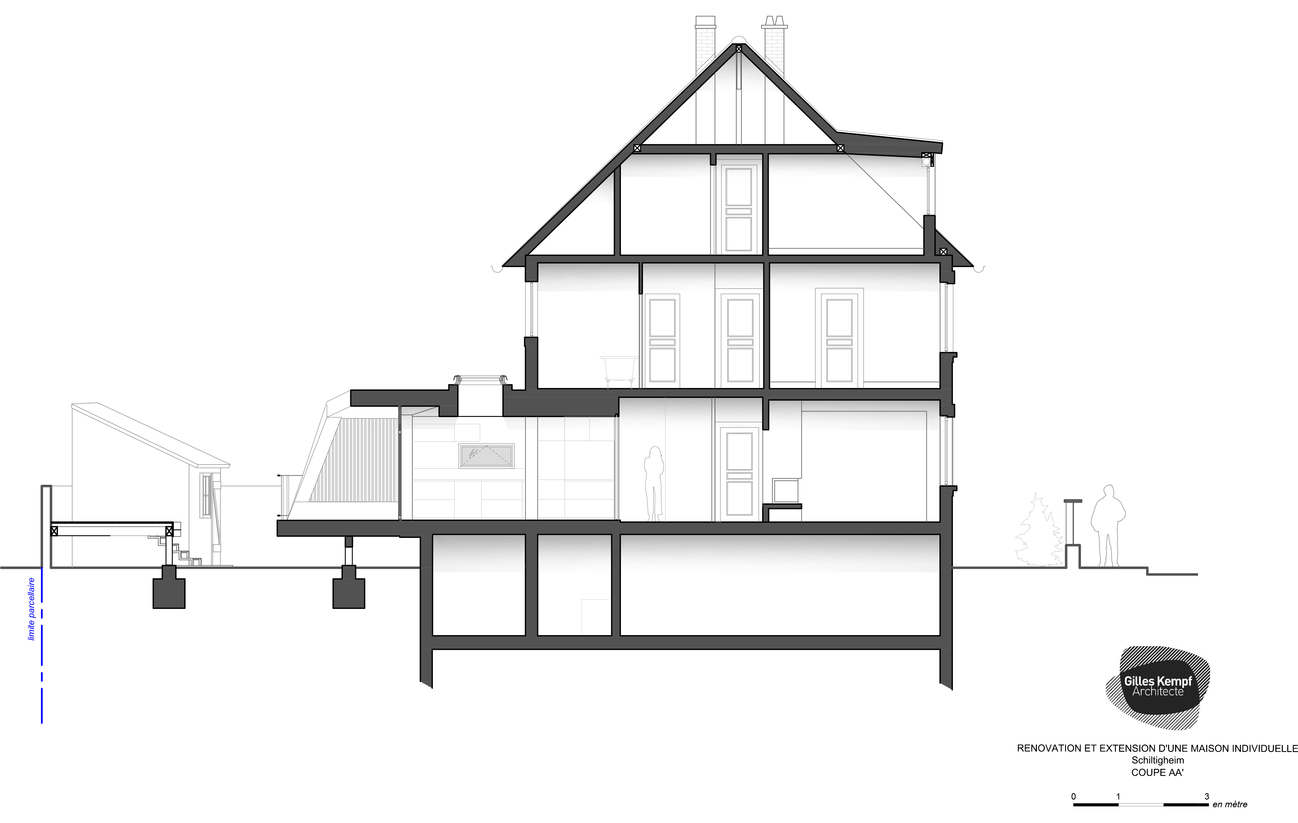 Il s'agit de la rénovation et de la construction d'une extension avec terrasse d'une maison individuelle ainsi que d'un spa hors sol attenant. L'extension est un volume rectangulaire en rez de chaussée, dont la couverture, en bardage anthra zinc, est biaisée ; celle-ci vient abriter partiellement une terrasse. La construction s'implante contre la façade nord ouest du bâtiment existant. La zone spa fait face à la terrasse de l'extension.