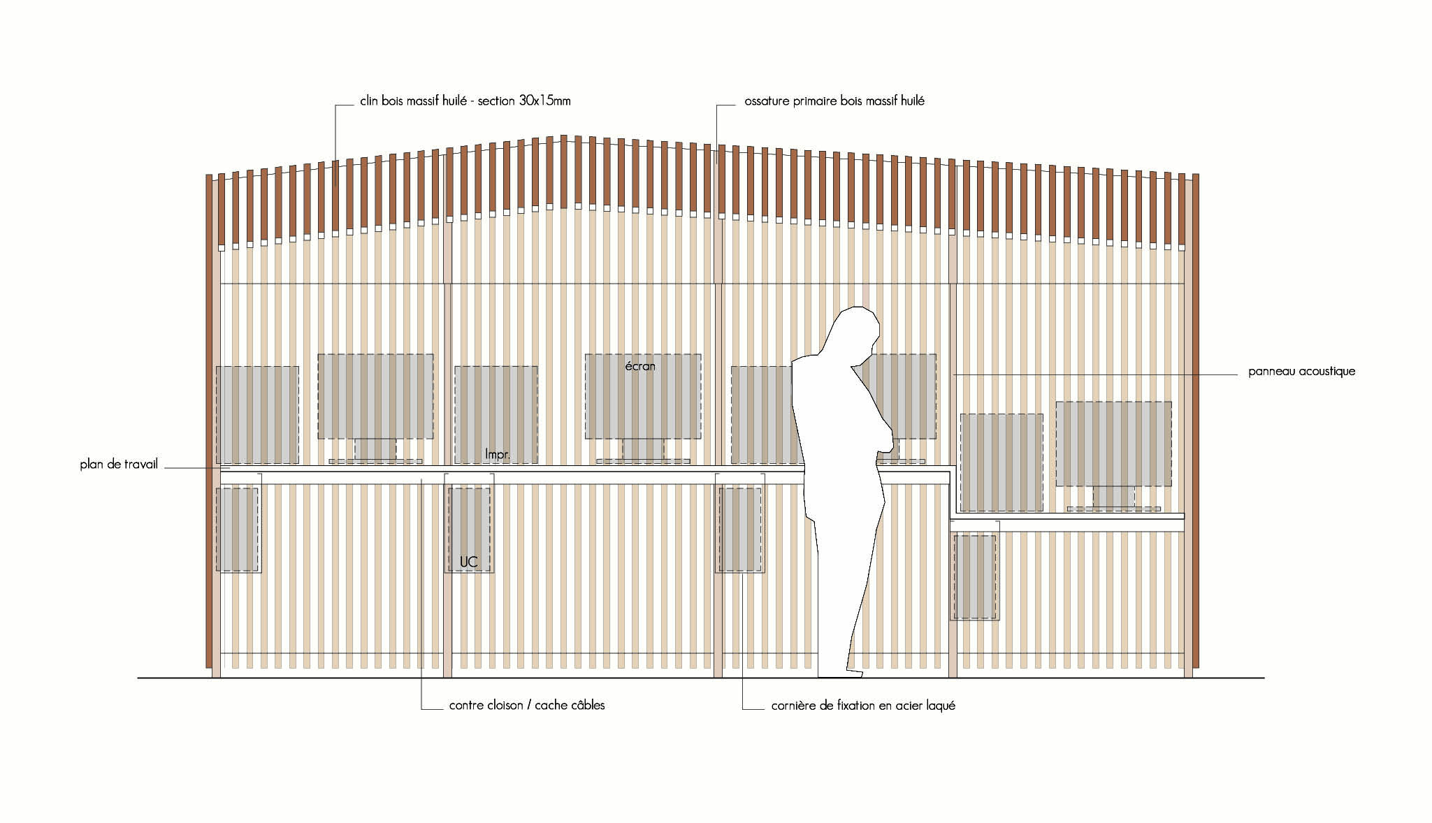 Le hall d'accueil de ce service public est un lieu très sensible faisant l'objet de fréquentes agressions. Dans ce contexte nous avons proposé au maître d'ouvrage de réaliser des chrysalides enveloppantes en bois afin d'introduire les visiteurs dans un espace doux et apaisant. Elles agissent comme des cocons à l'acoustique traitée par le bois et à une impression de protection et de bienveillance tout en laissant passer la lumière directe du soleil sans jamais agresser. Seul le bois pouvait répondre à ce challenge.