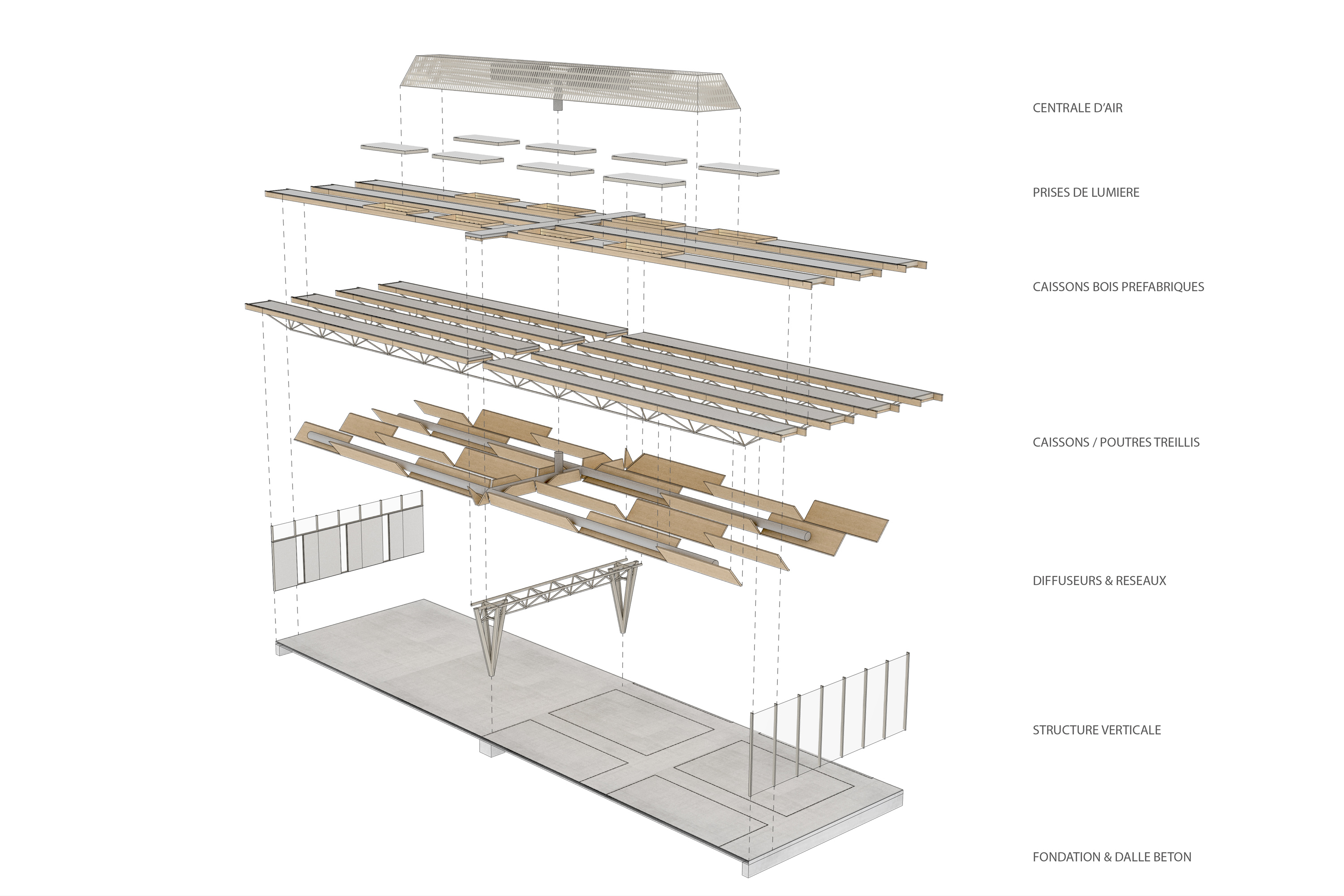 Descriptif technique : Conçu pour être réalisé en seulement 7 mois, les principes du projet ont été dictés par une logique rationnelle et optimum. La charpente est constituée d'une poutre centrale en métal et de 32 poutres transversales en lamellé-collé et treillis métallique. La toiture en panneaux de CLT joue le rôle de diaphragme répartissant les efforts sur les poteaux centraux. Les façades vitrées sont réalisées par des panneaux de 2,5 x 6 m de haut et les parties opaques par des MOB bardés à l'extérieur par un métal déployé. PEFC (Gestion forestière durable) FSC (Gestion forestière responsable) NF Contreplaqués (CTBX - CTBC) NF Bâtiments tertiaires