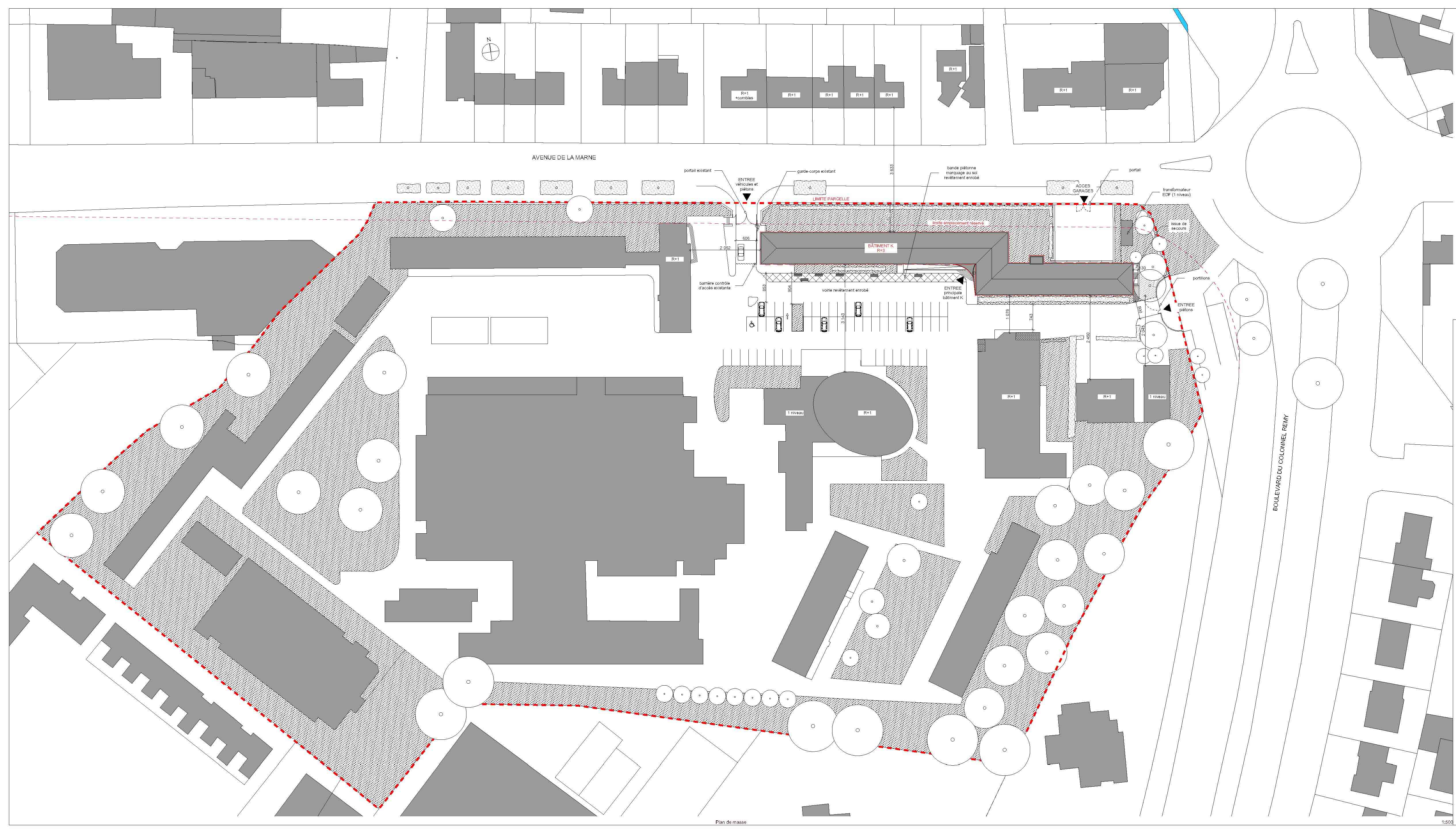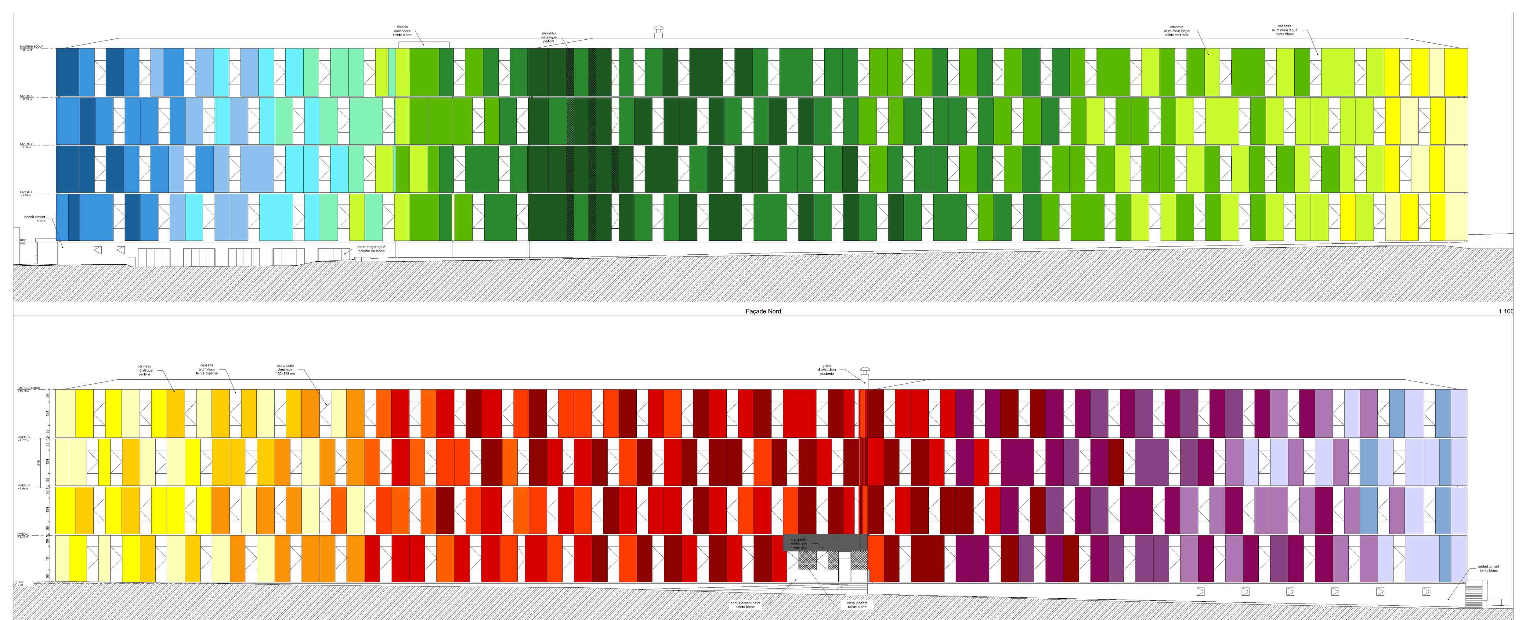 Descriptif technique : L'agence NOMADE architectes unifie les façades existantes très différentes. Le bâtiment a été redécoupé par une trame rationnelle de panneaux en aluminium, perforés ou pleins. La variation des nus des cassettes crée du relief et casse la linéarité. D'un point de vue technique, les cassettes sont fixées sur des panneaux en ossature bois de grandes dimensions, préfabriqués en usine. Cela permet notamment de répondre aux exigences d'un chantier en site occupé.