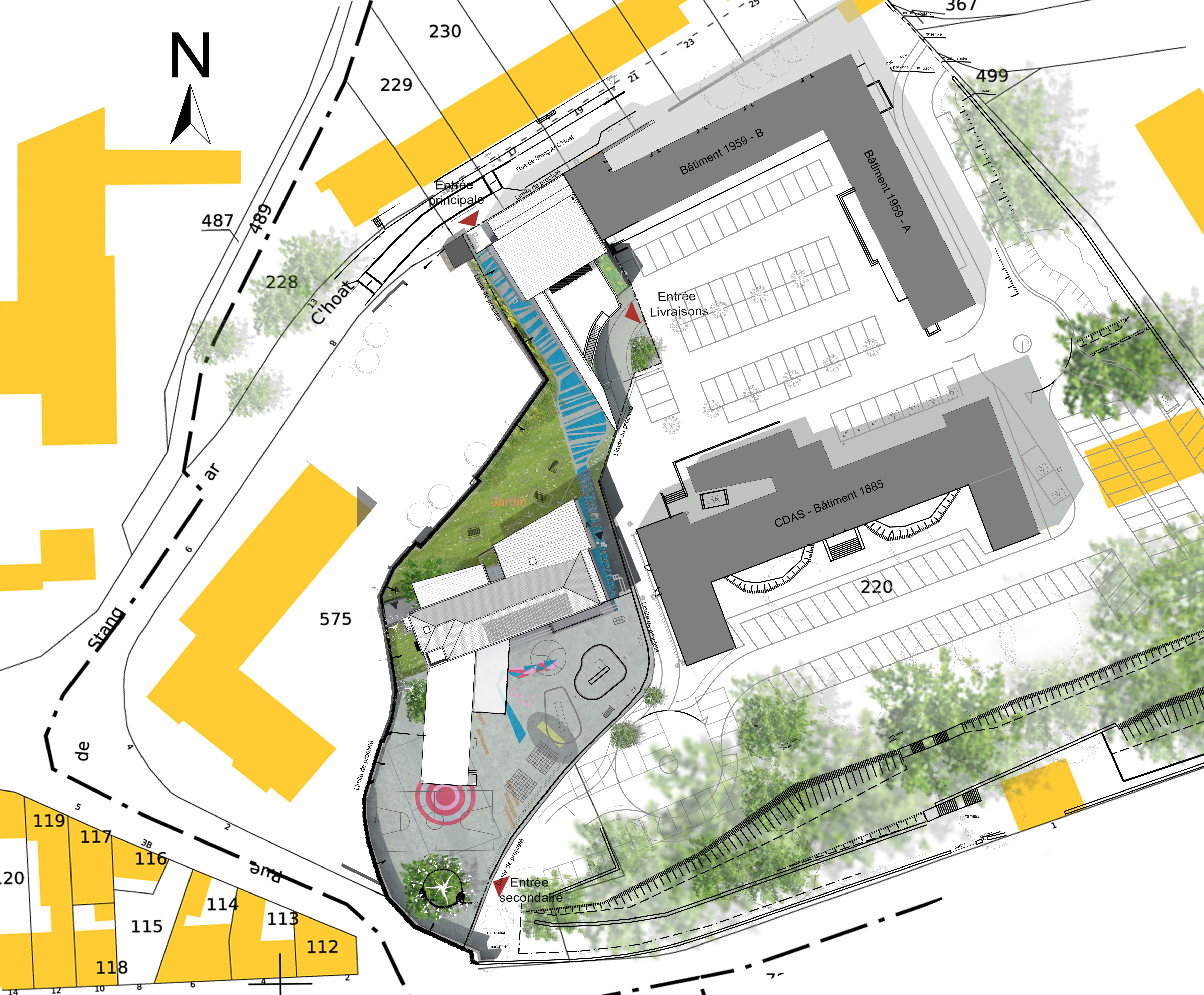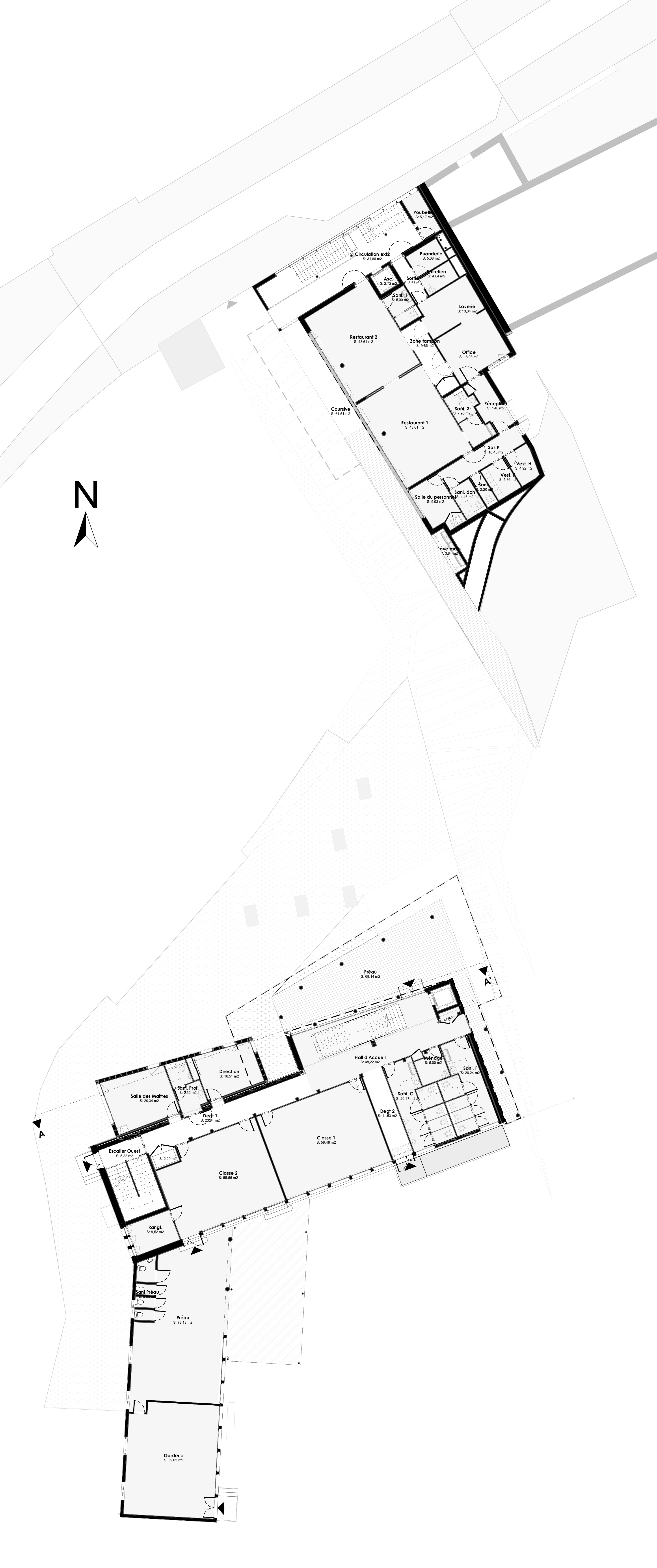 Cette école de quartier demeure cachée dans ses hauts murs. Masse blanche maçonnée, mur de pierres sèches, bâtiments des années cinquante et soixante, l’école a pour projet de s’ouvrir à la ville… Nous avons ici un terrain de jeu passionnant : une richesse d’ambiances et de matières, un mélange calculé de minéral, de végétal et d’urbain, une association de périodes et d’écritures d’architecture, dégagés par l’ensemble de l’environnement. C’est le pari d’offrir une école contemporaine, humaine et chaleureuse, ouverte au quartier.