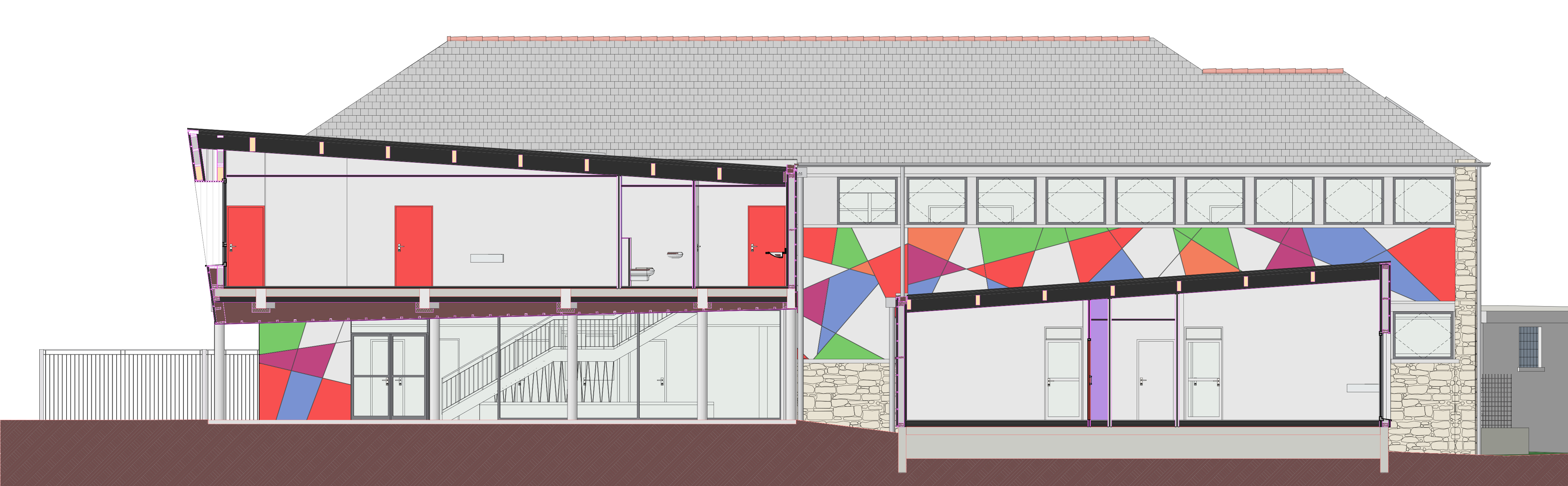 Descriptif technique : Charpente en composite bois massif de pays / épicéa lamellé collé. Habillage des façades en bardage mélèze restant brut non traité sur film pare-pluie et isolation en laine minérale. Mélèze raboté type AUTHENTIC des vents SILVAL BP sans finition ni traitement, profil claire voie vertical SOLEA 27X125mm fixation caché. Habillage en bardage en stratifié massif de couleur. Panneau TRESPA Type Météon. Habillage des sous-face de auvent en planche de mélèze.
