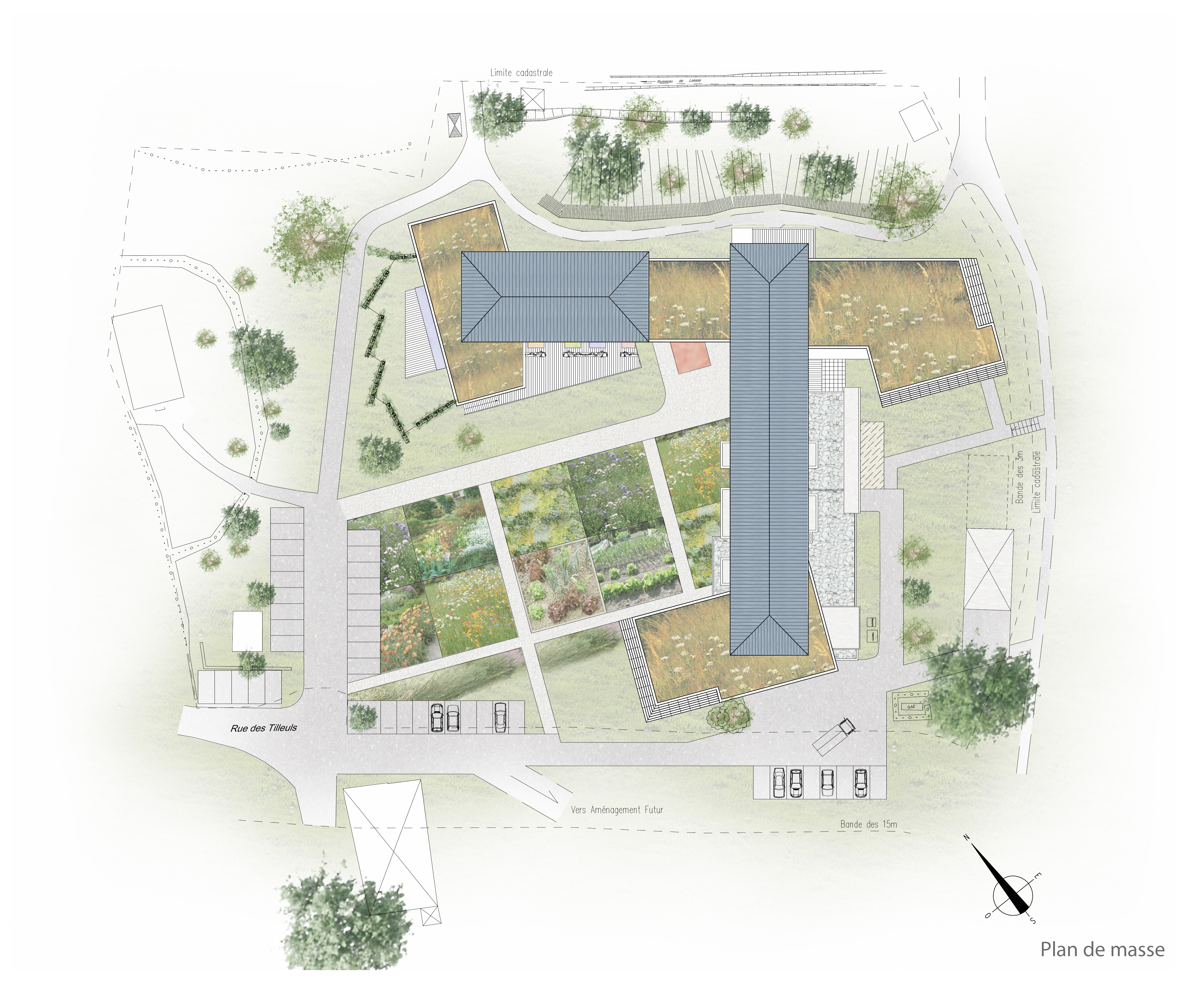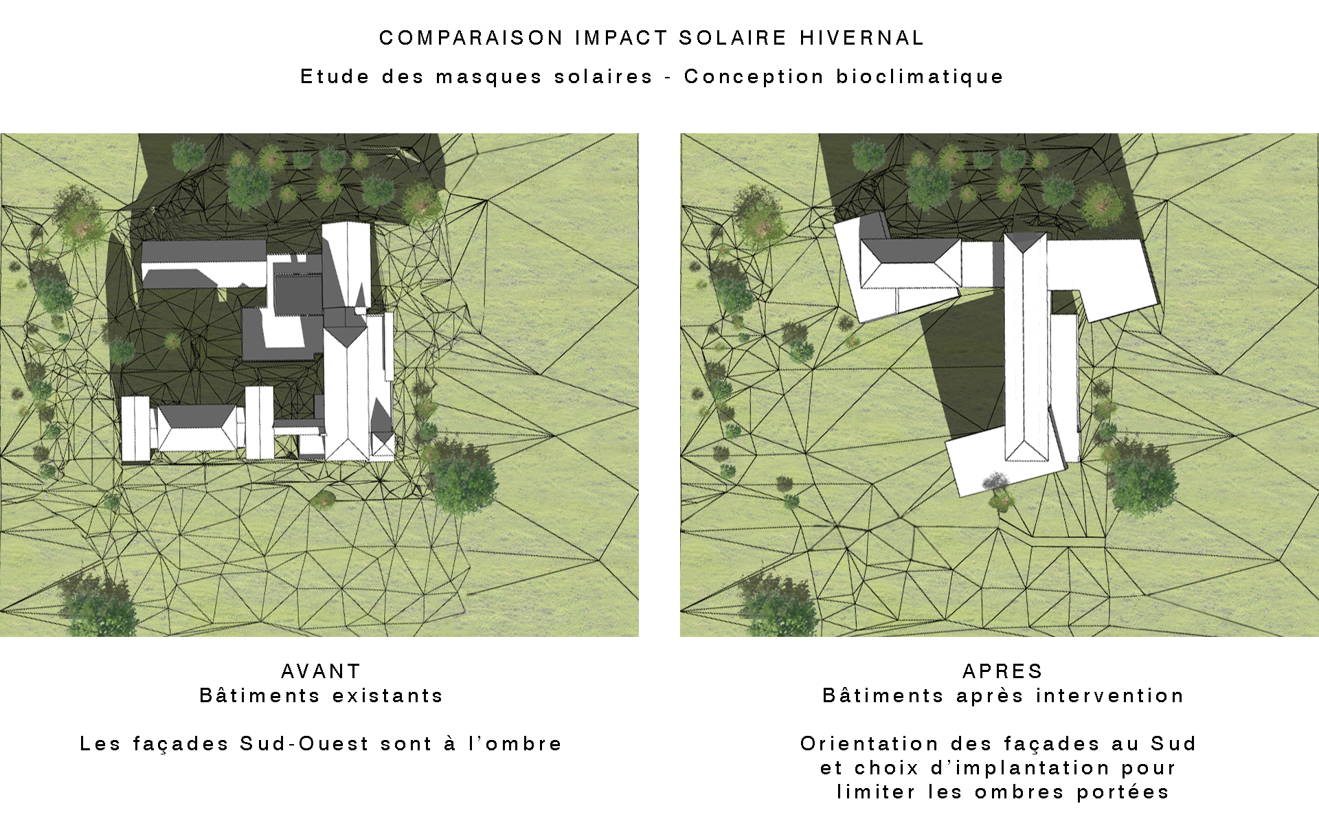 L’implantation des bâtiments en extension, et les interventions lourdes sur les existants reposent sur les principes de base de l’architecture bioclimatique. La proximité du château imposant une toiture en pente+ardoises, le projet est composé d'une imbrications de volumes zinc/ardoise et de volumes bois/toitures terrasses. La porosité entre intérieur et extérieur est essentielle dans un EHPAD. Des lieux chaleureux sont créés tant à l'intérieur qu'à l'extérieur offrant des lieux de rencontre avec des vues privilégiées sur le paysage environnant. (Lieux de vie, jardins, grandes terrasses, …).