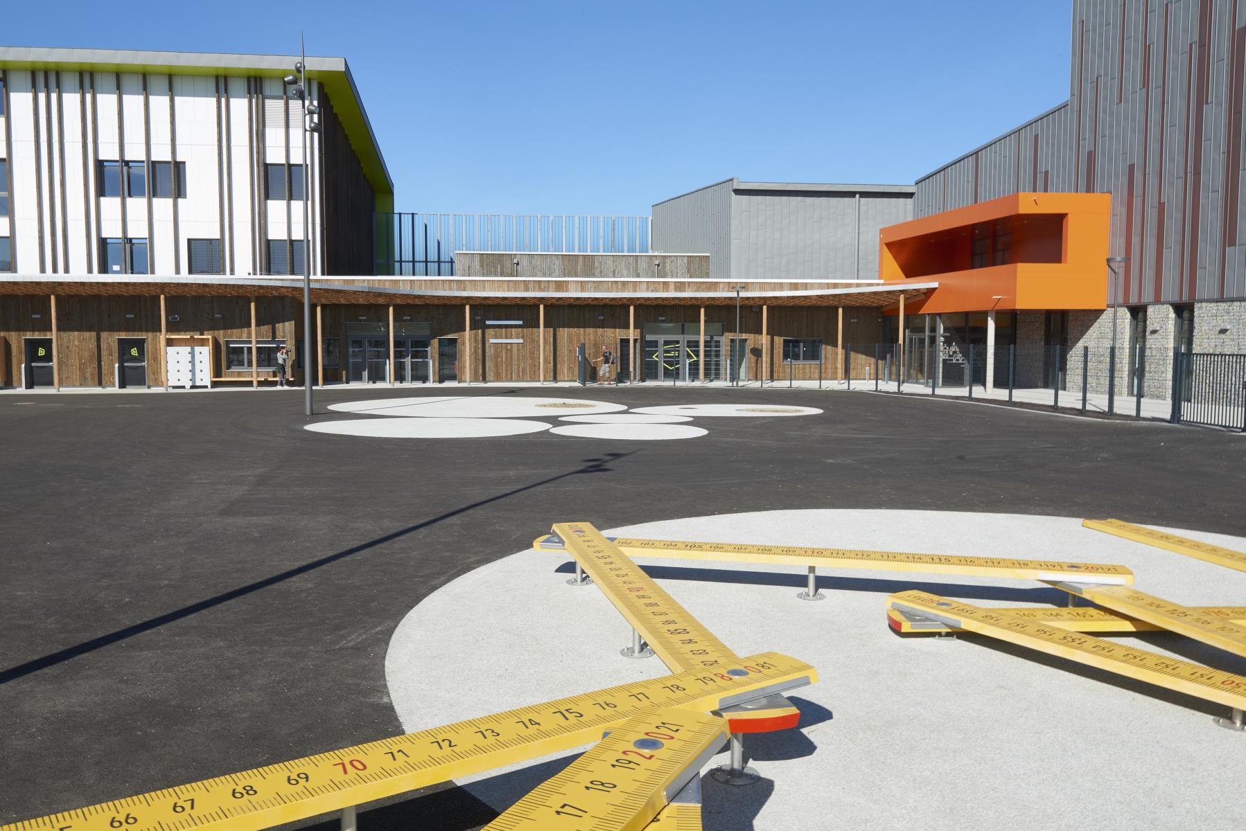 Descriptif technique de l'aménagement : Nous défendons pour les deux programmes une approche constructive pragmatique : le bois est utilisé lorsqu’il représente une solution constructive pertinente et pleinement justifiée. Le bois est ainsi utilisé pour les niveaux d’enseignement du collège (ossature des façades, planchers, charpente), le préau, les grands volumes du CDI et de la salle polyvalente, les élévations et la charpente du gymnase et de la SAE.