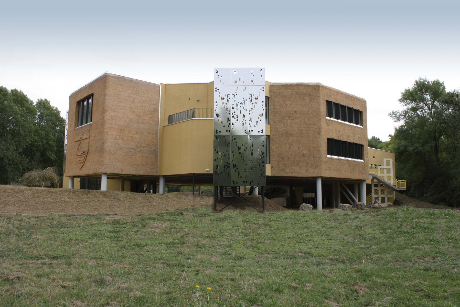 Descriptif technique : Dans le cadre d'un ERP, deux techniques innovantes sont utilisées pour les façades : Isolation en Chaume sur tasseaux bois et OSB fixés sur les façades béton verticales, et isolation Fibre de bois sur façade béton alvéolaire. La configuration particulière du support a induit la mise en place une ossature bois garnie de fibre de bois souple (PavaFlex de chez Pavatex) et des plaques de fibre de bois compressé rigide vissées sur l'ossature (Pavawall de chez Pavatex). Technique non traditionnelle. Un enduit chaux de finition a été appliqué sur l'ITE. CTB LCA NF Fenêtres Bois et Portes Extérieures - Acotherm NF Parquets