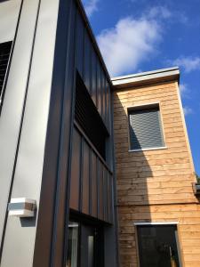 Maison dont le volume principal accueille les pièces de vie au rez-de-chaussée ainsi qu’une mezzanine et une chambre d’appoint à l’étage. Deux modules satellites viennent s’y adosser à l’Est à l’Ouest. Les pièces de vie sont baignées de lumière grâce à de larges baies vitrées permettant l'accès à une terrasse en bois exposée Sud-Est à l’abri des vents dominants. Le volume principale respecte les règles locales d’urbanisme concernant les hauteurs maximales constructibles et les souhaits du maître d’ouvrage désirant avoir à la fois un maximum de volume à l’étage mais également un toit 2 pentes.