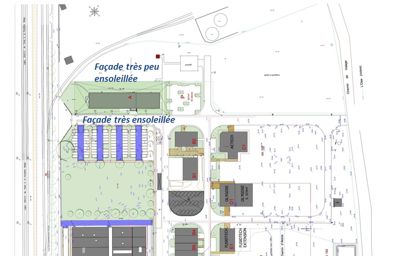 Descriptif technique : Parois composées de : - panneaux de bois avec structure en peuplier robusta section 145*45, - panneaux intérieurs de contreventement formant aussi parement intérieur apparent - Isolation en laine de bois extérieure formant pare-pluie - Remplissage des panneaux par cellulose insufflée en atelier - Lattes et contrelattes extérieurs comme support de bardages - Bardages en aulne par lames verticales à rainures et languettes (2 profils) - Panneaux d’habillage en panneaux minéraux colorés (3 teintes bleues) - Menuiseries aluminium à rupteurs thermiques Uw moyen 1.2 - Brise-soleil orientables à commande manuelle pour les façades sud - Habillages intérieurs en planches de peuplier (encadrements, tablettes et linteaux) Installation de ventilation double flux comprenant : - Centrale double flux posée sur la terrasse intermédiaire - Pénétrations dans le bâtiment par percements des façades et dalles - Distributions intégrées dans les faux-plafonds ou en soffites ainsi que dans le mobilier existant - Equilibrage des débits en fonction des usages des bureaux