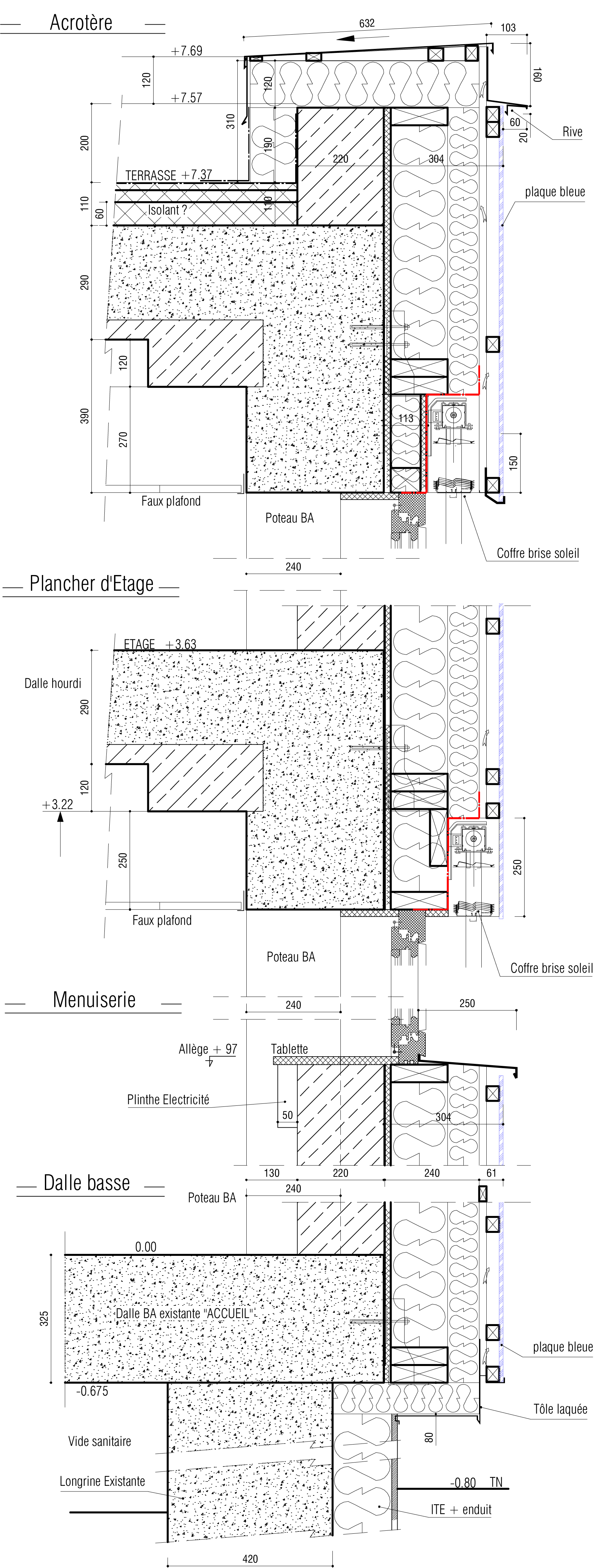 Le projet de rénovation thermique de l’Hôtel des projets a porté sur : - La démolition avec désamiantage des façades existantes - La mise en oeuvre d’une isolation par l’extérieur - La pose d’un auvent pour l’entrée - L’installation d’un réseau de ventilation double flux Une analyse de cycle de vie a été réalisée préalablement à l’étude de rénovation. Elle a fixé des objectifs de minimisation de l’impact carbone par l’emploi d’éco-matériaux. Cette ACV a été complétée par une étude thermique qui a fixé des objectifs de réduction par 3 des consommations de chauffage (80 kwhEP/m².an contre 215 avant les travaux) et de réduction par 3 de l’impact carbone (9 kg.éqCO2/m².an contre 27 avant les travaux). Le projet de réhabilitation a été inscrit dans les objectifs du Territoire à Energie Positive pour la Croissance Verte dont l’Agglomération de la Région de Compiègne est lauréate. Les façades d’origine étaient composées de bandeaux de menuiseries en aluminium et d’allèges maçonnées masquées par des panneaux de verre comportant des joints amiantés. La démolition a donc comporté un volet désamiantage. Les nouvelles façades ont été conçues pour réaliser une enveloppe thermique continue tout en réduisant les surfaces vitrées pour les adapter aux usages réels. Les façades ont donc été composées à partir des usages internes avec une recherche de rythme et de variété dans l’alternance vide-plein. Les matériaux utilisés sont diversifiés suivant leur nature et leur couleur. Les bardages bois présentent deux profils différents. Ils sont rythmés par des bandeaux colorés (3 bleus du sombre au clair du bas vers l’haut). Les menuiseries sont de deux couleurs associés au matériau de façade soit rouge avec un profil de bardage à gorges et jaune avec les bandeaux bleus. L’auvent souligne l’accès principal avec un jeu de courbes qui distrait la rigidité originelle du bâtiment. Le chantier a été réalisé en site occupé en deux phases pour permettre l’adaptation des usages durant les travaux. La coordination des travaux a été effectuée en tenant compte également des règles de sécurité associées au désamiantage. Le chantier ayant été réalisé en hiver, les espaces ont été isolés pour limiter les inconforts thermiques. Enfin, pour répondre aux objectifs du TEPCV, le chantier a du être livré dans des délais réduits. Pour la distribution de la double flux, le soufflage a été réalisé le long des façades en utilisant principalement les espaces libres en faux-plafonds tandis que la reprise d’air a été réalisée le long du couloir central et est intégrée au mobilier existant. La centrale de traitement d’air a été placée sur la terrasse intermédiaire pour réduire les linéaires de canalisations et en faciliter l’accès.