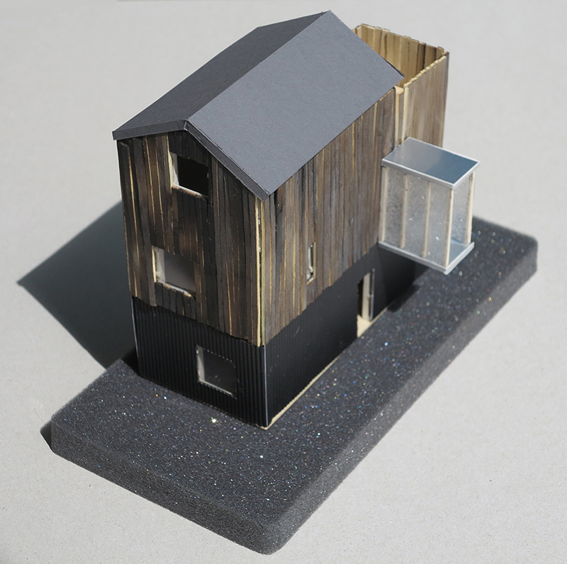 Conception de 3 chambres sur 3 niveaux. Cette extension est séparée de la maison existante par une impasse piétonne. Les 2 constructions sont reliées par une passerelle en polycarbonate. L’extension est construite en ossature bois avec une toiture à deux pentes en ardoise. Les façades sont réalisées en bardage de tôles métalliques ondulées pour le rez-de-chaussée et en lames de Douglas pose verticale pour les deux autres étages. Les lames sont brûlées grâce à la technique japonaise du shou-sugi-ban qui permet de protéger naturellement le bois par carbonisation.