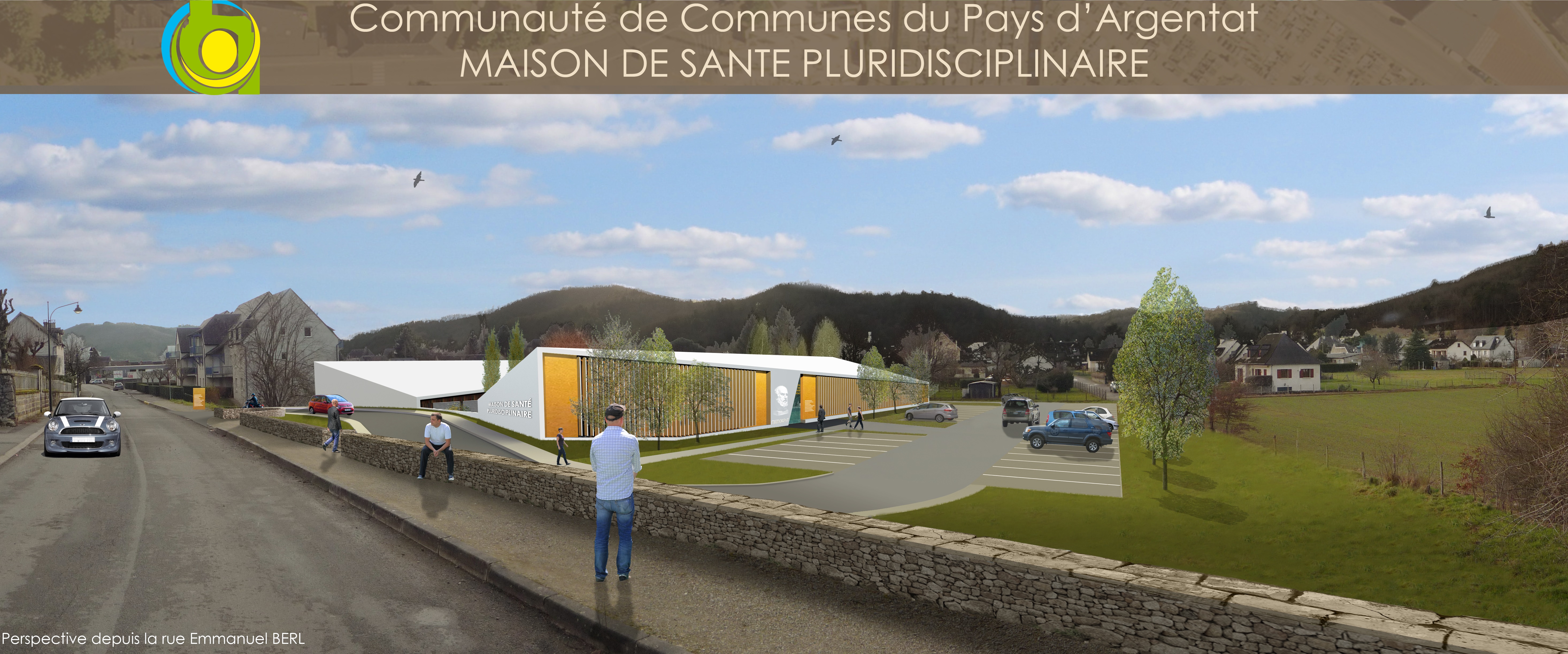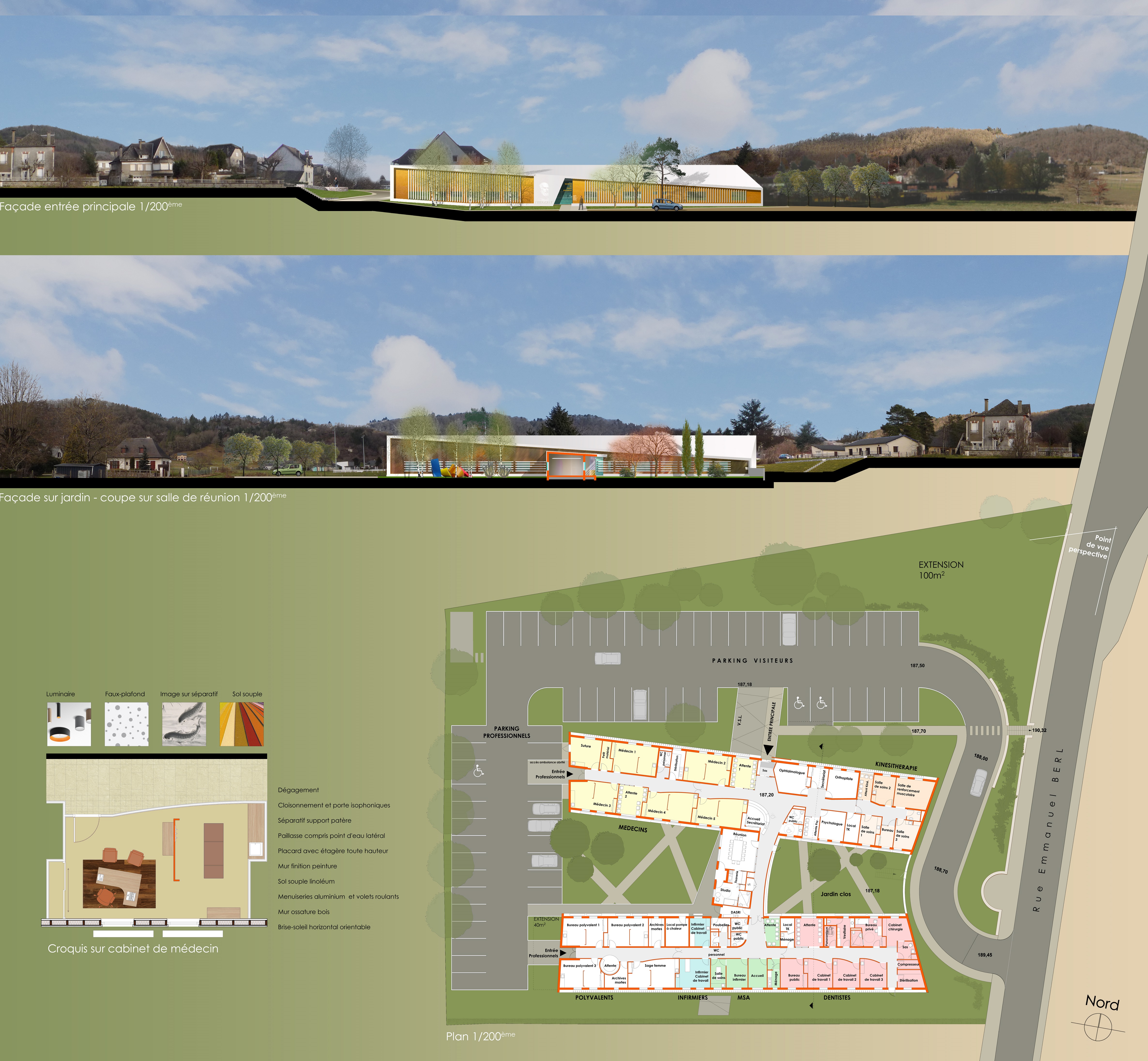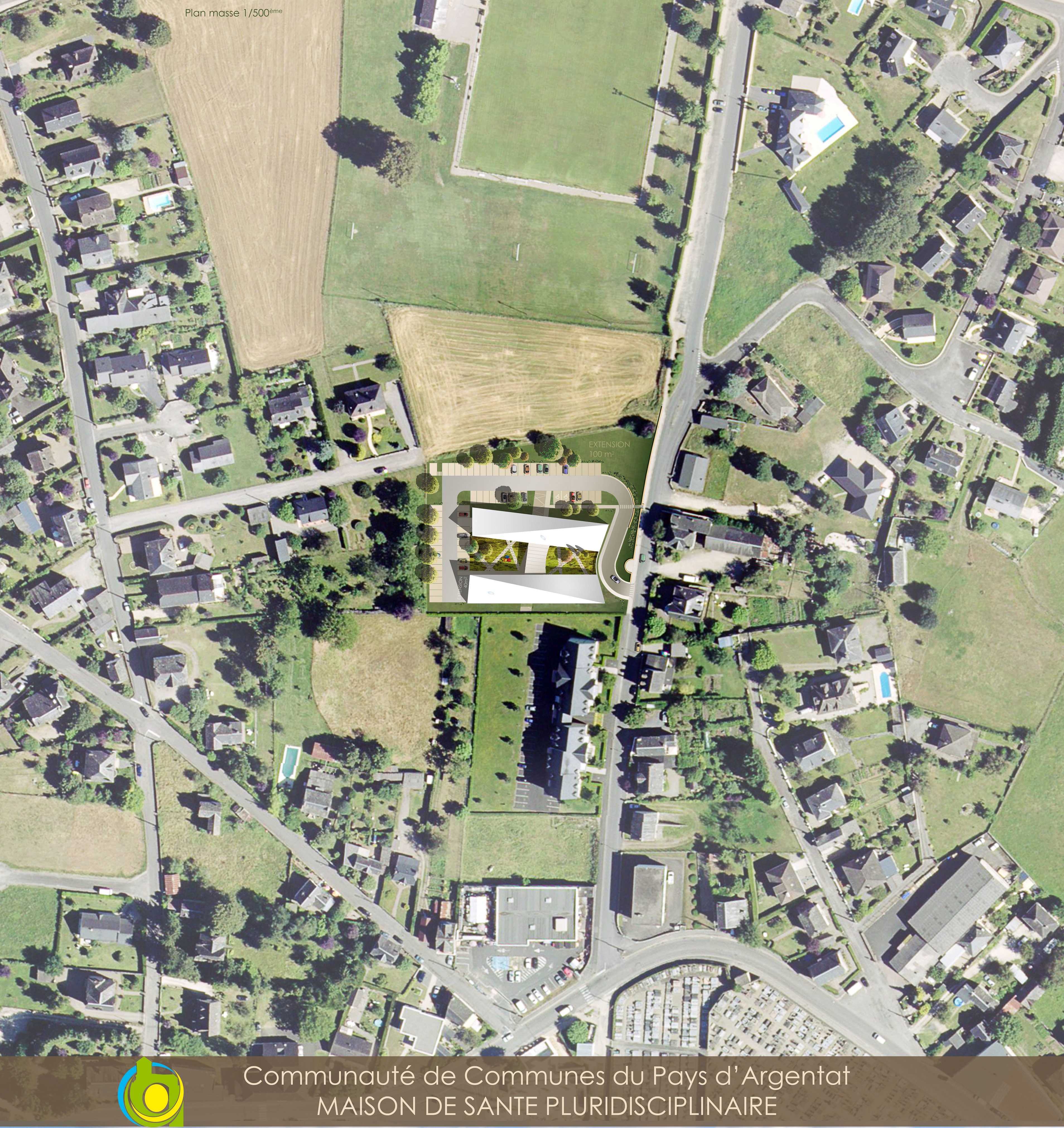 Les objectifs urbains du maître d’ouvrage sont une intégration pertinente au paysage, un accès véhicules et une liaison piétonne avec le centre ville, un stationnement sur la parcelle et non sur la rue, ainsi qu’une bonne repérabilité pour le projet. La monumentalité du bâtiment est donc maîtrisée par un travail sur l’échelle du projet et son calage altimétrique qui lui apporte sa juste place et son urbanité en regard des éléments construits alentour. L’intégration paysagère recherchée assure une transition douce entre la ville structurée et l’espace à dominante végétale ouvert sur le stade et les collines boisées au Nord. Le programme comprend : - des cabinets de médecins et professionnels de santé (kinésithérapeute, dentiste, infirmières, sage-femme, ovtalmologue, orthoptiste et psychologue), - trois bureaux polyvalents pour accueillir d’autres professionnels de santé, - des locaux destinés à la MSA, - des locaux nécessaires au bon fonctionnement de l’ensemble (locaux collectifs d’attente et de circulation, salle de réunion, studio de garde et locaux techniques), - un double parking dédié (public et professionnels) La problématique du programme réside dans la définition des séquences d’approche du projet. La différence d’altitude entre domaines public et privé nécessite un premier parcours descendant qui ne permet pas une perception directe d’une façade “principale” classique. L’organisation du plan masse permet de développer une séquence enrichie, depuis la voie d’accès, lorsque la 5ème façade (toiture) devient façade première (au sens de la reconnaissance du bâtiment) et amène à la façade principale d’entrée avec une vaste esplanade formant parvis.