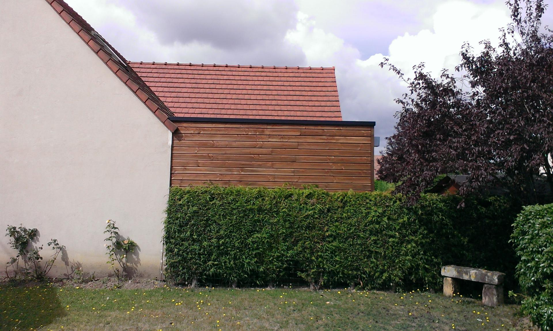 Création d'un Garage suite à une première extension faite en 2009, nous avons gardé l'esprit de celle ci, en reprenant le même bardage "Douglas teinté marron par autoclave" qui a une parfaite tenue en bord de mer. Menuiserie Extérieur, avec une porte de service PVC en pose MBOC profils Aluminium. Nous avons gardé une haie mitoyenne pour ne pas dénaturer la vue du voisin. Ce qui à compliqué la pose du mûrs au pied de cette haie.
