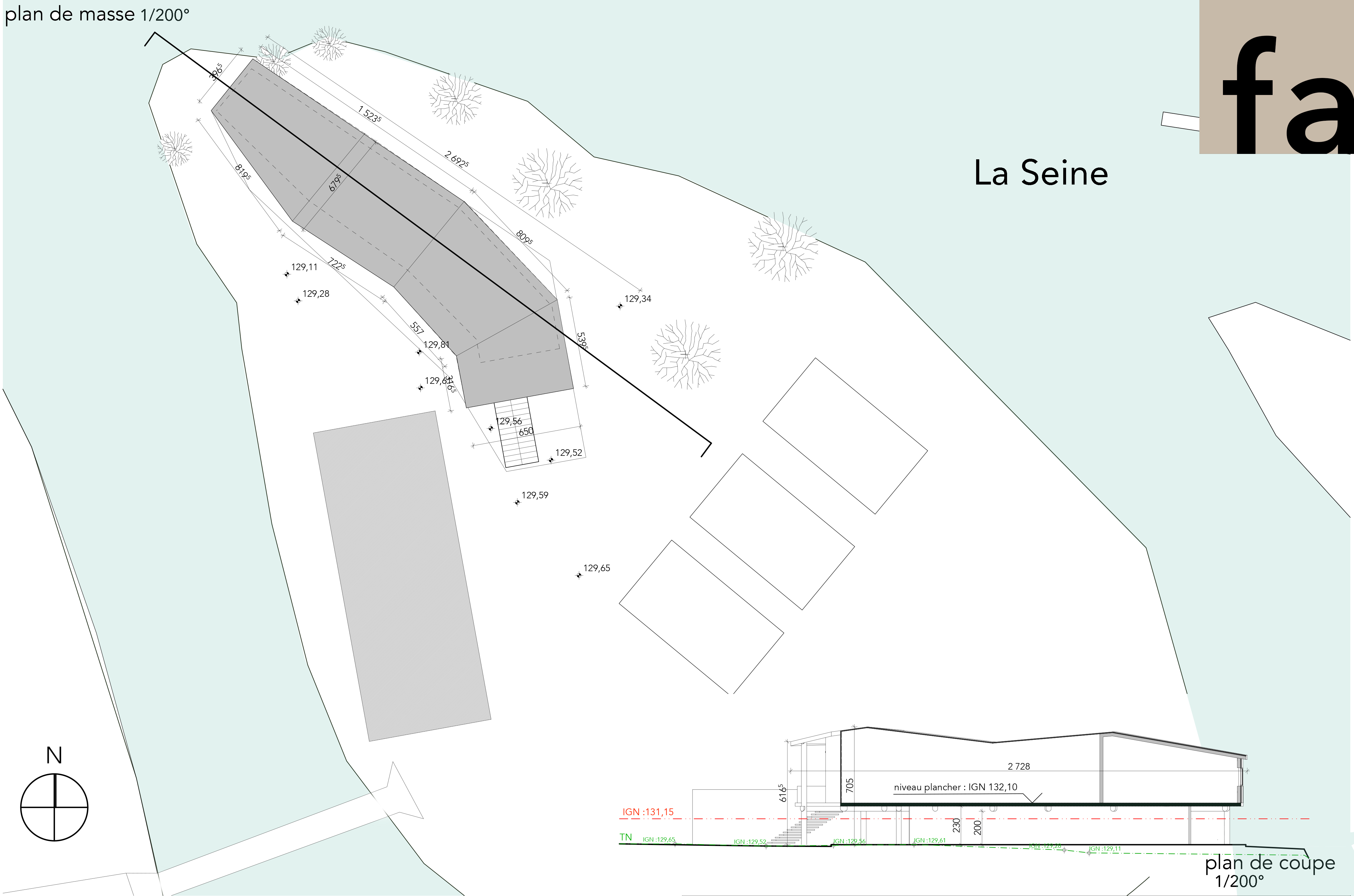 Edifiée sur une île de la Seine, la construction associe une forme architecturale contemporaine, à un matériau brut, mis en œuvre selon la technique constructive ancestrale. Le bâtiment a été construit pour remplacer un ancien "chalet" vétuste de la base nautique qui accueille des colonies de vacances. Cet équipement a plusieurs rôles : celui de stockage du matériel, d’abri des moniteur, de lieu de vigie pour la surveillance des jeunes qui campent sur l’ile. La construction était contrainte par une côte d’inondabilité dégageant de la surface de stockage supplémentaire sous l’étage surélevé.