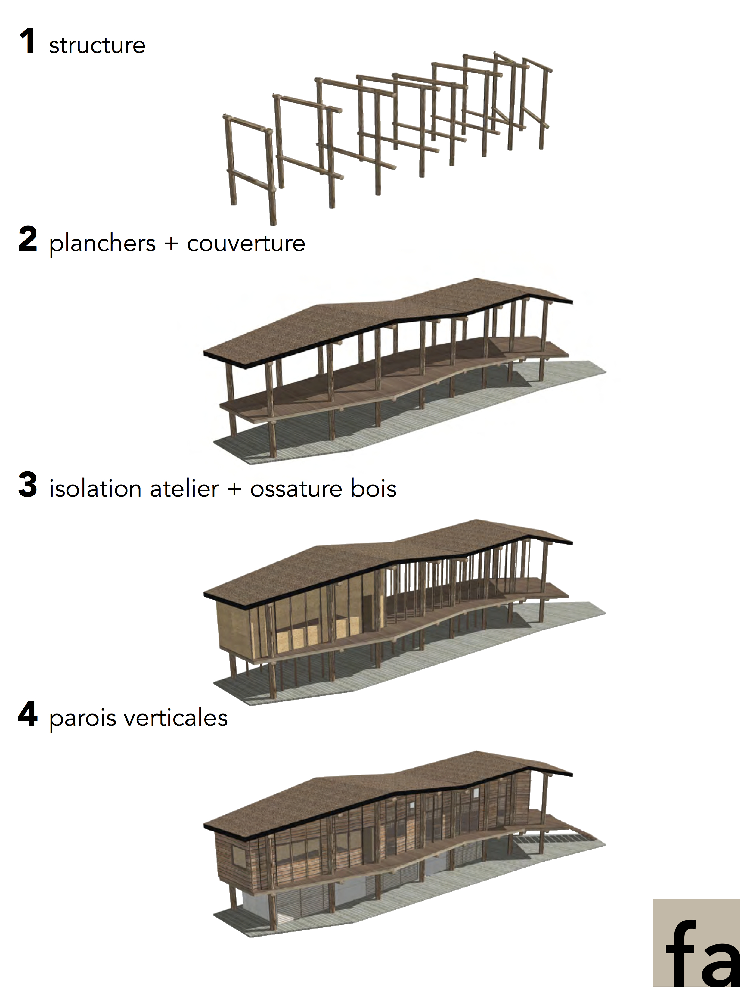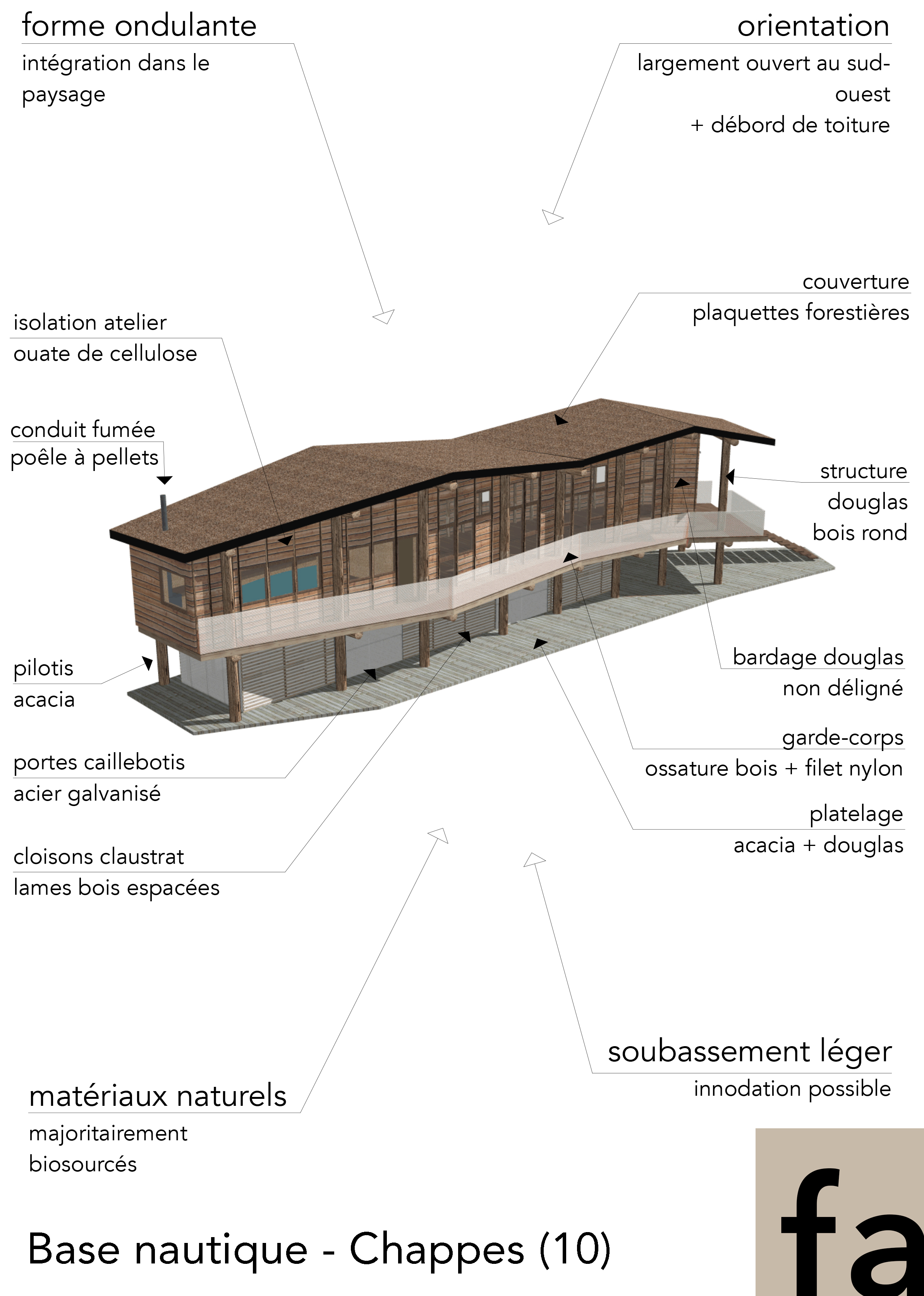 Descriptif technique : Huit travées différentes composent le bâtiment, une se dédouble au nord. Les poteaux sont fixés aux massifs béton par des connecteurs acier. Les contreventements transversaux sont des liens en rondin, les longitudinaux des croix en câble. Le niveau bas est inondable sur 1m50 le local est fermé par caillebotis et bardage claire voie. Le plancher du 1er étage et la couverture forment des débords au sud-ouest protégeant les bois, bardages, menuiseries et régulant la température intérieure en été. La couverture est recouverte de plaquettes forestières en atténuation sonore et isolation thermique.
