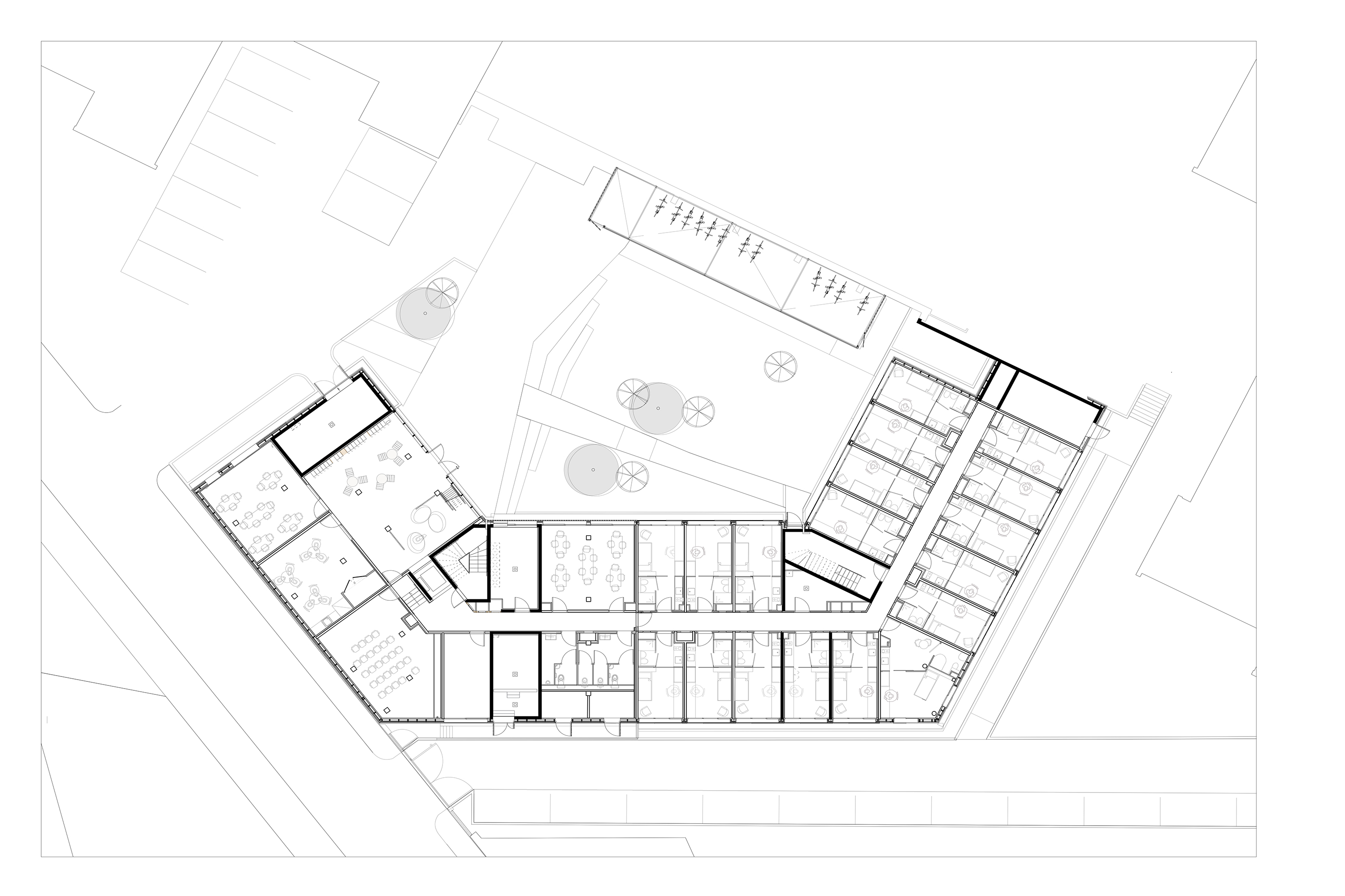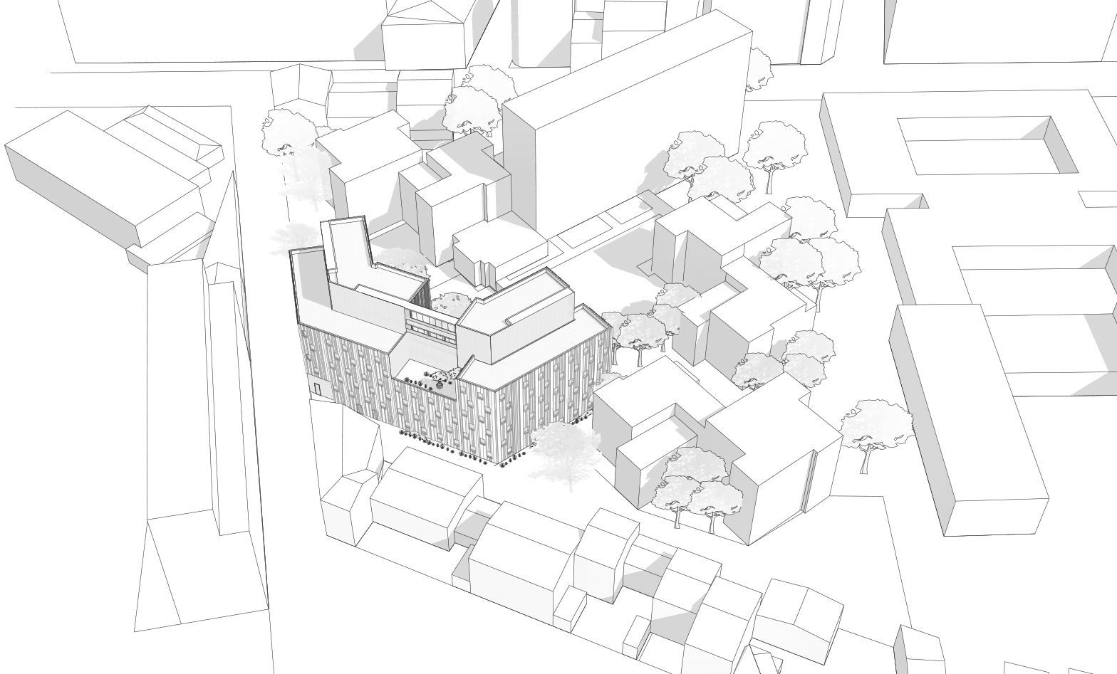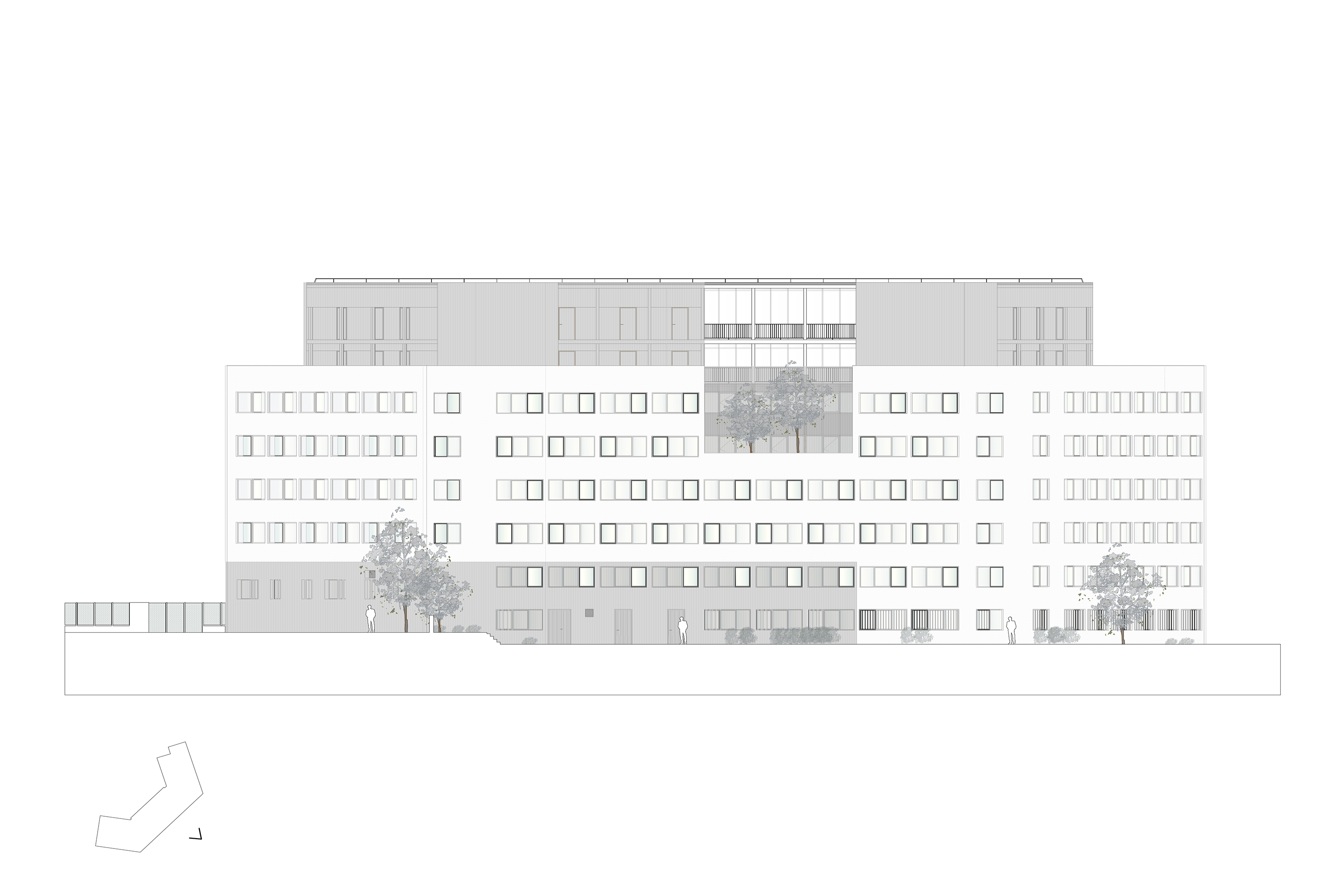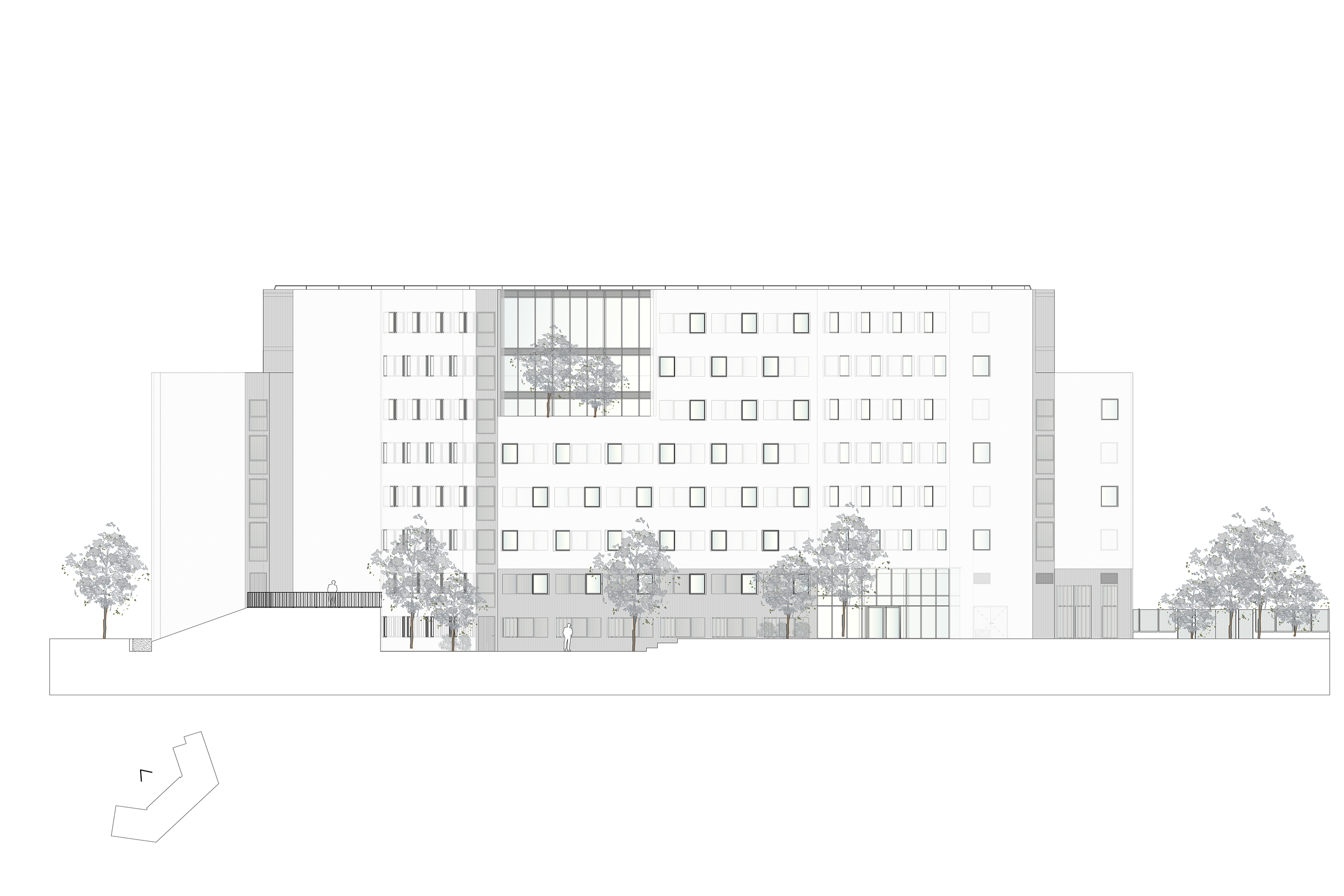 Résidence universitaire R+7 structure bois. Son approche urbaine sensible fait de cet ouvrage de 200 chambres un bâtiment fonctionnel, confortable et ouvert sur la cité. Composé en trois ailes, le dessin propose une grande hauteur en RDC et des attiques sur les 2 derniers niveaux ainsi que des espaces partagés de qualité. L’épannelage du projet vient jouer avec les avoisinants et laisse ces derniers mieux respirer malgré la grande densité du quartier. La majorité des chambres est orientée sur le coeur d’îlot, véritable jardin intérieur apaisé, côté rue, les ouvertures sont privilégiées le long de l’impasse moins bruyante.
