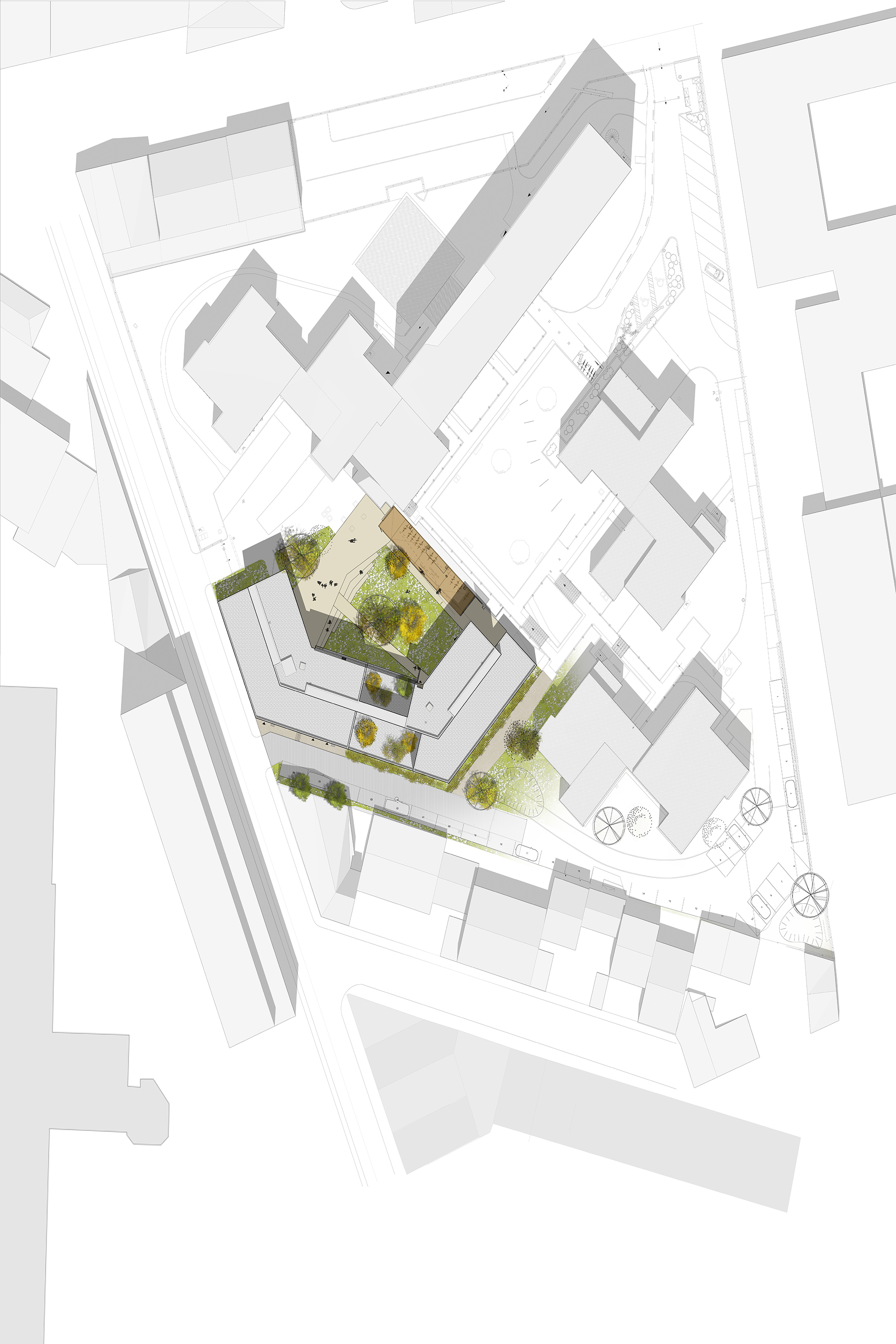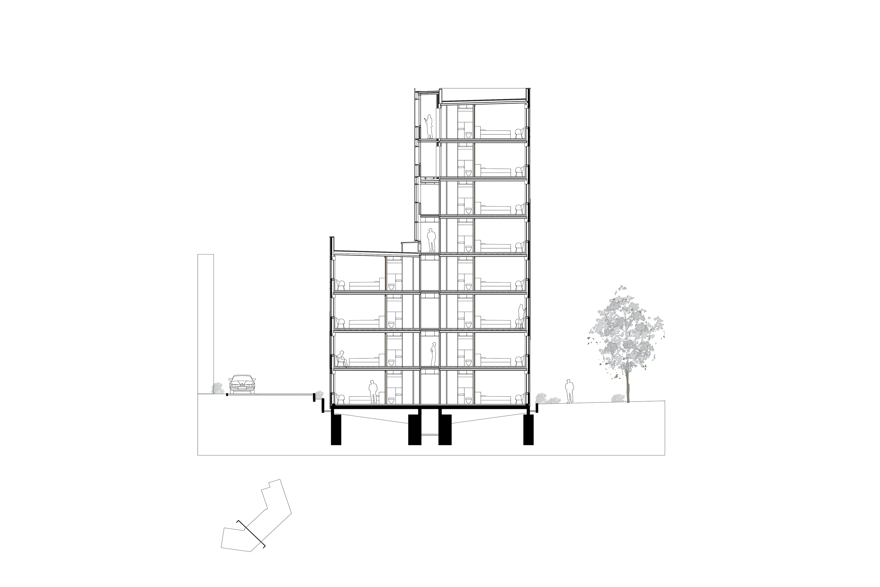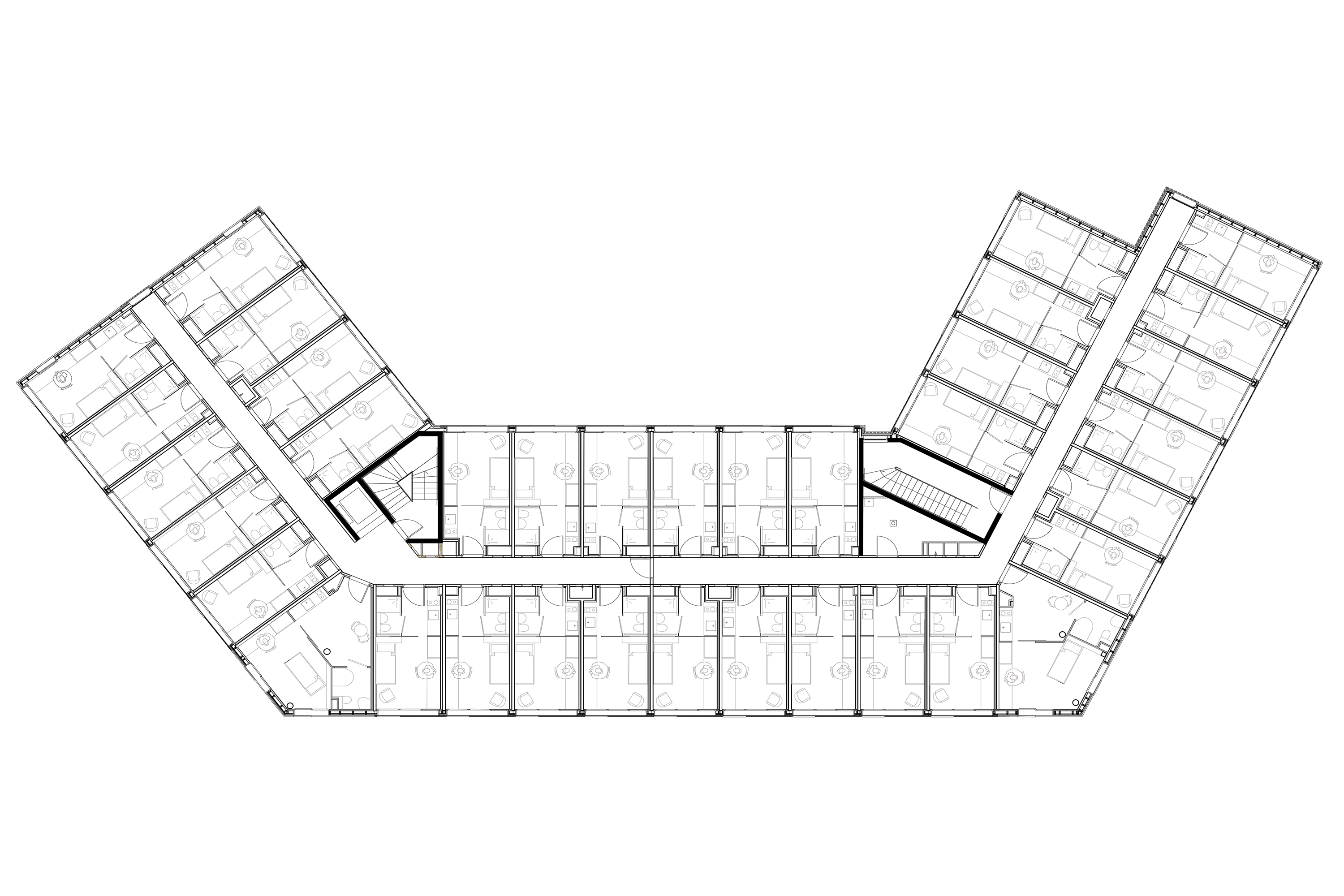 Résidence universitaire R+7 structure bois. Son approche urbaine sensible fait de cet ouvrage de 200 chambres un bâtiment fonctionnel, confortable et ouvert sur la cité. Composé en trois ailes, le dessin propose une grande hauteur en RDC et des attiques sur les 2 derniers niveaux ainsi que des espaces partagés de qualité. L’épannelage du projet vient jouer avec les avoisinants et laisse ces derniers mieux respirer malgré la grande densité du quartier. La majorité des chambres est orientée sur le coeur d’îlot, véritable jardin intérieur apaisé, côté rue, les ouvertures sont privilégiées le long de l’impasse moins bruyante.