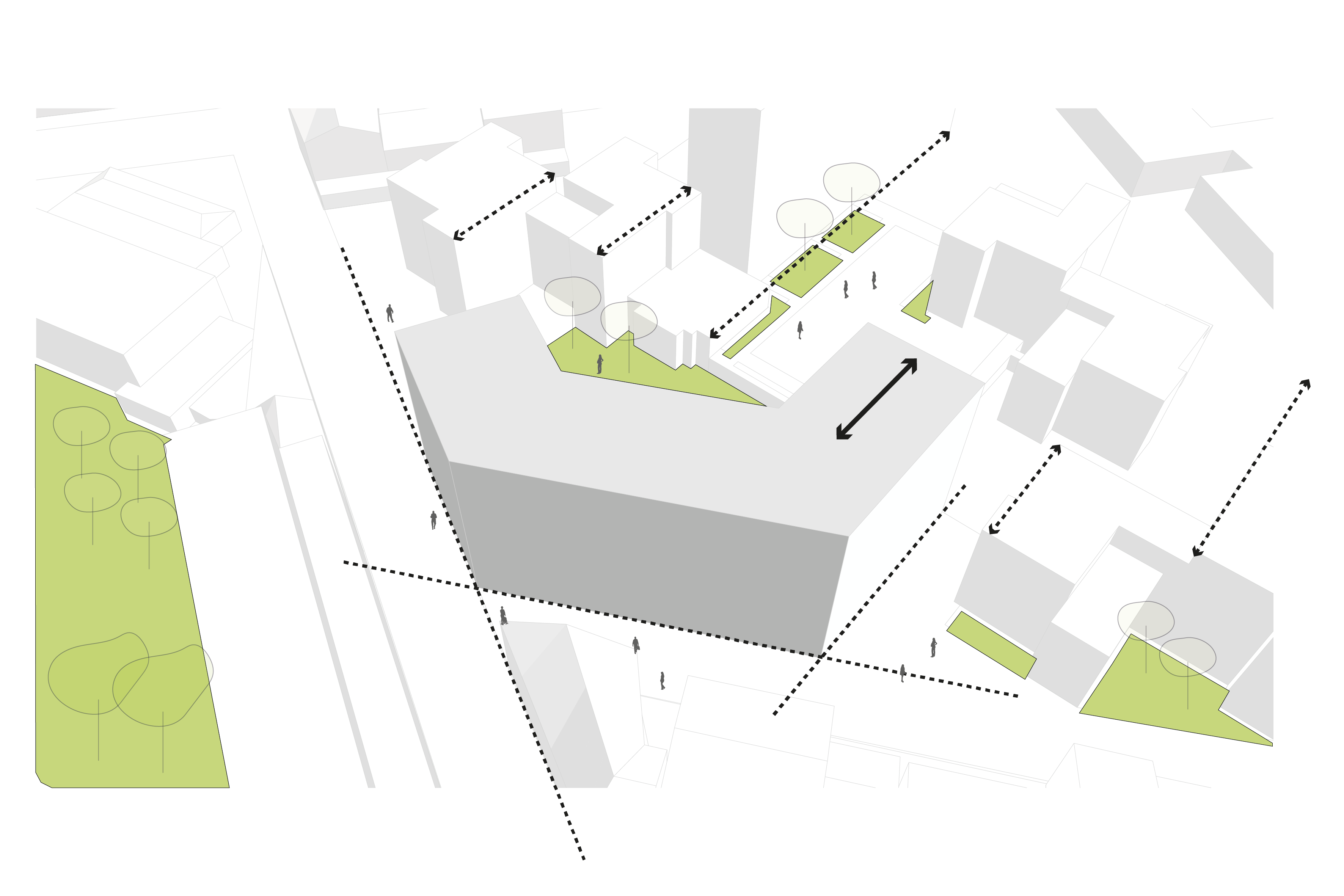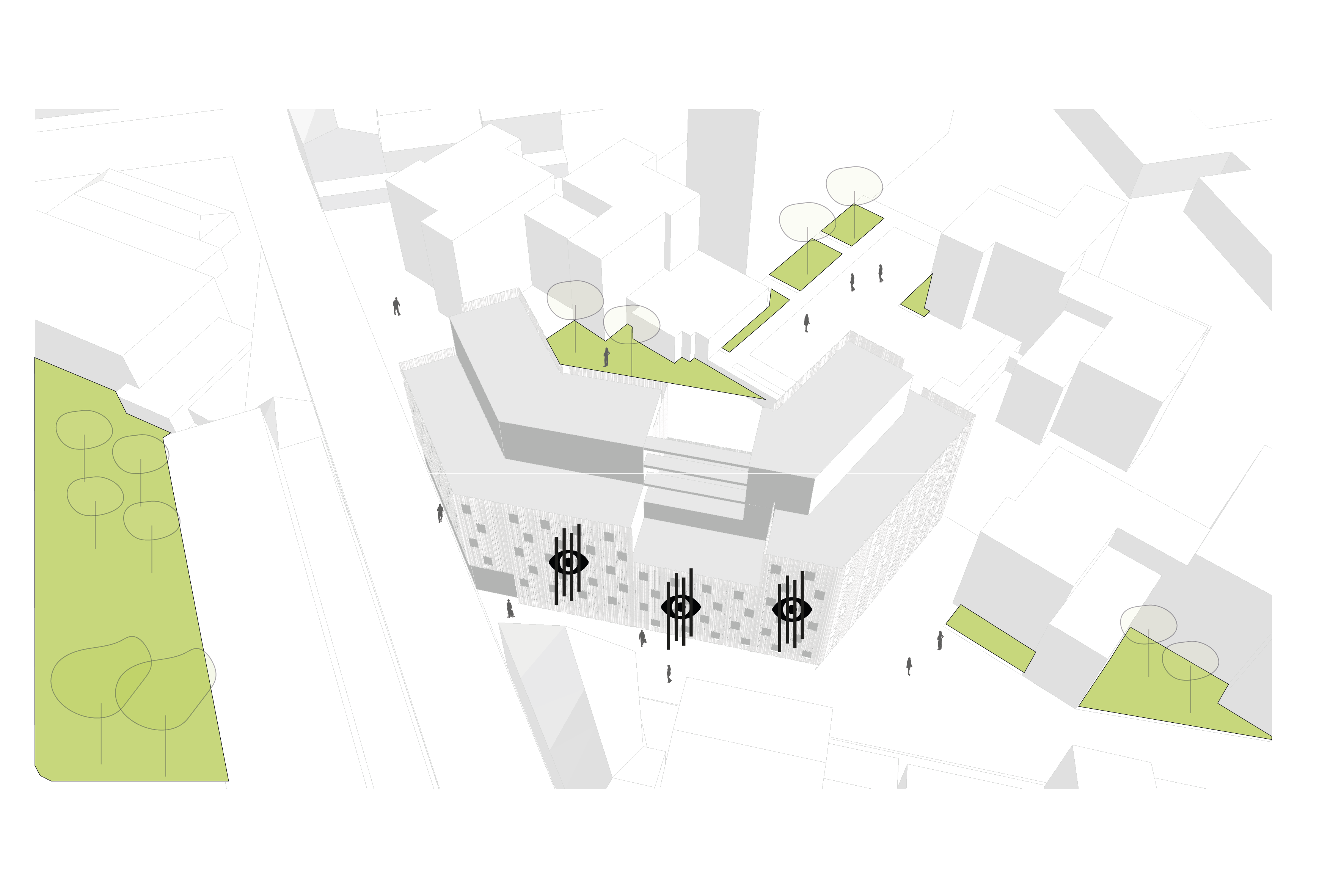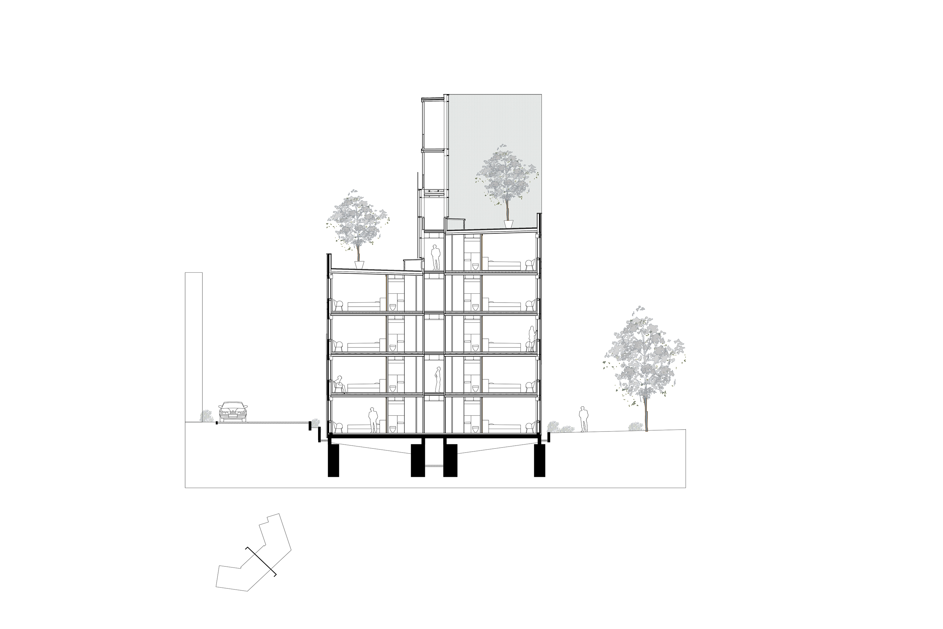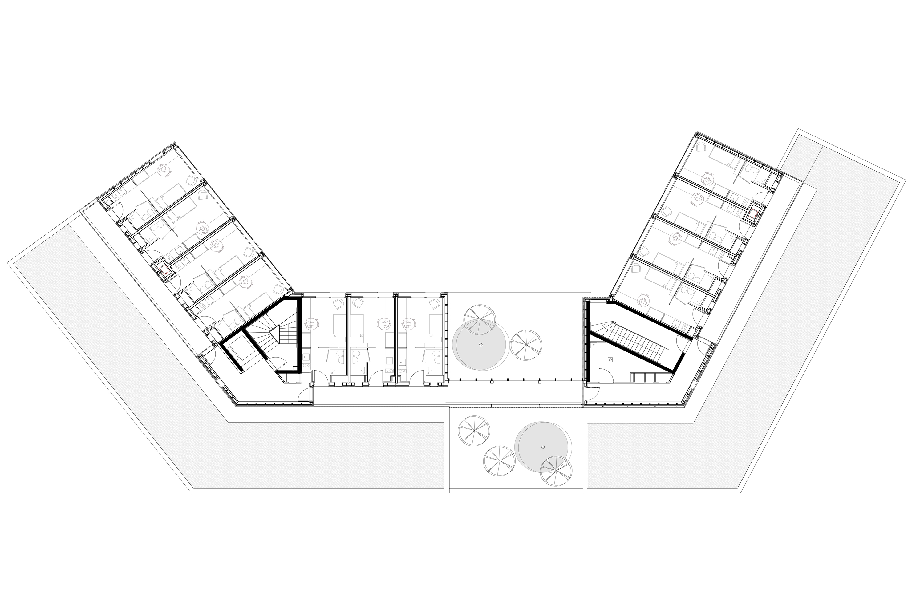 Résidence universitaire R+7 structure bois. Son approche urbaine sensible fait de cet ouvrage de 200 chambres un bâtiment fonctionnel, confortable et ouvert sur la cité. Composé en trois ailes, le dessin propose une grande hauteur en RDC et des attiques sur les 2 derniers niveaux ainsi que des espaces partagés de qualité. L’épannelage du projet vient jouer avec les avoisinants et laisse ces derniers mieux respirer malgré la grande densité du quartier. La majorité des chambres est orientée sur le coeur d’îlot, véritable jardin intérieur apaisé, côté rue, les ouvertures sont privilégiées le long de l’impasse moins bruyante.
