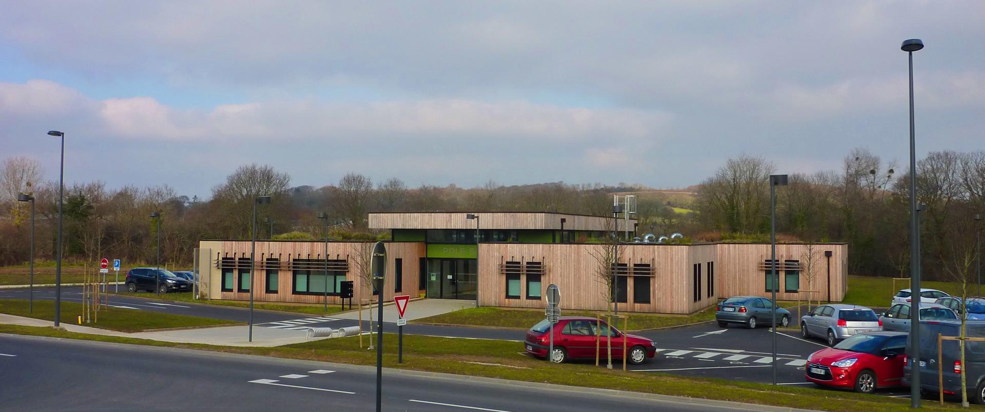Bâtiment situé dans un environnement végétal et bocager très marqué, le bâtiment se fond dans le paysage. Le bâtiment, soumis à l'Architecte des Bâtiments de France, est traité en un volume simple et assez bas, limitant ainsi son impact visuel depuis les voies vertes, reliant Portbail à Carentan et à Lessay. Pour répondre à cette toile de fond végétale très haute, le bâtiment est envisagé sous une forme linéaire, rythmée par un bardage bois naturel qui grisera au fil du temps pour mieux se fondre dans cette palette végétale. Les rares pans de façades enduits sont habillées d'une treille métallique recevant des plantes grimpantes type « passiflore ». Le volume se déploie autour d'un espace central pour éviter des linéaires de circulation trop importants et créer un espace de distribution convivial. Il se différencie des autres par une toiture plus haute, créant ainsi un ..........