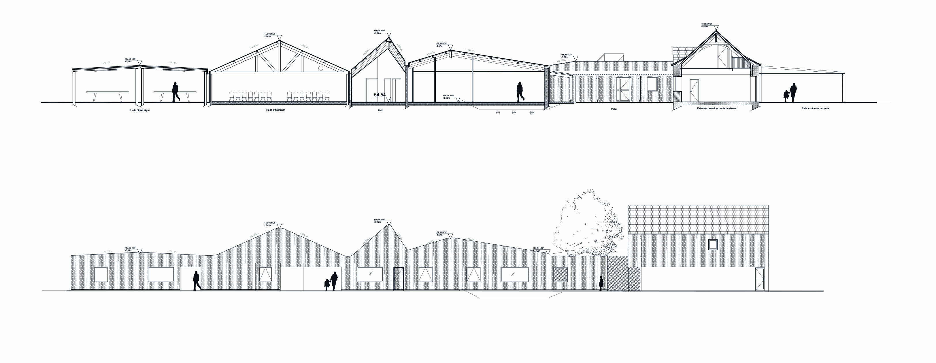Descriptif technique : Pour mieux redonner une cohérence à l’ensemble, la façade d’accueil constitué d’un bardage bois à clairevoies asymétriques, vient englober l’ensemble des bâtiments (anciens et nouveaux). Celle-ci est percée par de grands ouvrants qui sont tantôt des fenêtres en lien avec le bâti, tantôt des grands cadrages dans une clôture ajourée qui joue le role de filter visuel. PEFC (Gestion forestière durable)